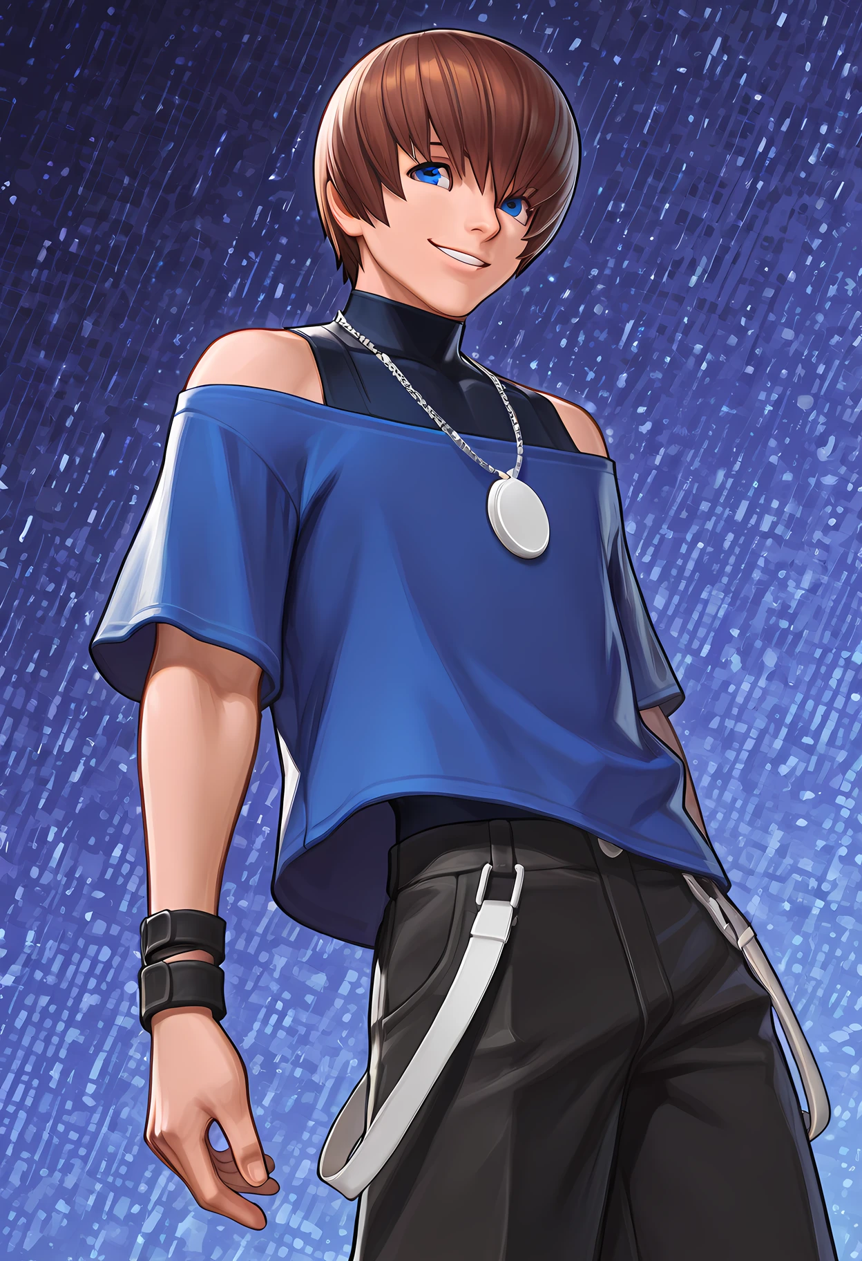 kof_chrisxv, brown hair, blue eyes, short hair, blue shirt, bare shoulder, black turtleneck, short sleeves, black pants