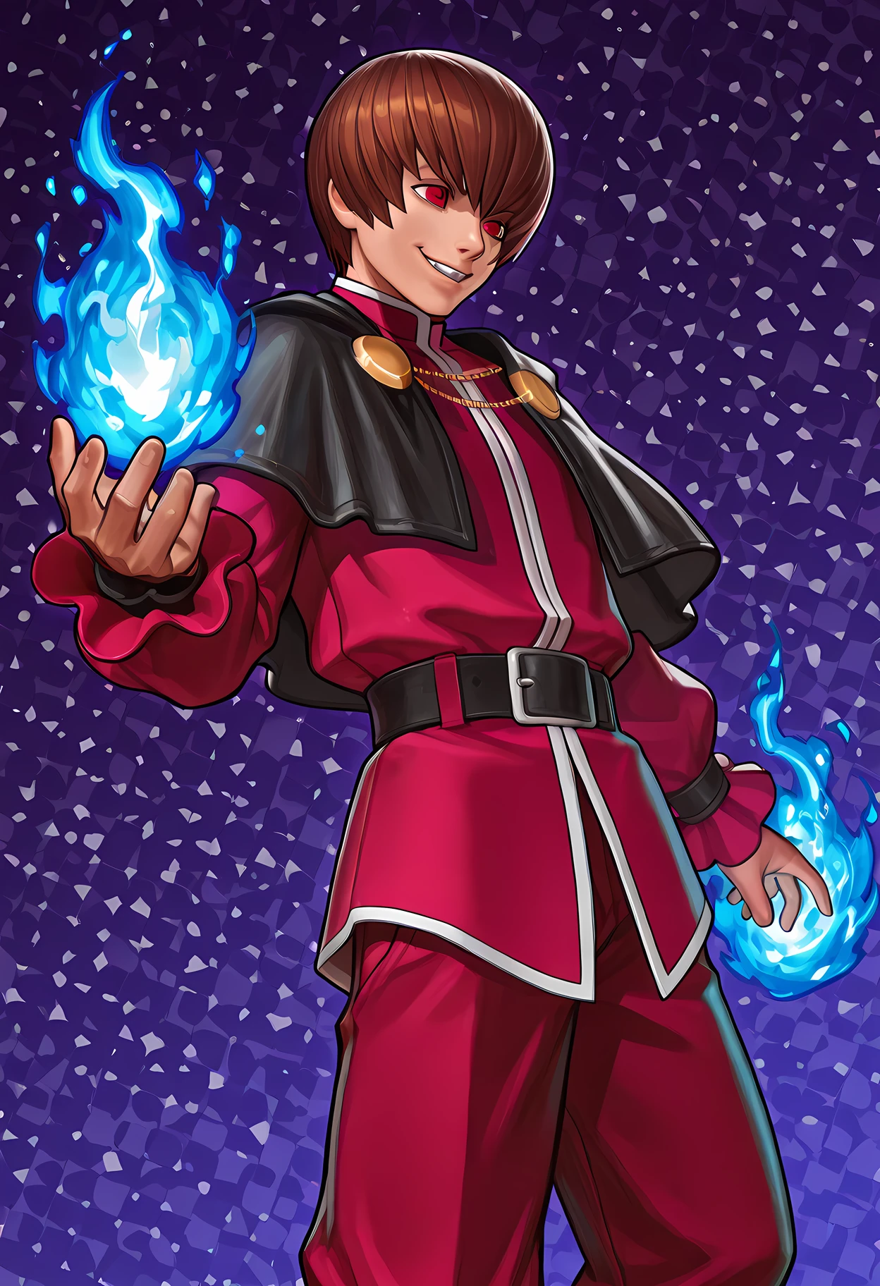kof_ochris, brown hair, short hair, red eyes, capelet, red shirt, red pants, boots, pyrokinesis, blue flame