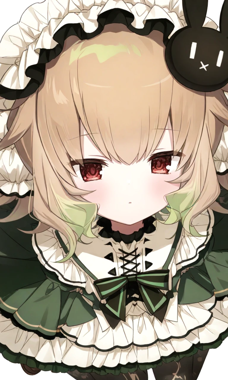 green and white dress, yellow ribbon, dress, rabbit hair ornament, virtual youtuber,subtle clock and arrow patterns pantyhose,black pantyhose, brown footwear, red eyes, green dress, headband