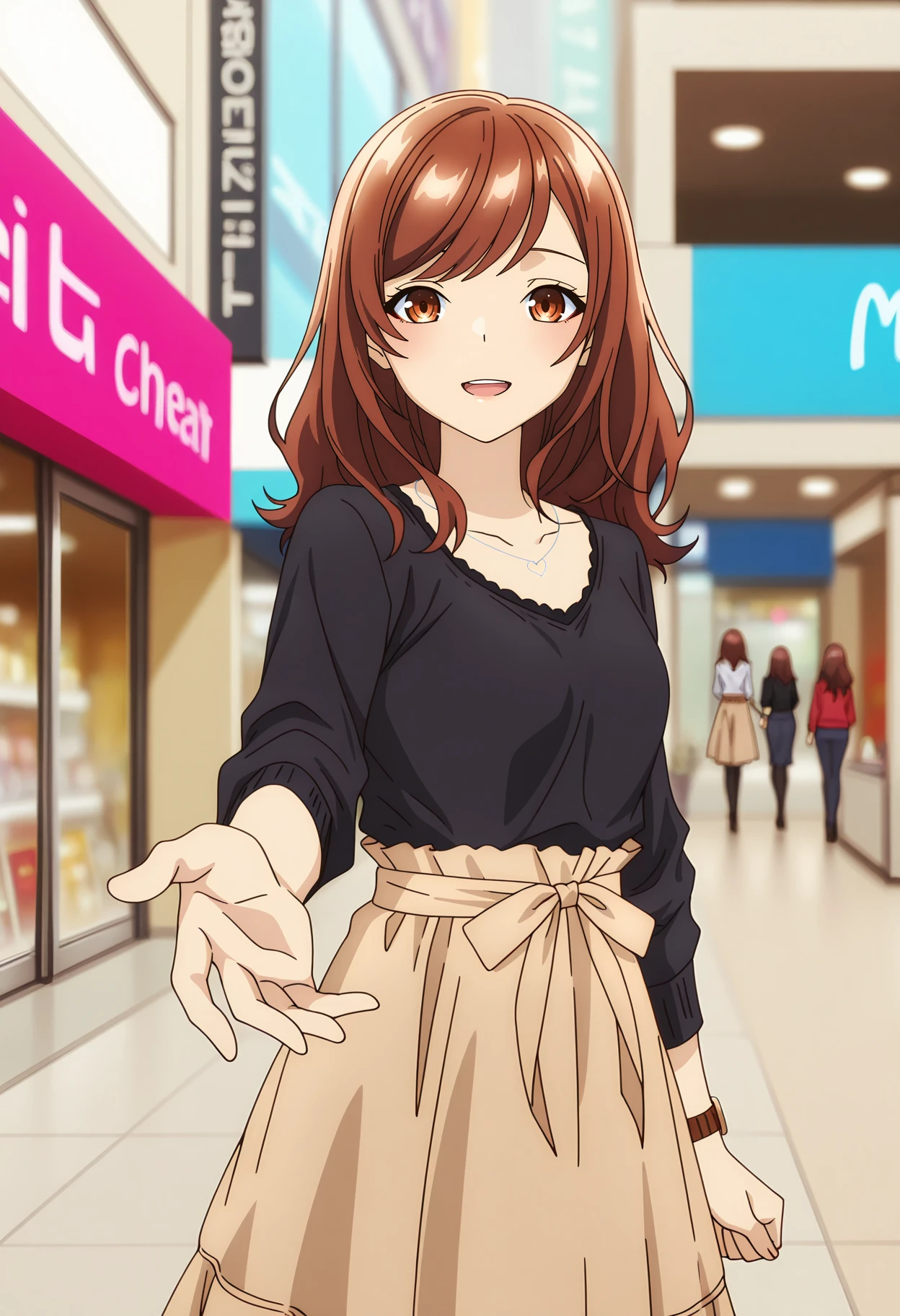 heart necklace, black shirt, long sleeves, wristwatch, high-waist skirt, light brown bow, medium skirt, light brown skirt