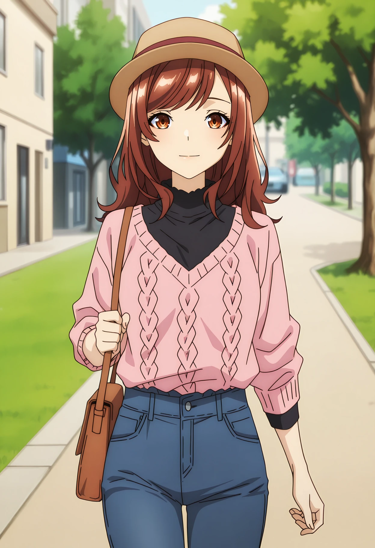 hat, brown headwear, aran sweater, pink sweater, turtleneck, collared shirt, black shirt, jeans, denim, shoulder bag