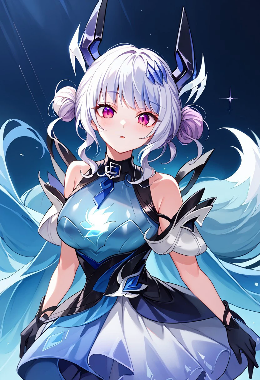 score_9, score_8_up, score_7_up, liliana _wave, 1girl, white hair, purple eyes, thighhighs, gloves, dress, black thighhighs, blue dress, hair ornament, bare shoulders, sleeveless, fox ears, multicolor hair, hair bun, bang, horn