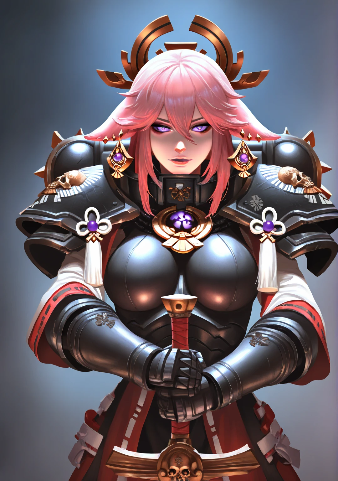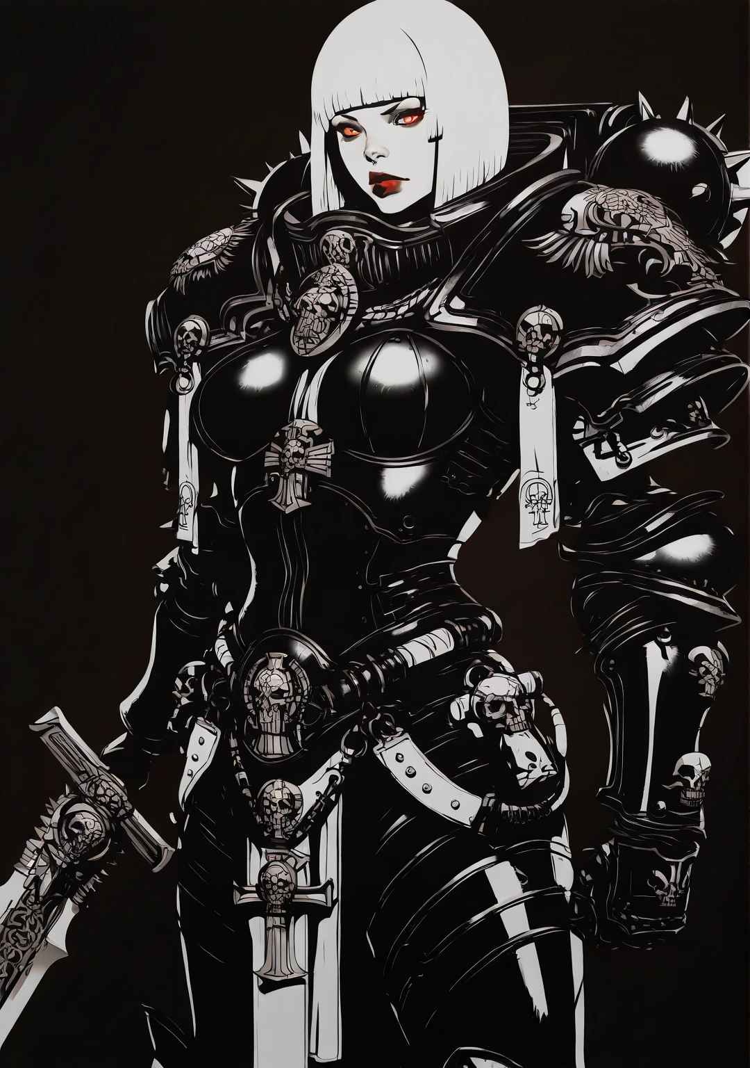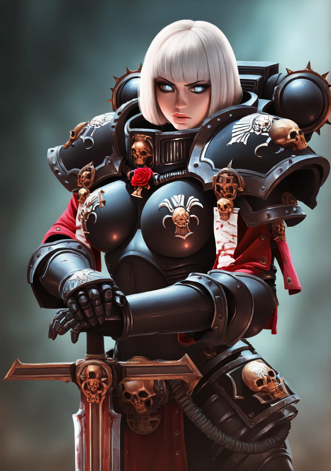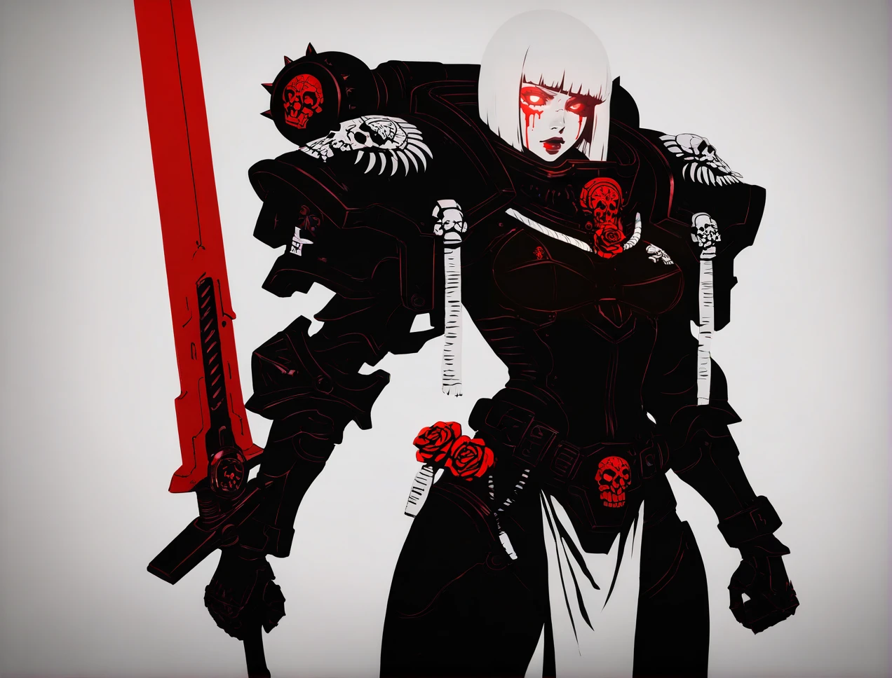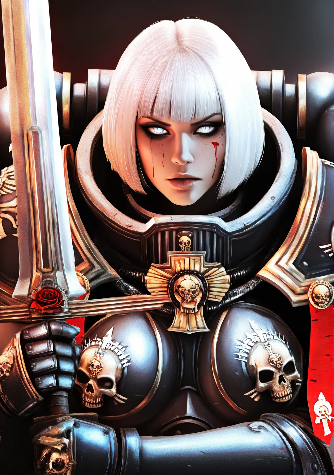 edgAdepta, 1girl, solo, weapon, one handed sword, lips, blood, rose, gauntlets, skull ,wearing edgAdepta,power armor,pauldrons,skull emblem,