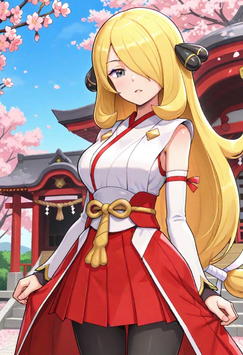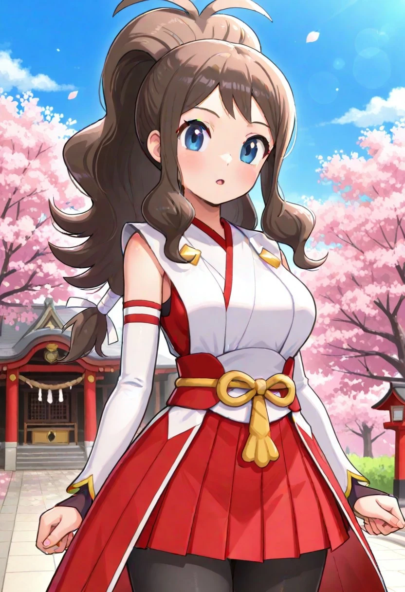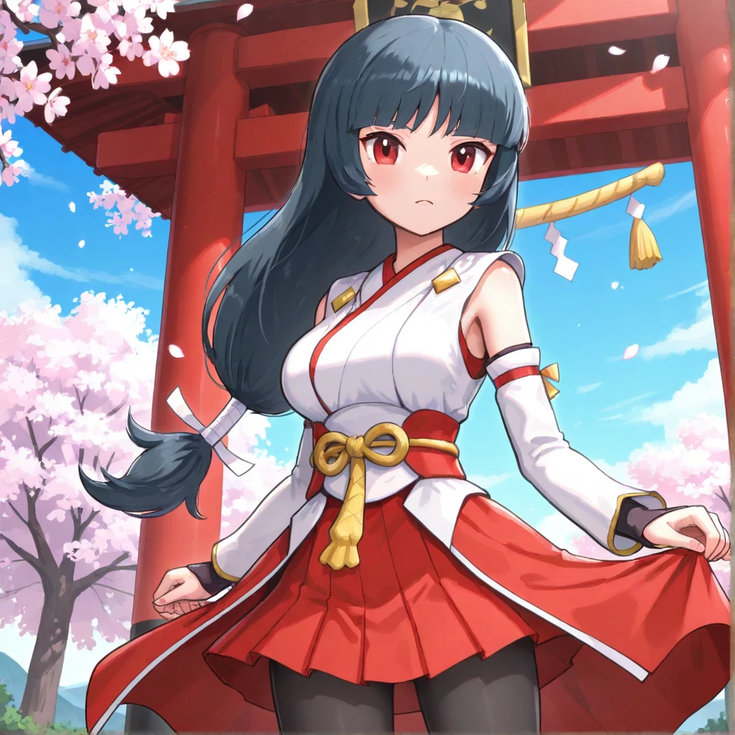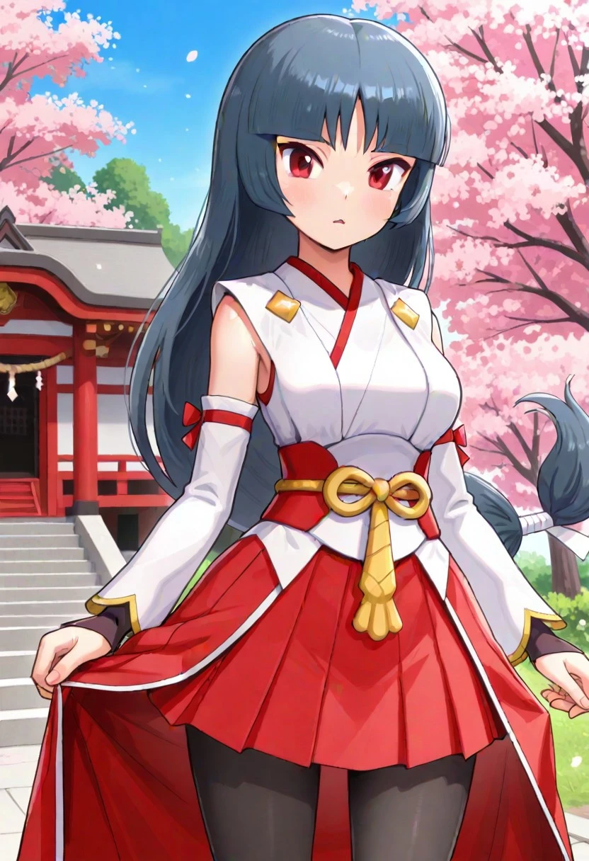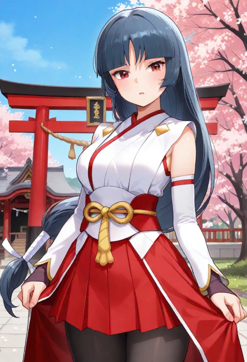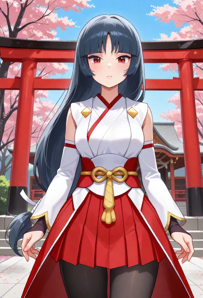 miko, japanese clothes, two-tone dress, white dress, red dress, showgirl skirt, detached sleeves, long sleeves, hakama short skirt, pleated skirt, red skirt, black pantyhose, ankle boots, black footwear