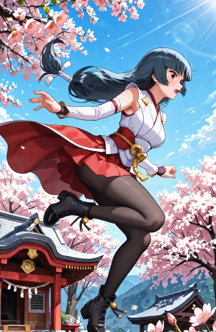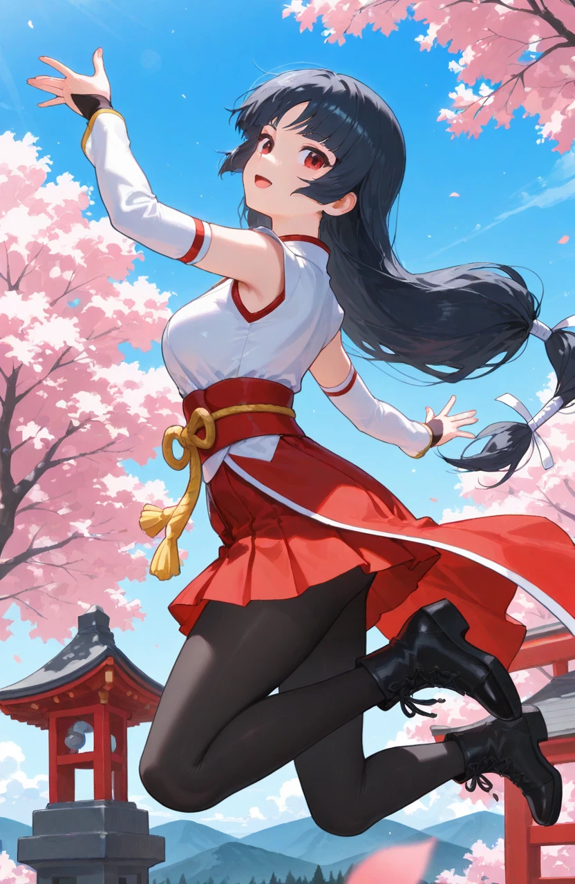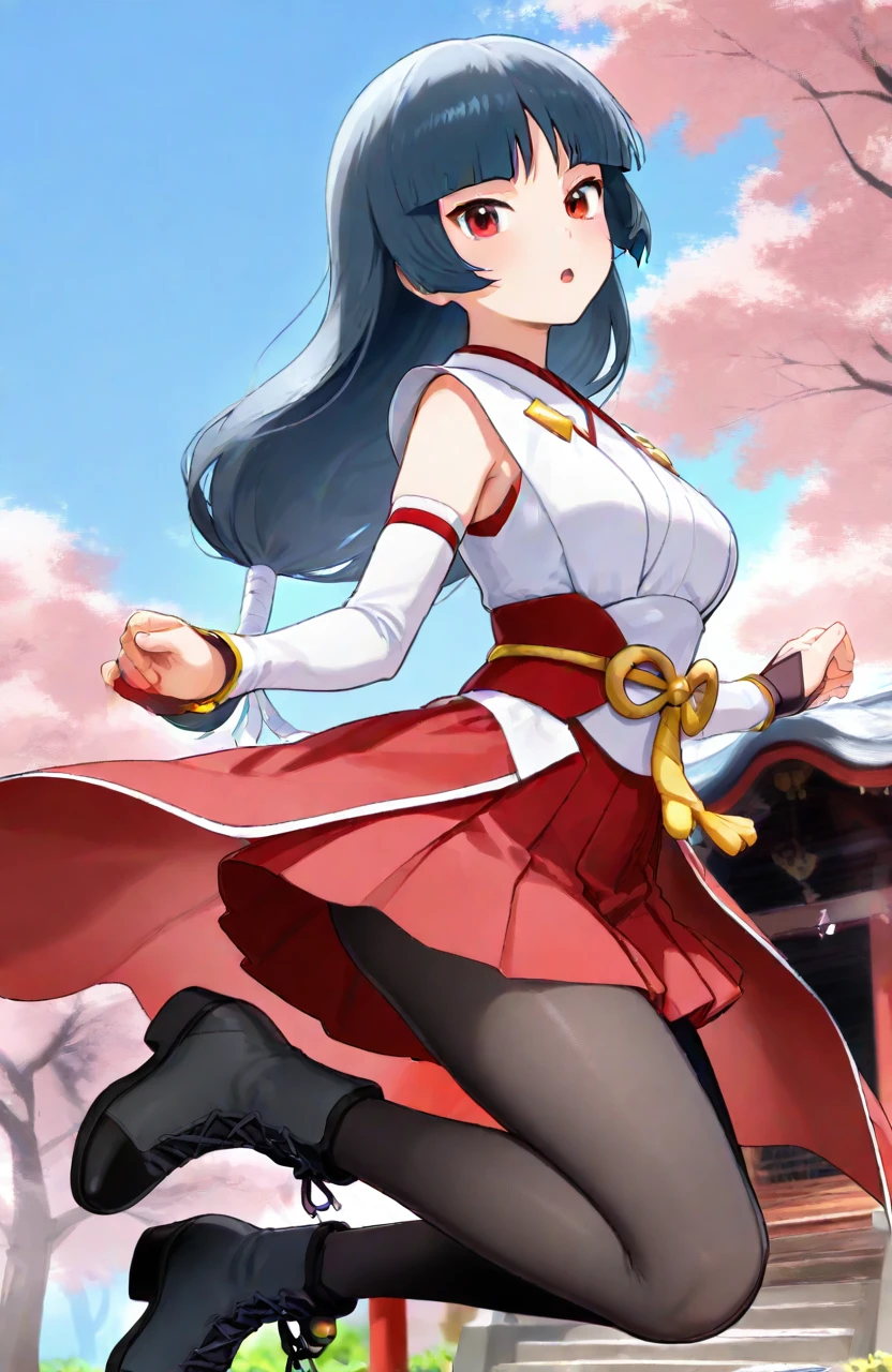 miko, japanese clothes, two-tone dress, white dress, red dress, overskirt, detached sleeves, long sleeves, hakama short skirt, pleated skirt, red skirt, black pantyhose, ankle boots, black footwear