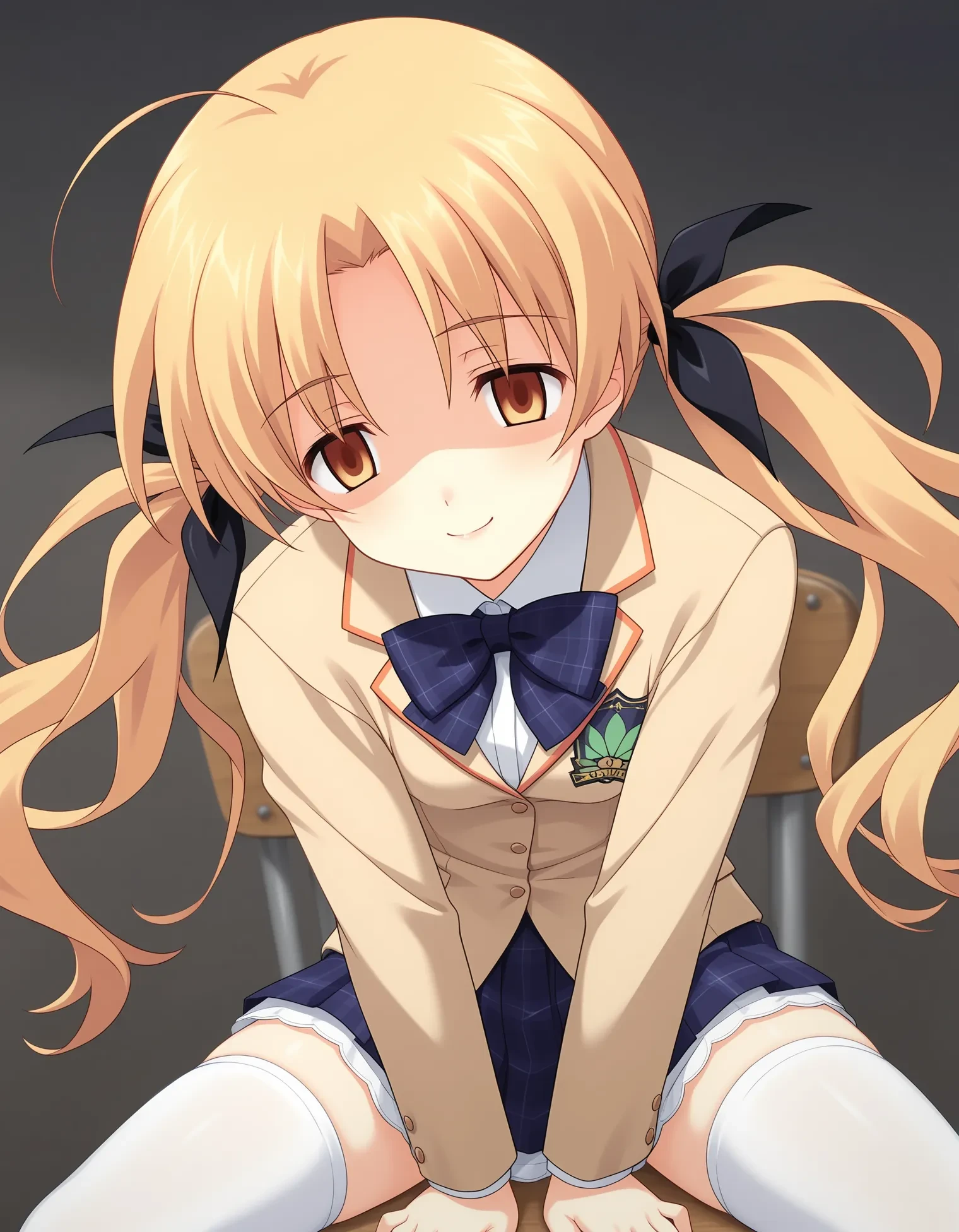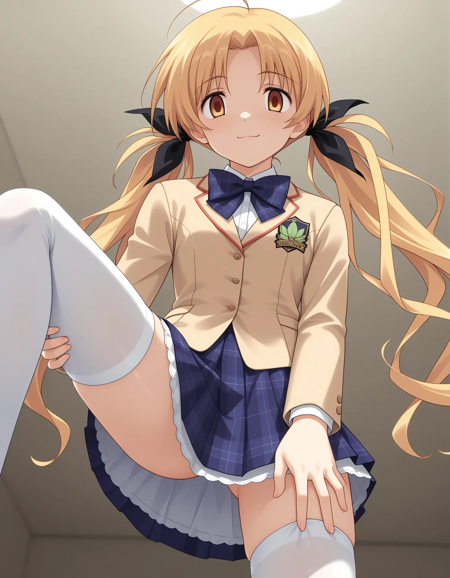 orihara kozue,chaos;head,blonde hair,long hair,twintails,hair ribbon,parted bangs,yellow eyes,flat chest