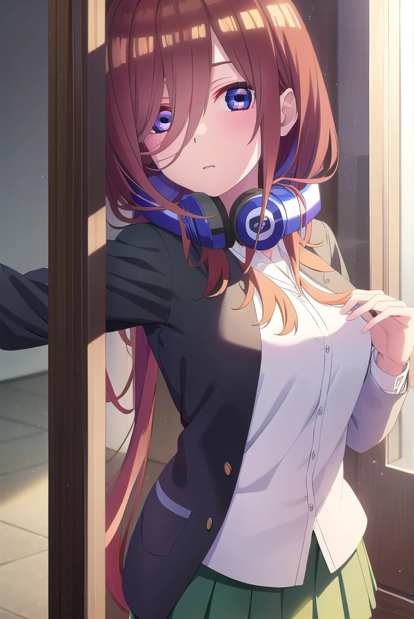 miku nakano, long hair, bangs, blue eyes, brown hair, hair between eyes, headphones, headphones around neck,