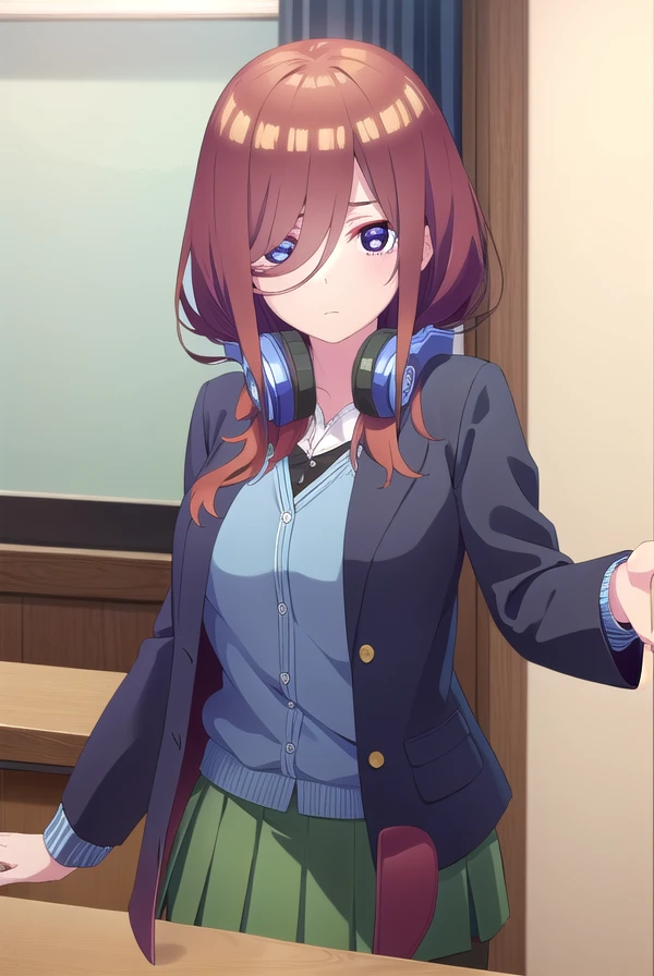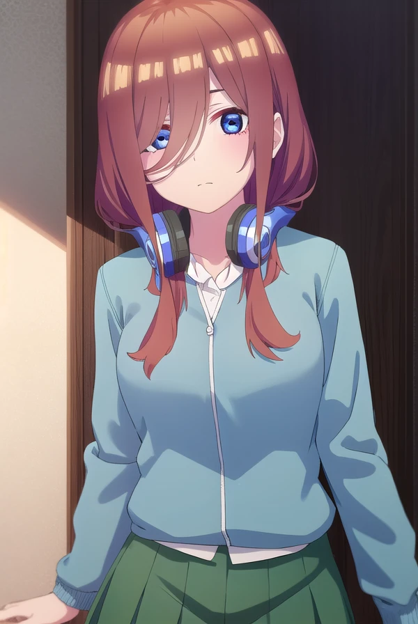 miku nakano, long hair, bangs, blue eyes, brown hair, shirt, hair between eyes, headphones, cardigan, headphones around neck,