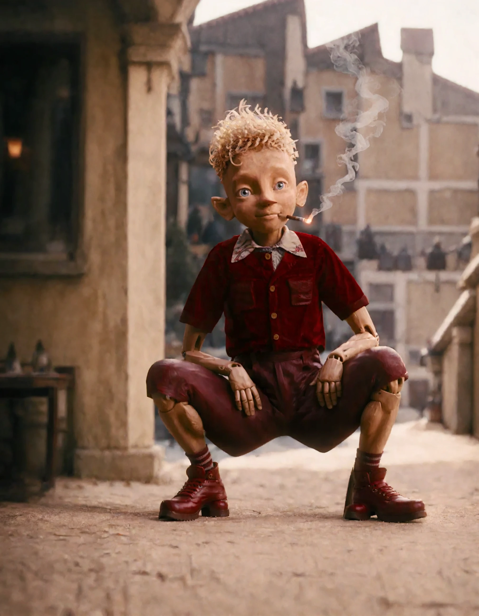 brthnthflm, thwdnbybrtno, shavings hair, pointy nose, blue eyes, red polo, white shirt under polo, doll joints