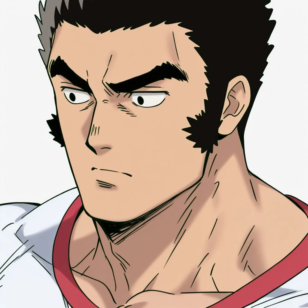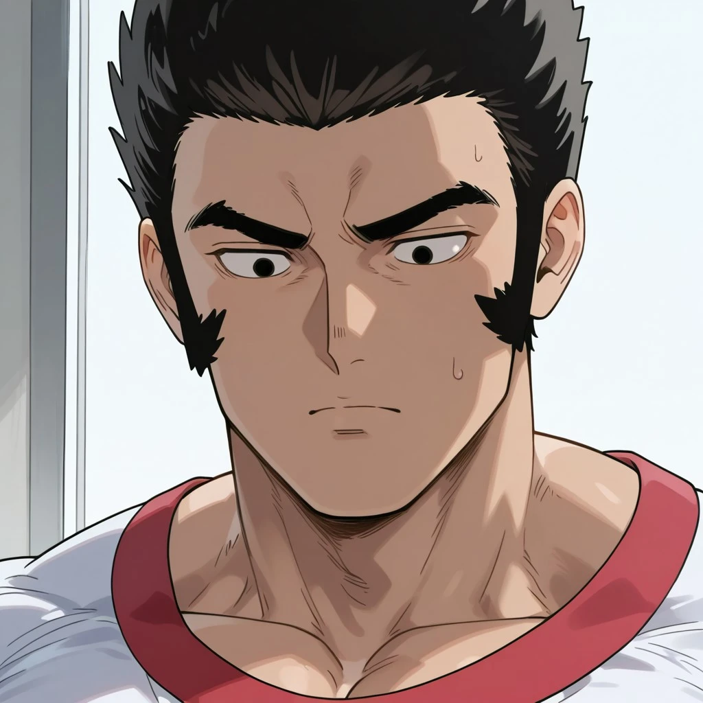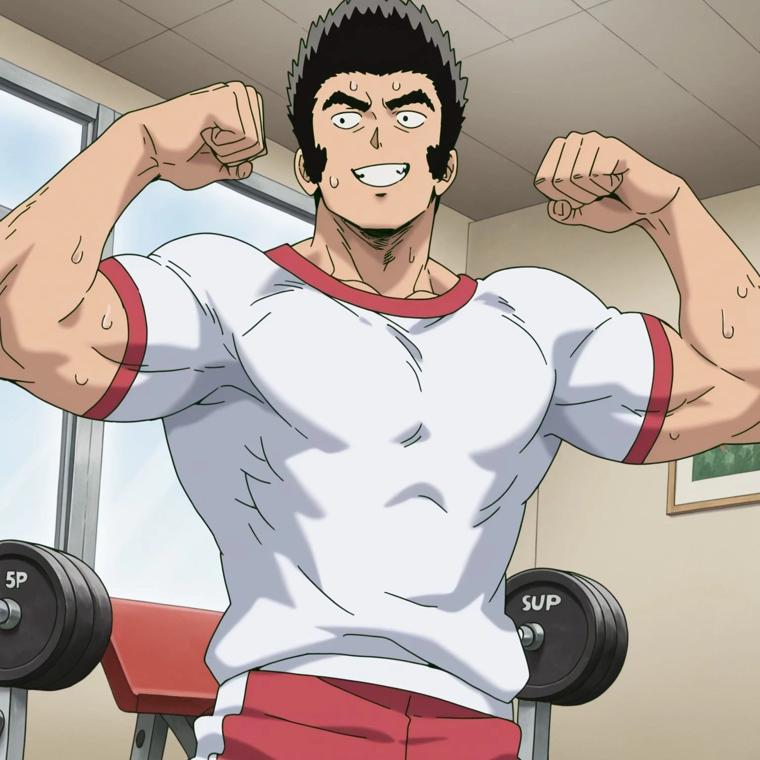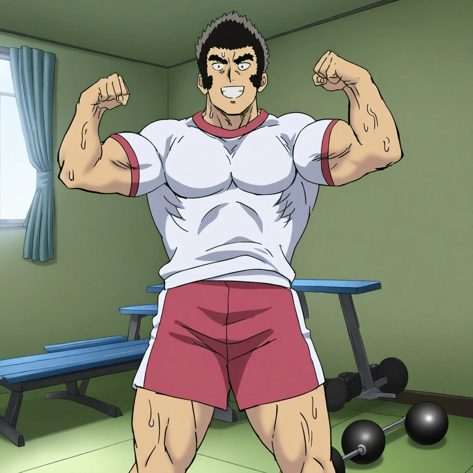 Musashi, solo, male focus, tall, muscular, buff physique, pectorals, short spiky black hair, thick eyebrows, black eyes, strong jawline, athletic build, white gym shirt with red trim, red gym shorts with white stripe along the sides, white long socks, white gym shoes