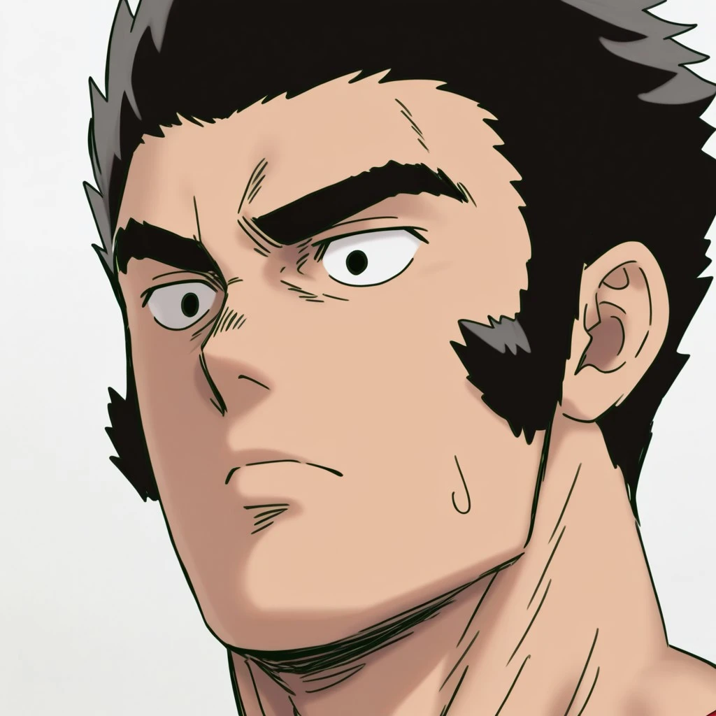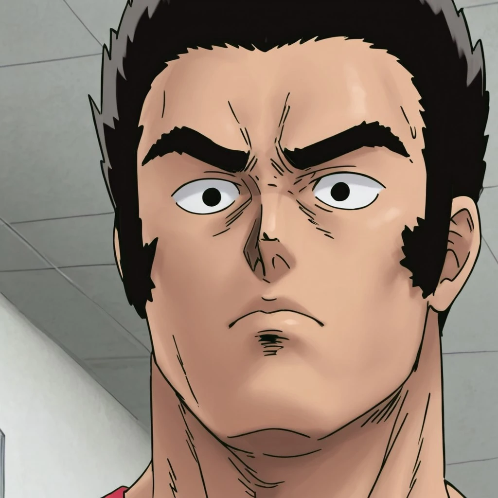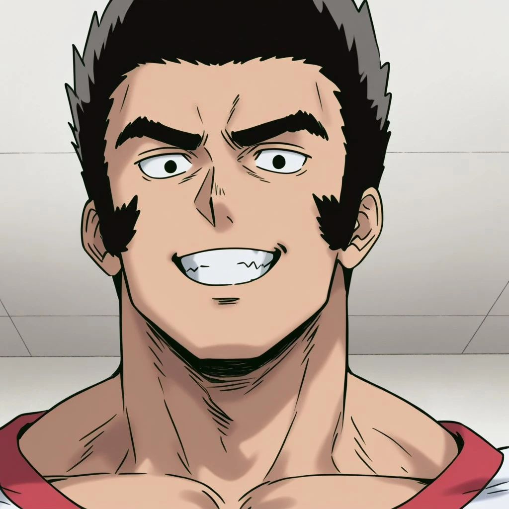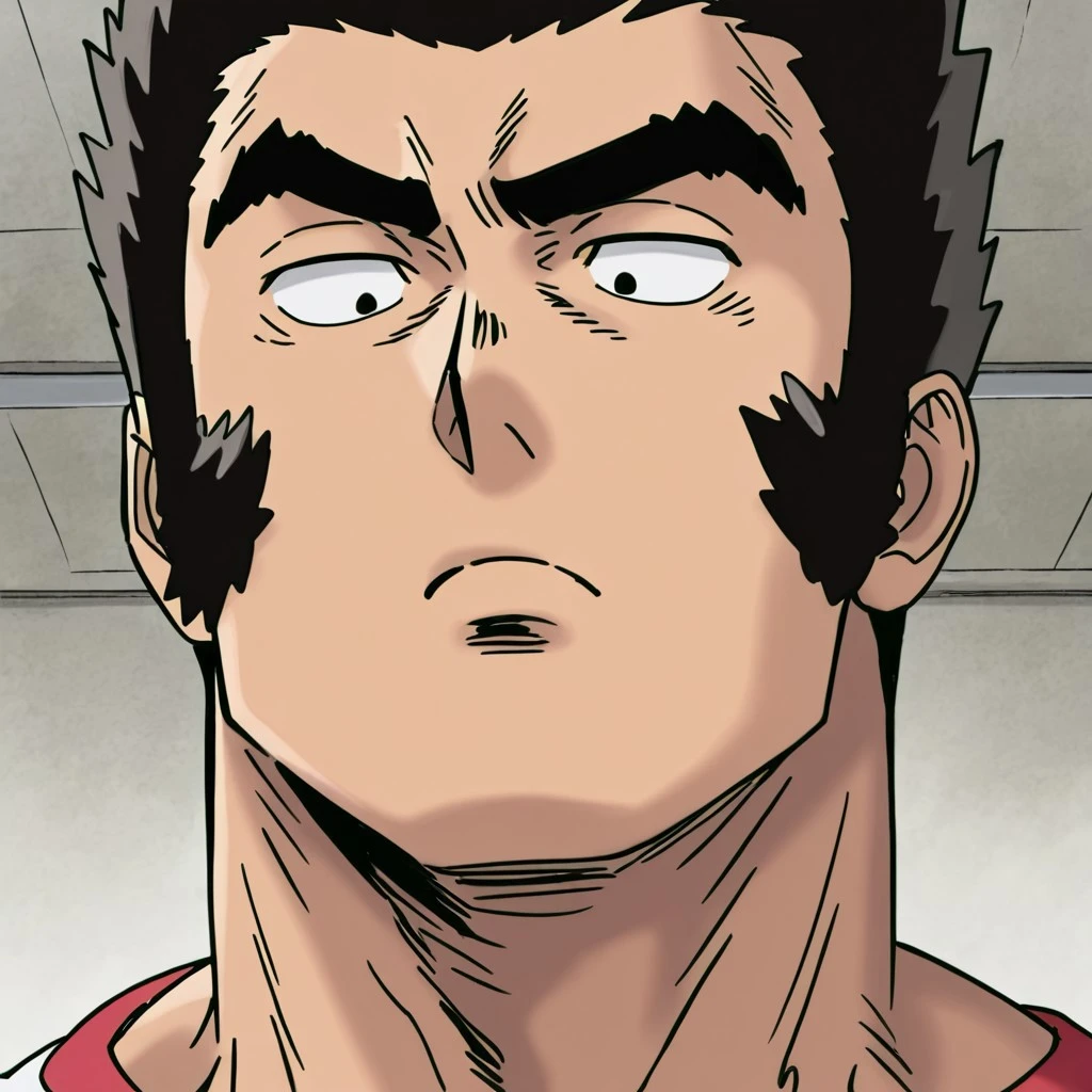Musashi, solo, male focus, tall, muscular, buff physique, pectorals, short spiky black hair, thick eyebrows, black eyes, strong jawline, athletic build, white gym shirt with red trim, red gym shorts with white stripe along the sides, white long socks, white gym shoes
