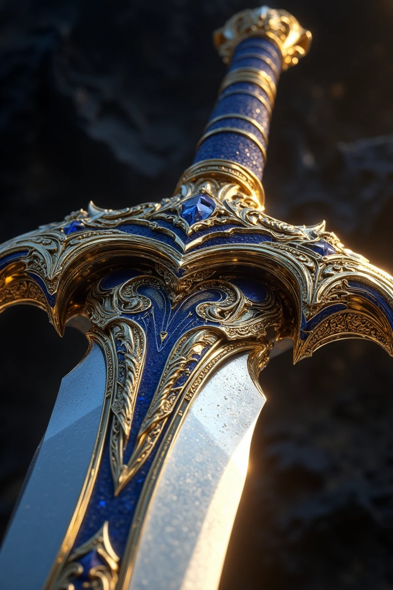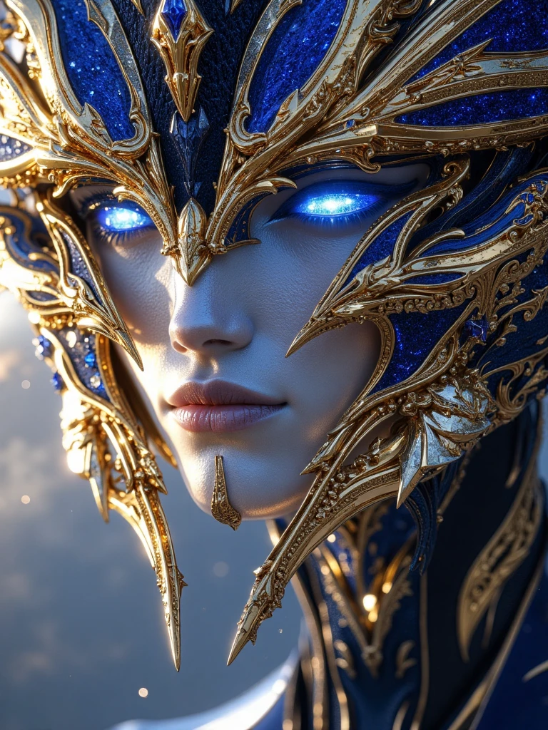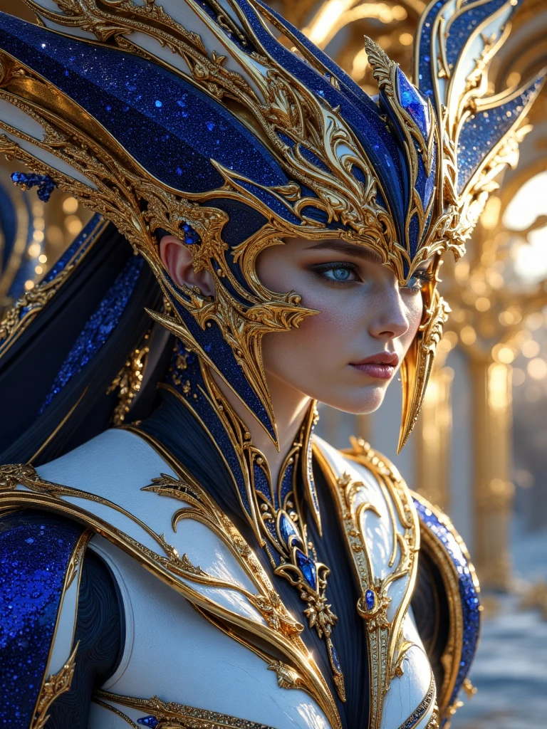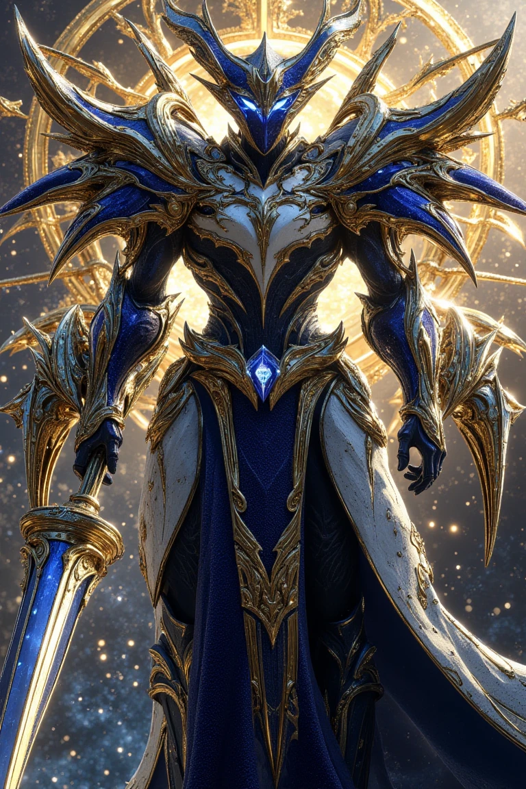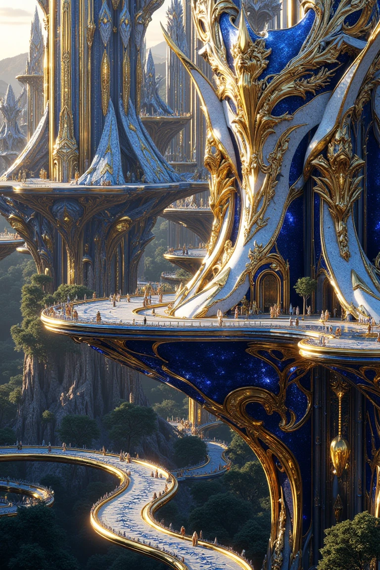 characters, architecture, trees, etc of ornate gold with aggressive cosmic royal blue prominences