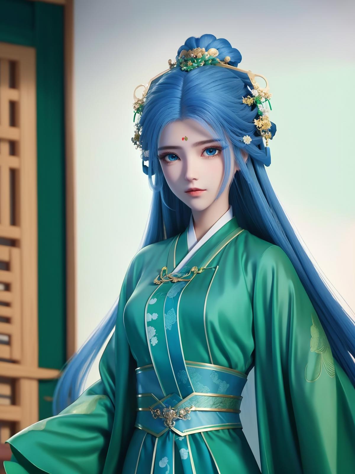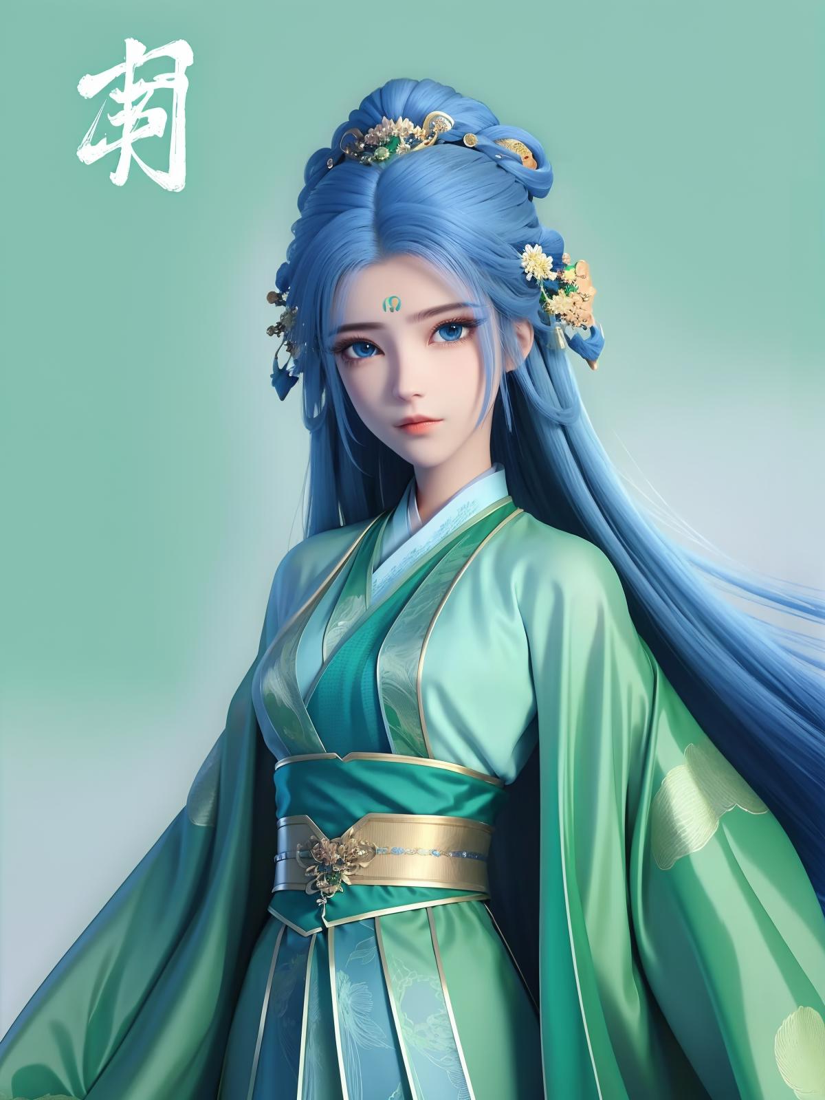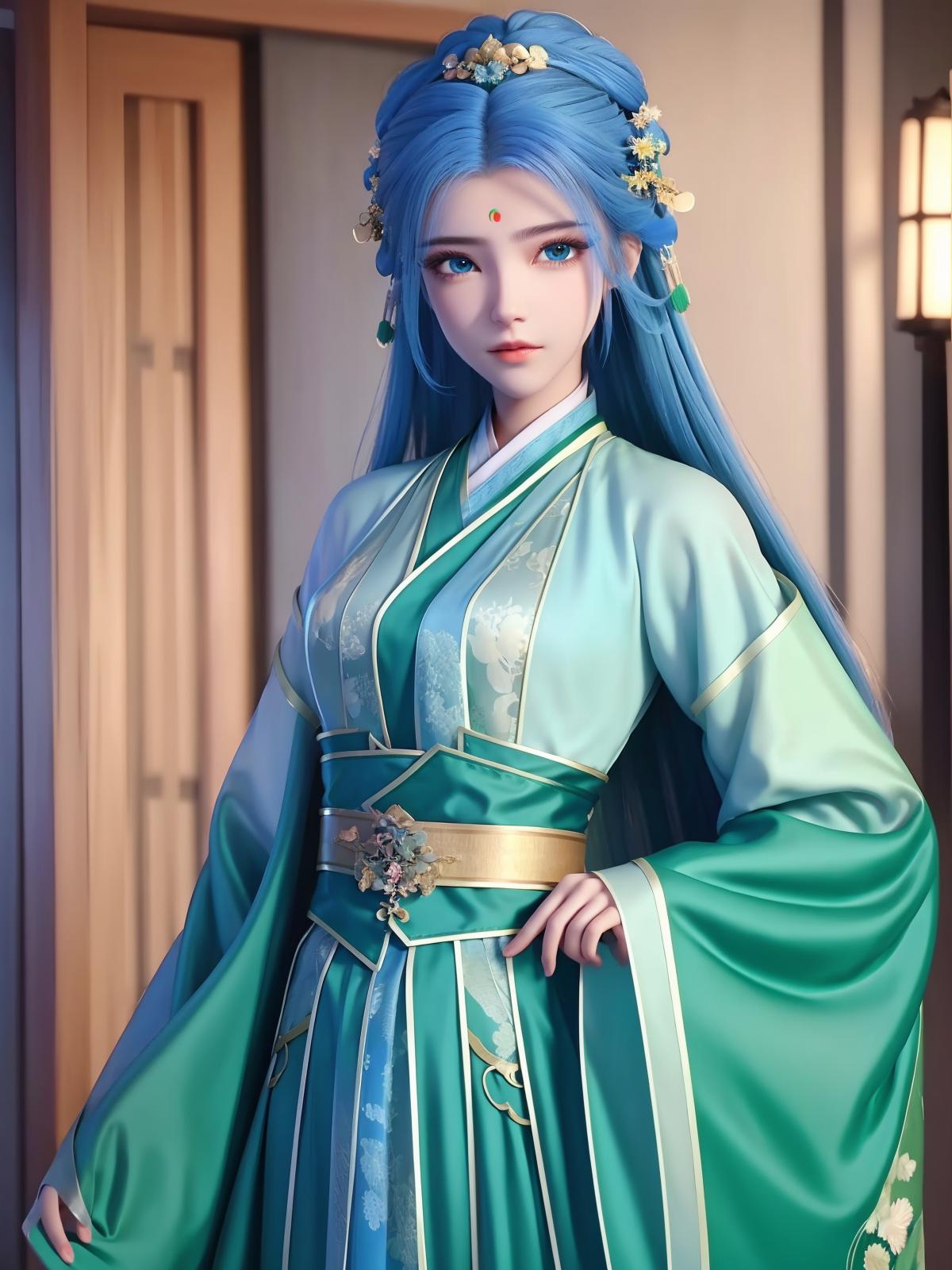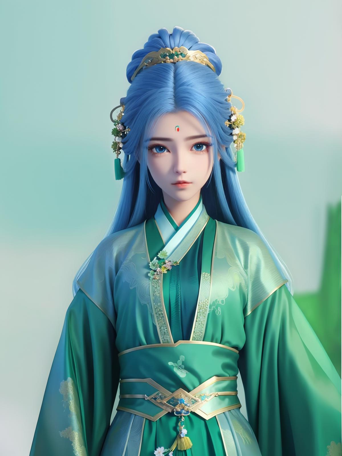 1 girl,hanfu,green chinese clothes, obi,hair ornament, long hair, forehead mark, blue eyes, upper body,
