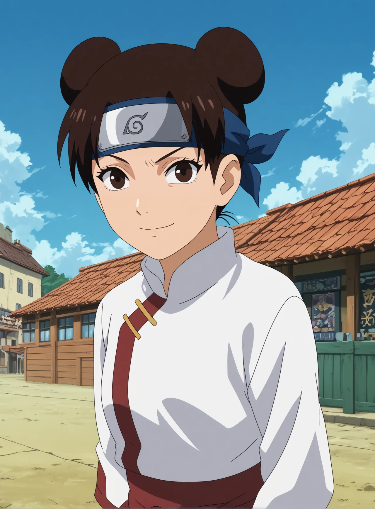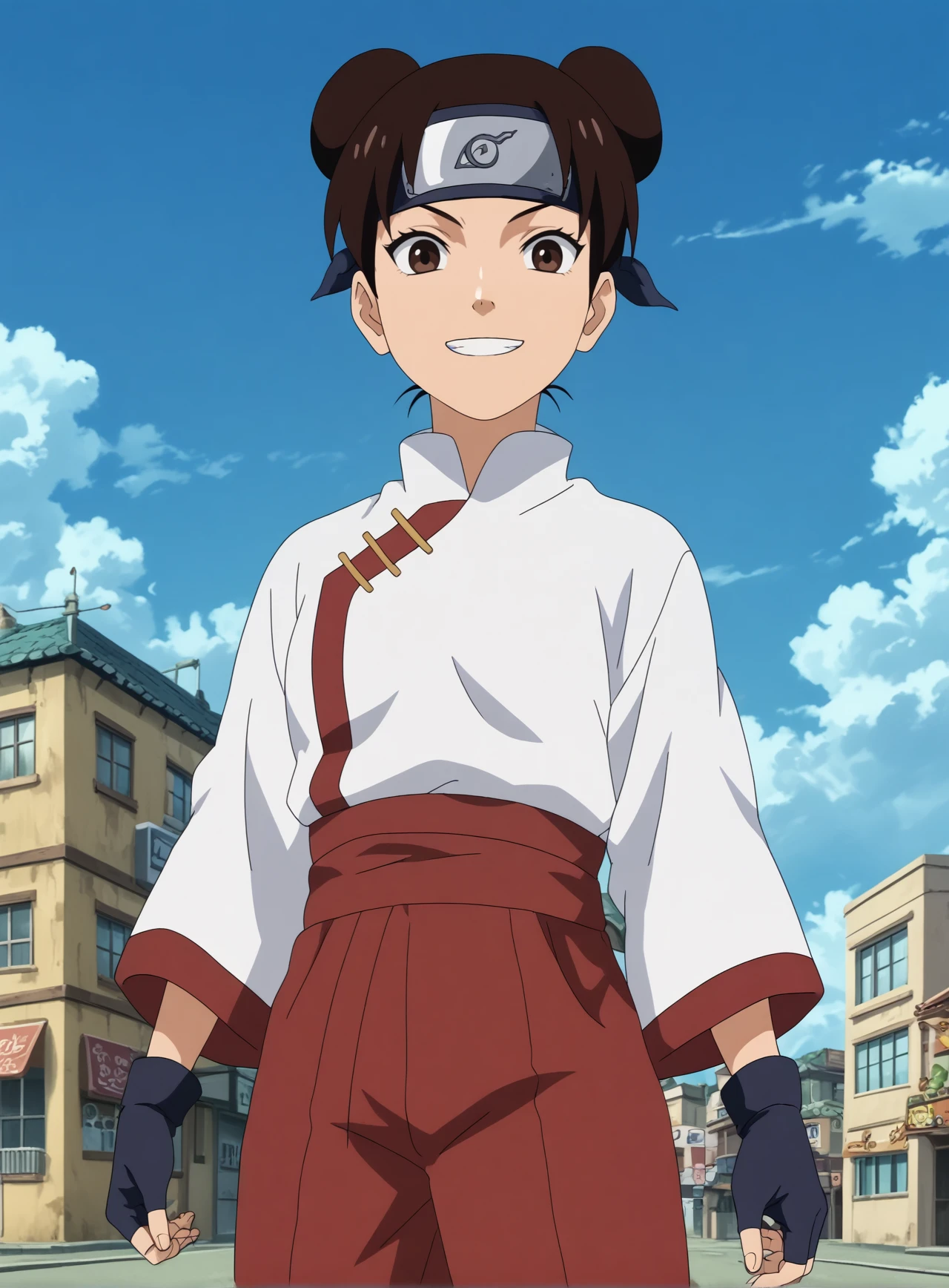 Triggers : tenten,1girl,solo,forehead protector,double bun,hair bun,smile,ninja,konohagakure symbol,short hair,looking at viewer,headband,fingerless_gloves, japanese_clothes