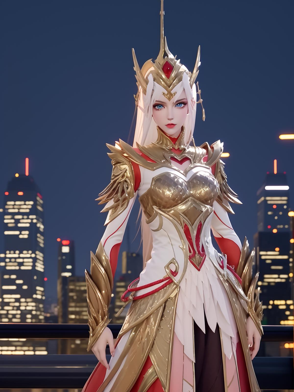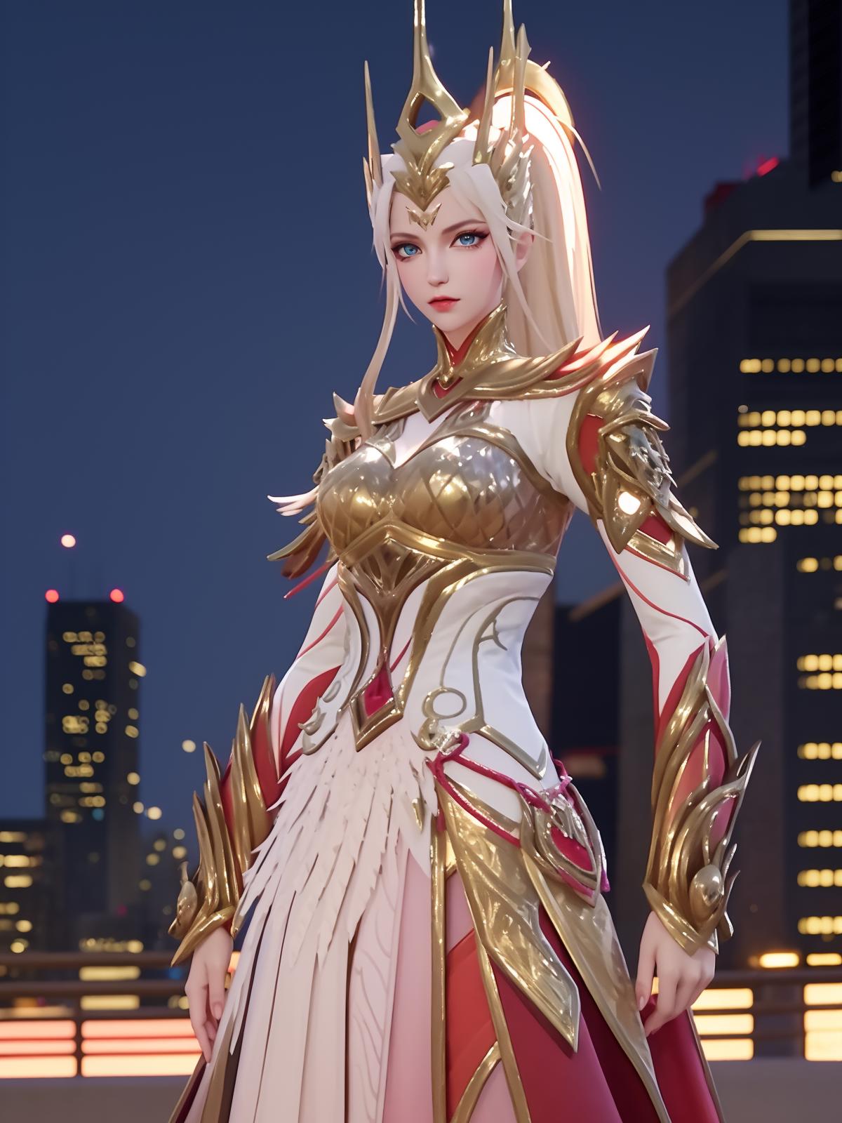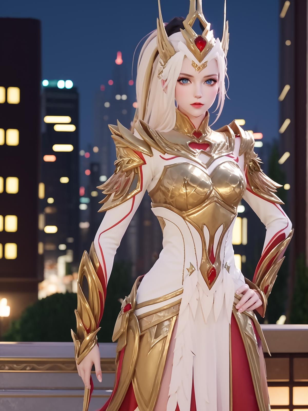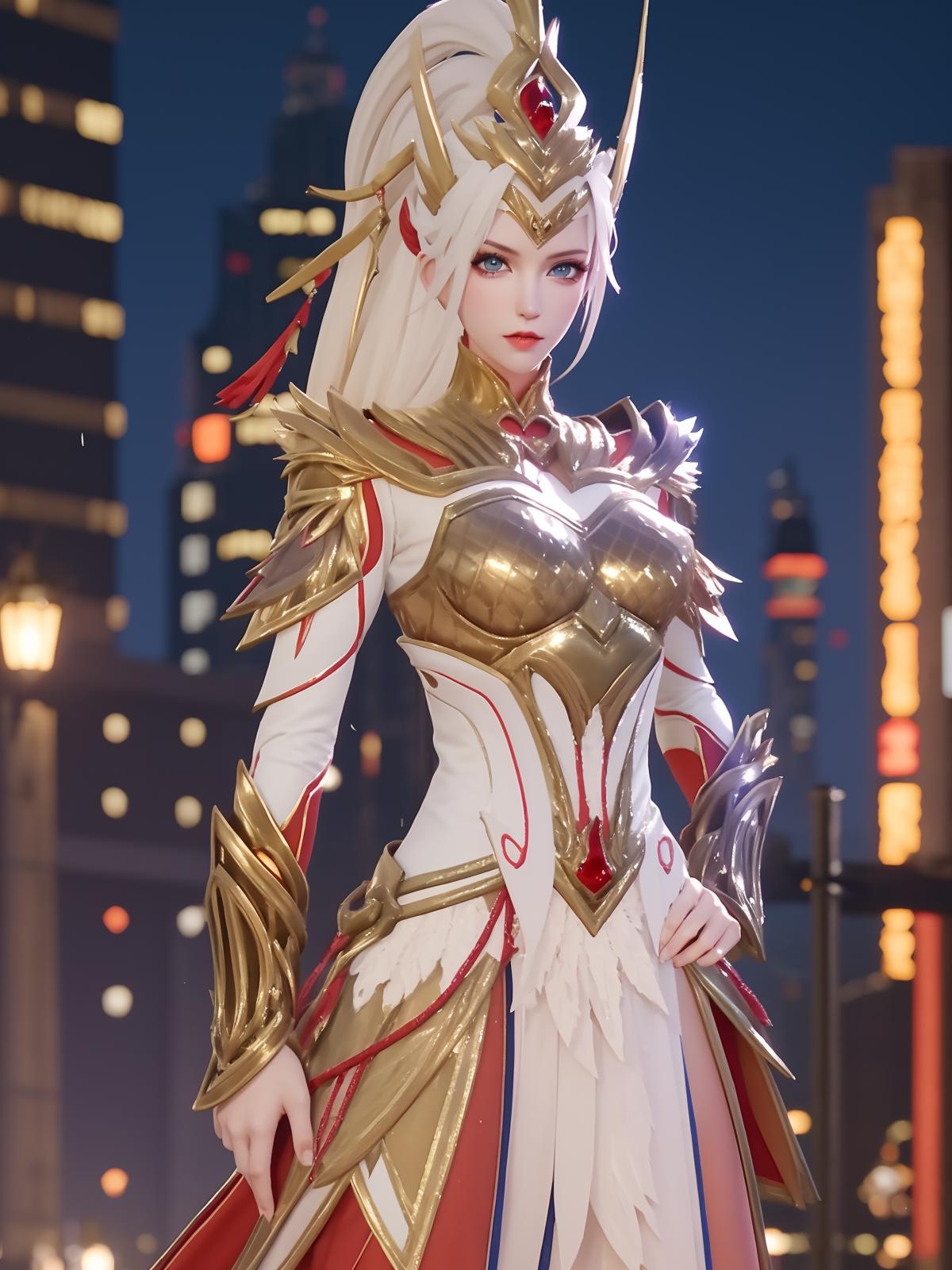 • WZRYhuamulanJXSHzj, 1girl, solo, armor,dress, long hair,blue eyes, hair ornament, high ponytail, cityscape, night, looking at viewer, mature female, hand on hip, cowboy shot,