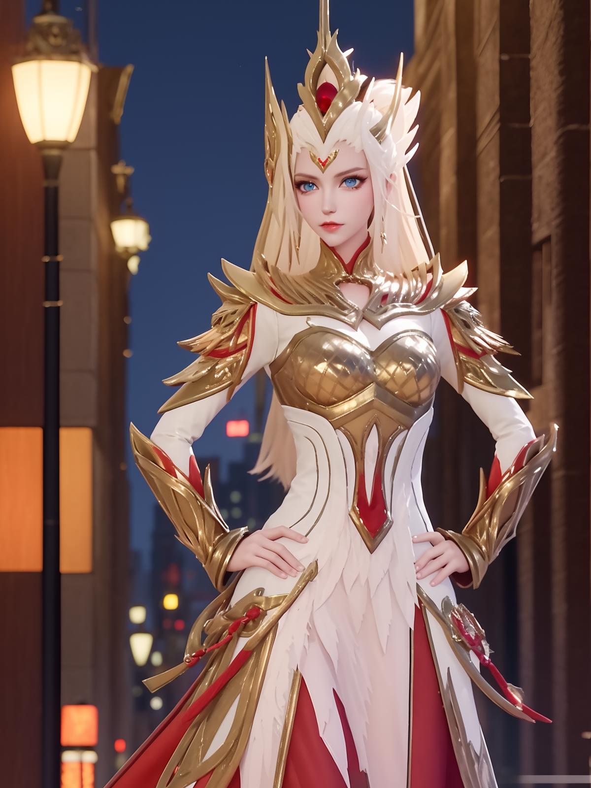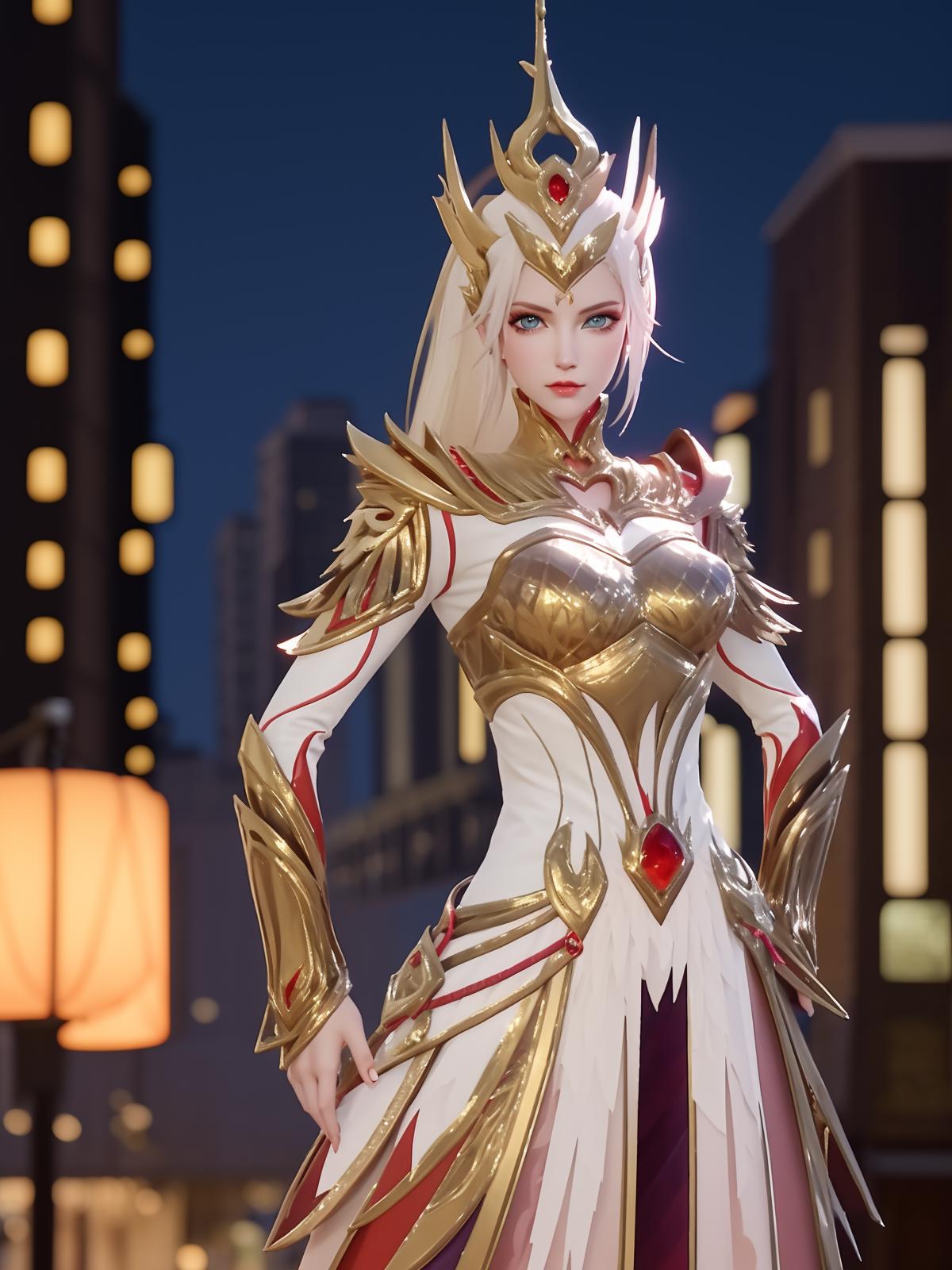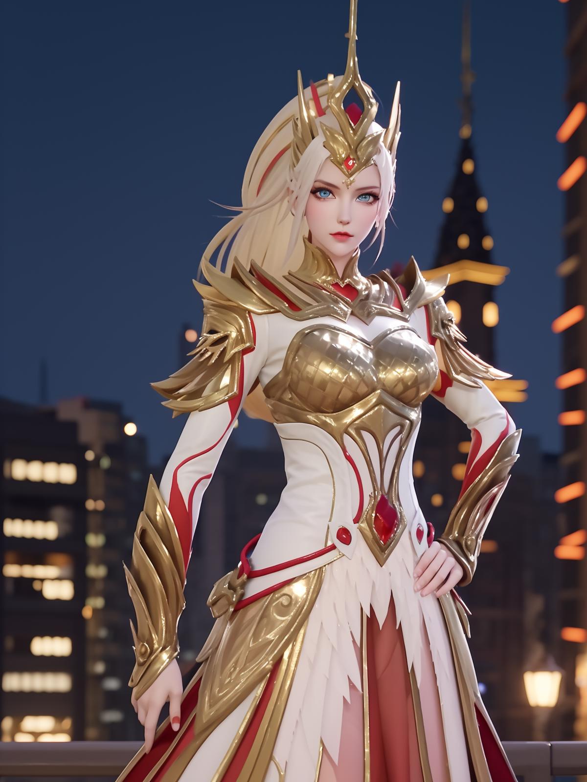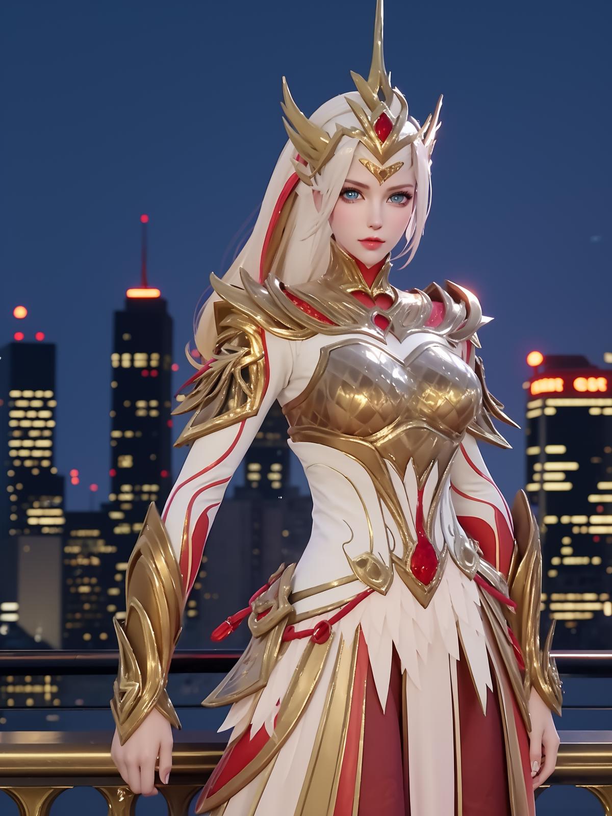• WZRYhuamulanJXSHzj, 1girl, solo, armor,dress, long hair,blue eyes, hair ornament, high ponytail, cityscape, night, looking at viewer, mature female, hand on hip, cowboy shot,