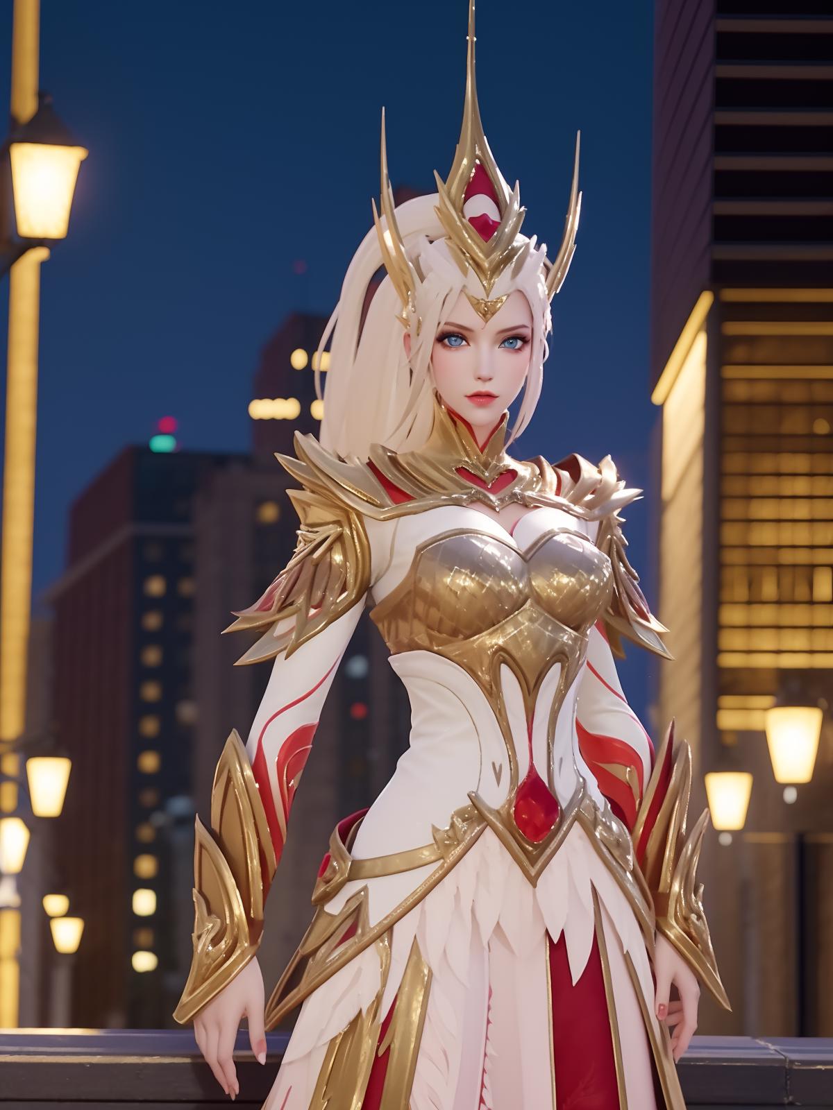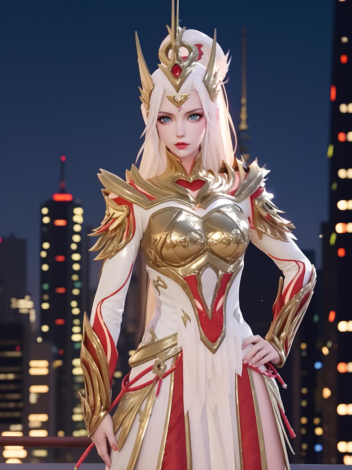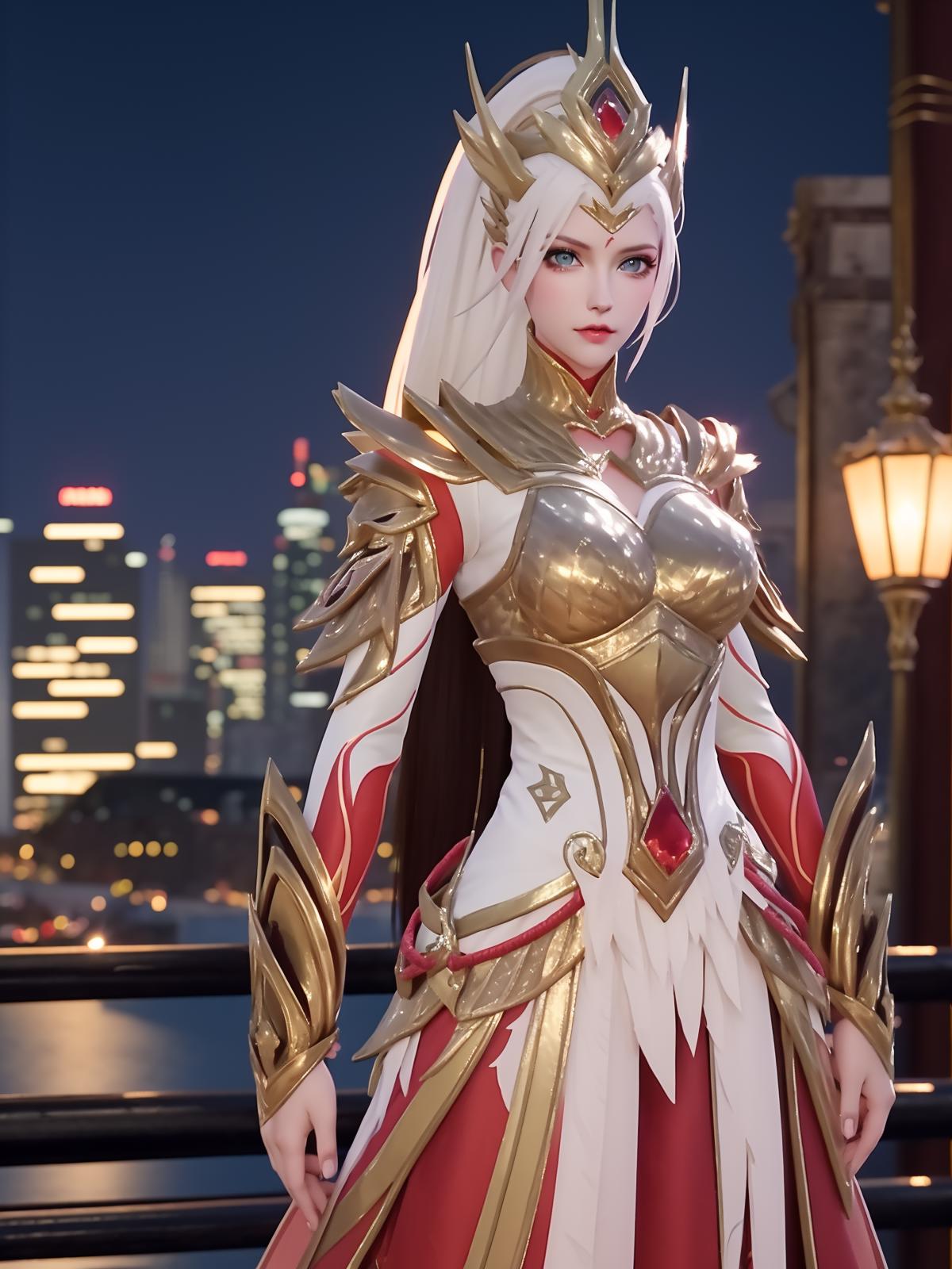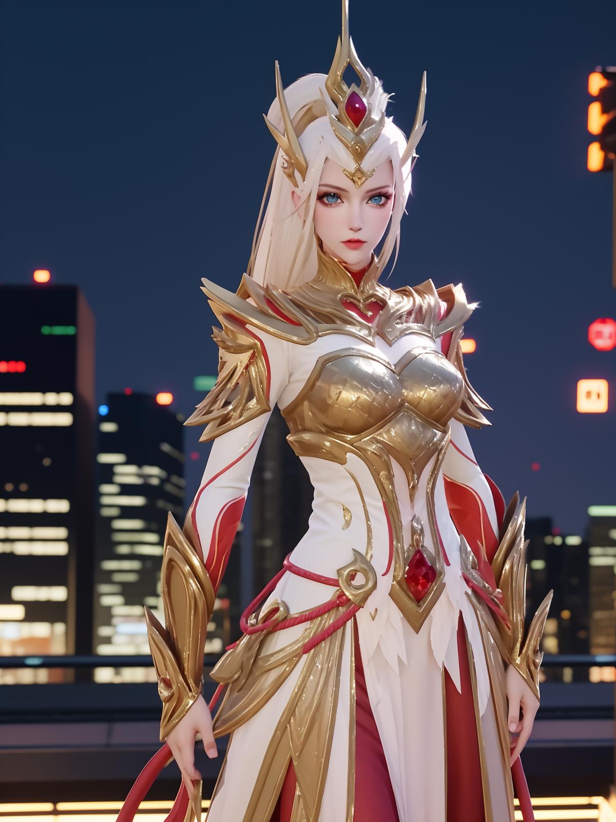 • WZRYhuamulanJXSHzj, 1girl, solo, armor,dress, long hair,blue eyes, hair ornament, high ponytail, cityscape, night, looking at viewer, mature female, hand on hip, cowboy shot,