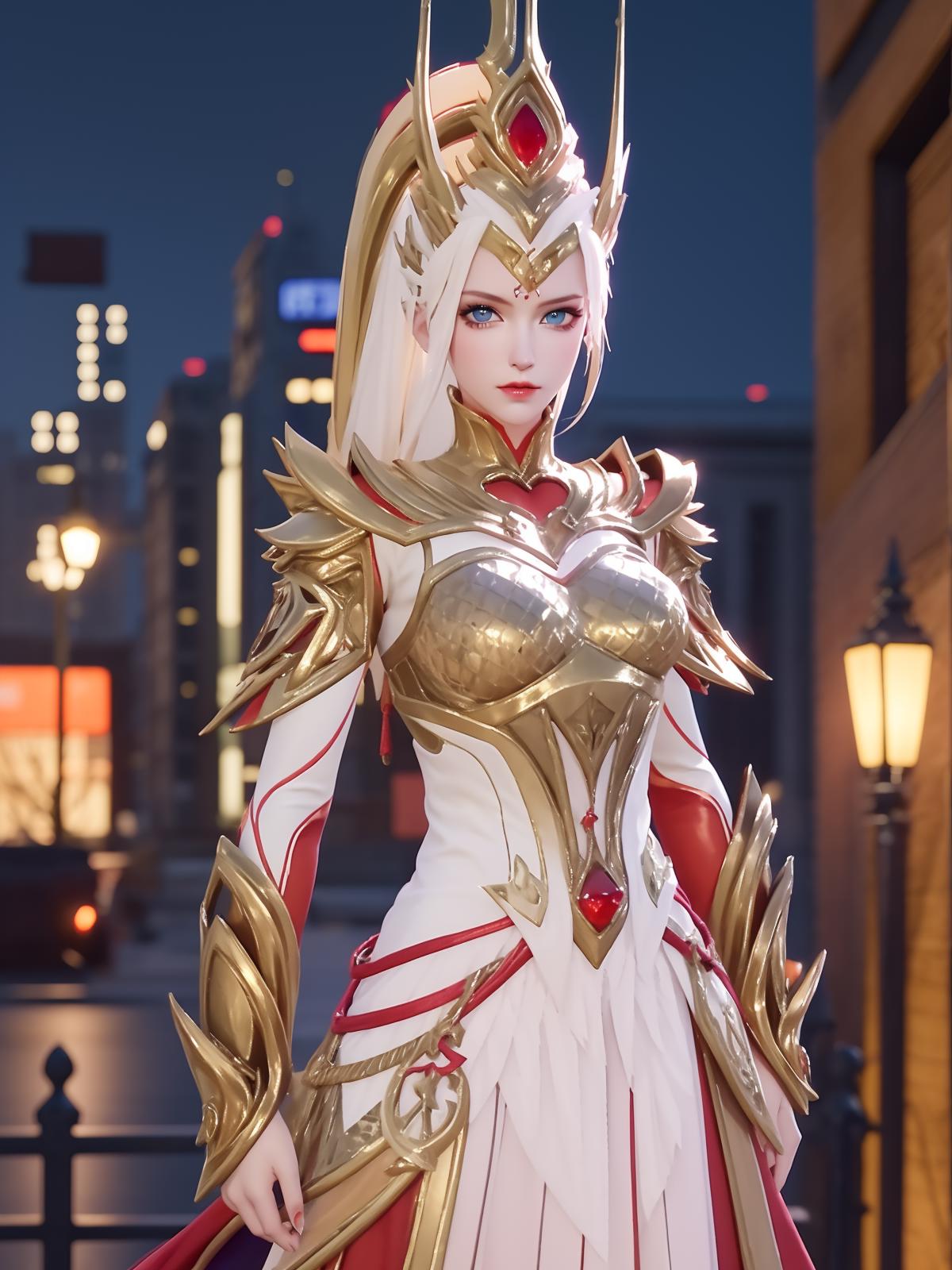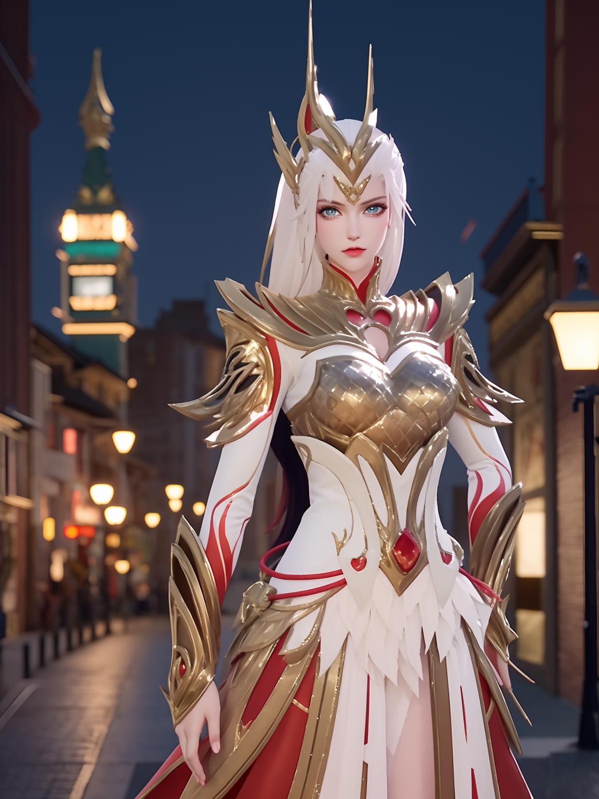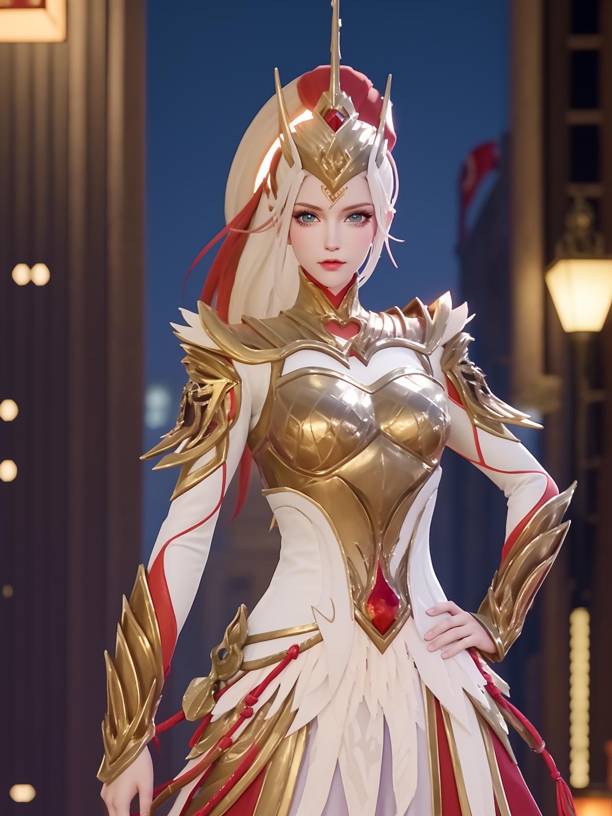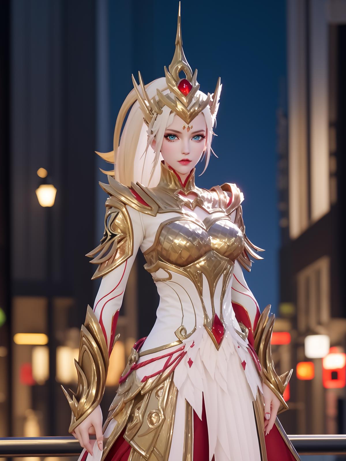 • WZRYhuamulanJXSHzj, 1girl, solo, armor,dress, long hair,blue eyes, hair ornament, high ponytail, cityscape, night, looking at viewer, mature female, hand on hip, cowboy shot,