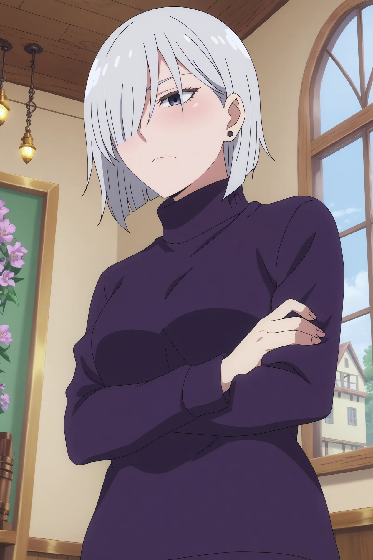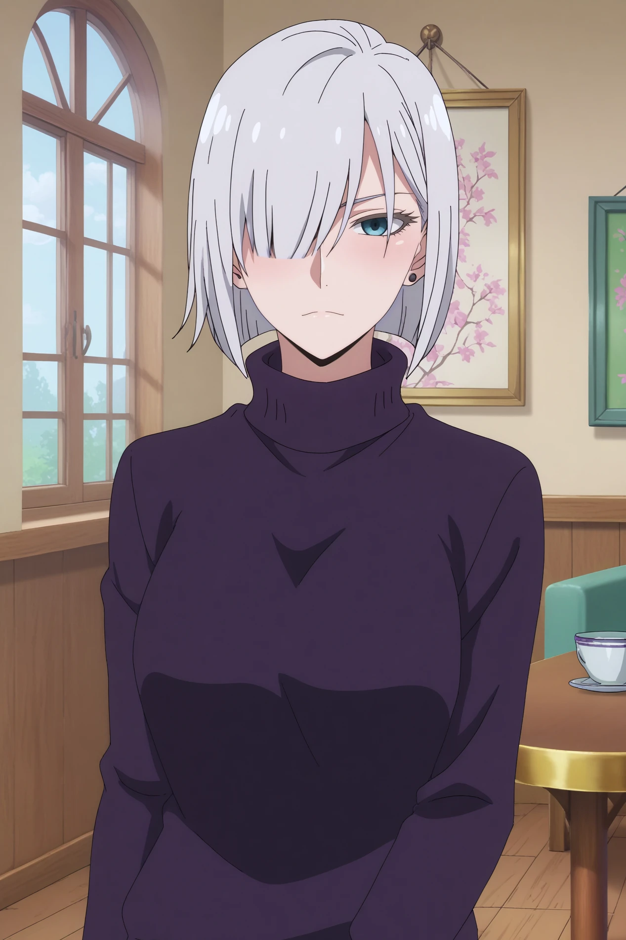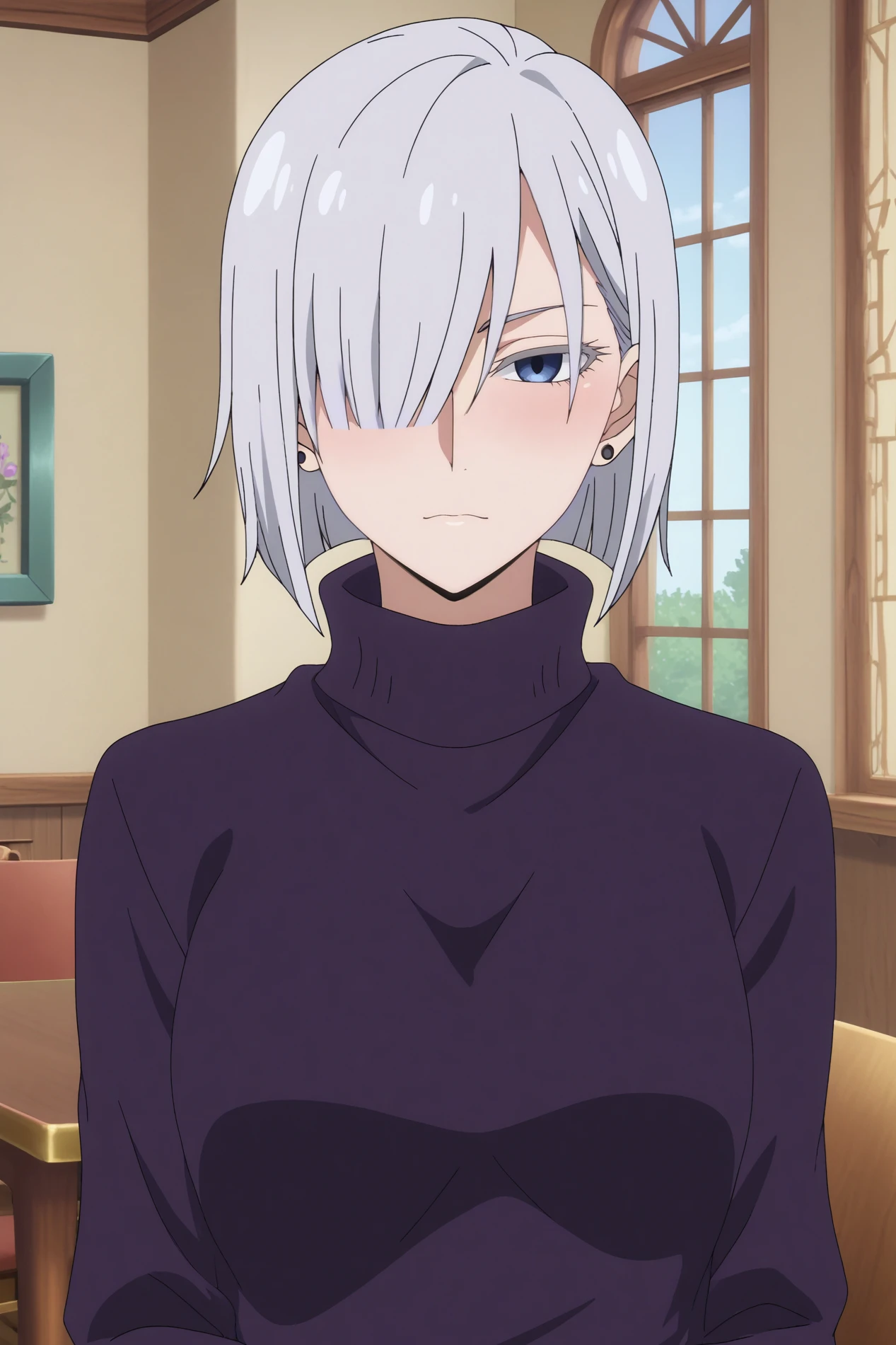 Triggers : fiona frost,1girl,solo,mature,short hair,sweater,purple turtleneck, hair over one eye,looking at viewer,earrings,grey hair
