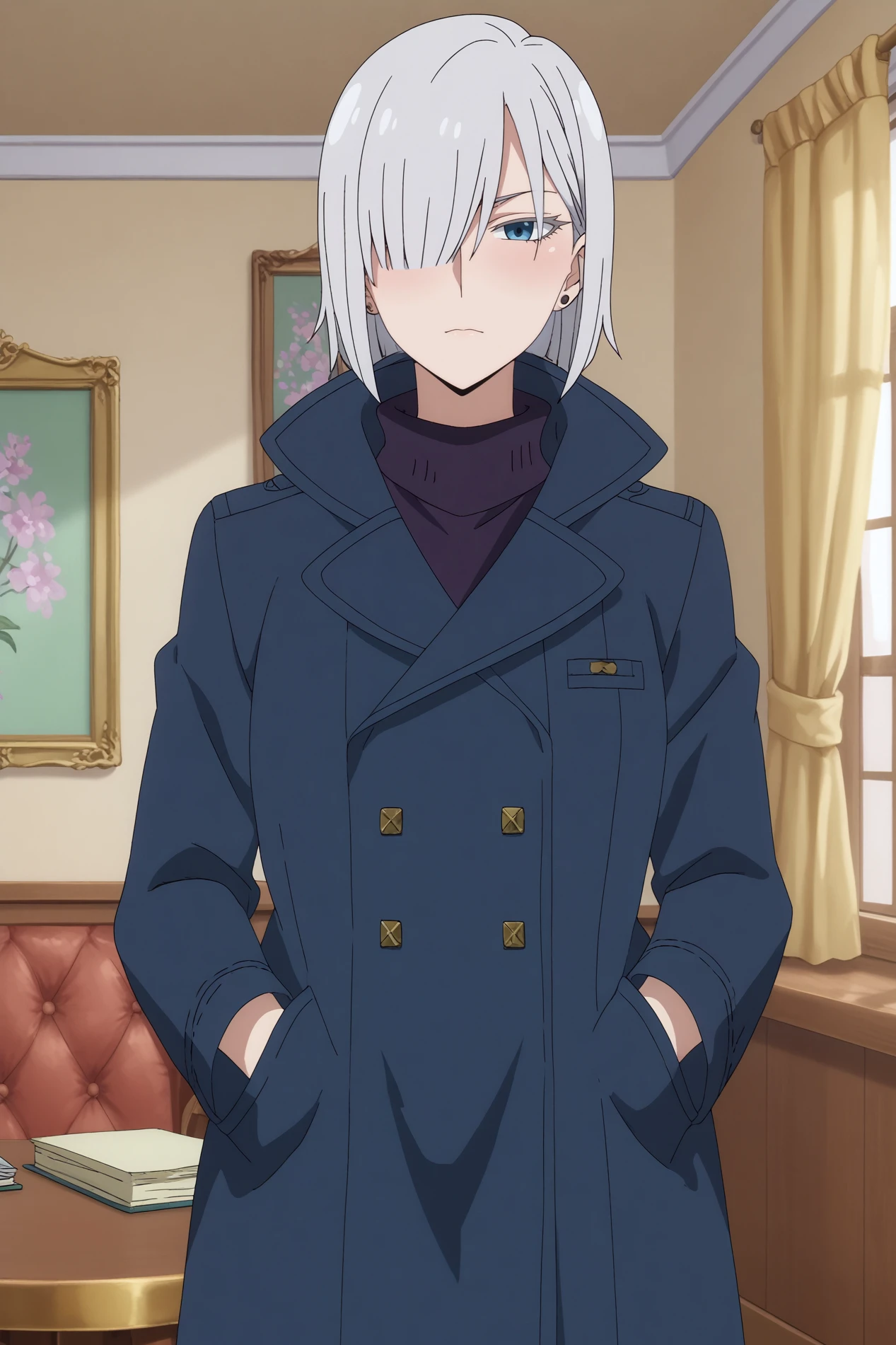 Coat : fiona frost,1girl,solo,mature,short hair,blue coat,coat, hair over one eye,looking at viewer,earrings,grey hair