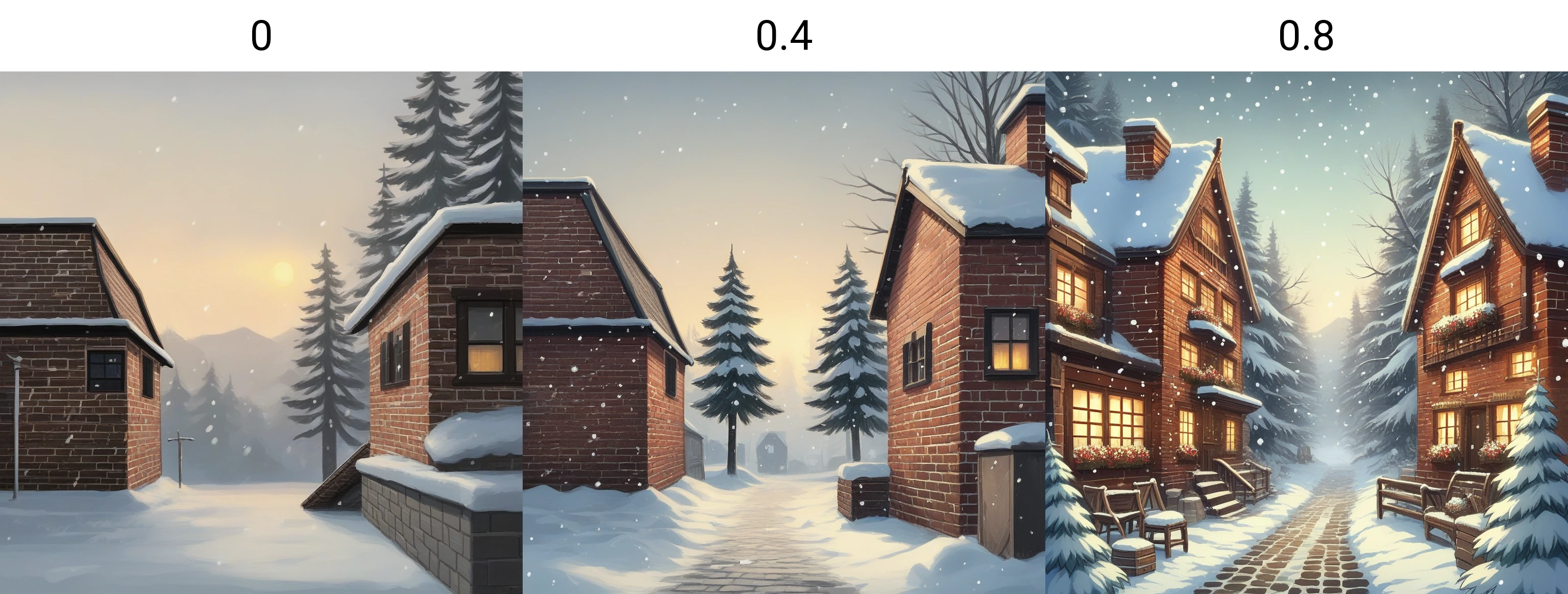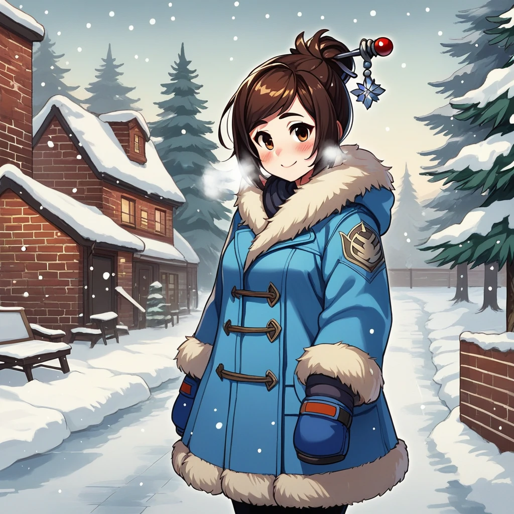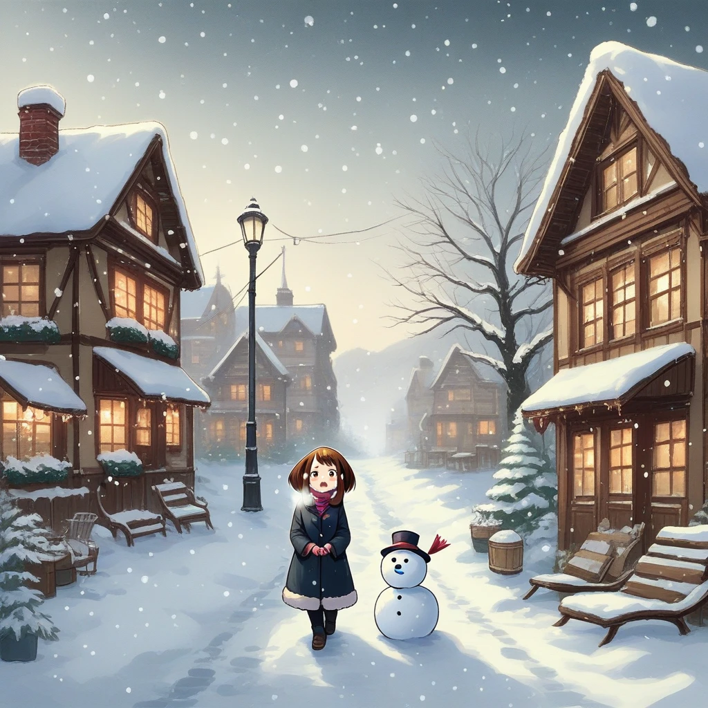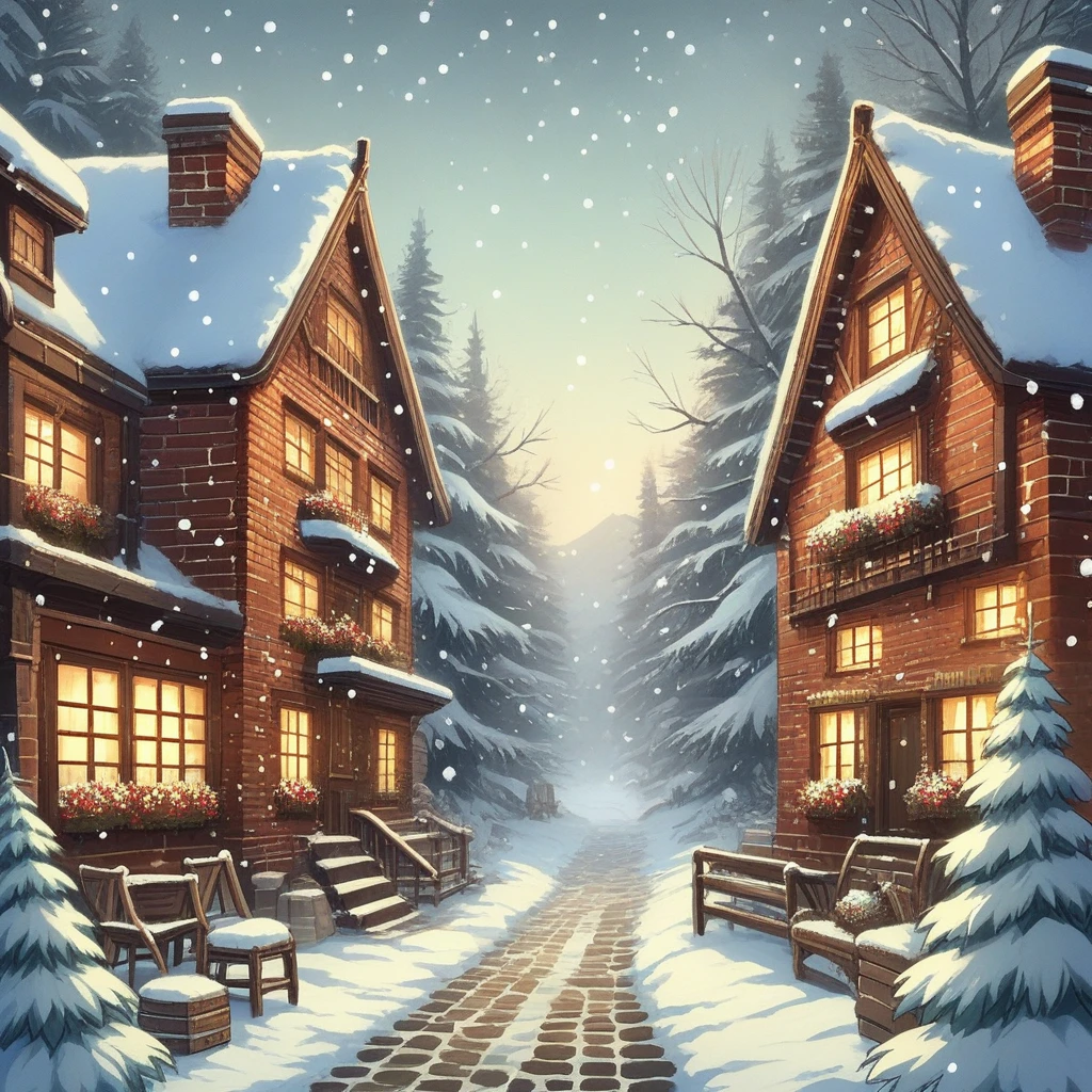 Optional: snow, outdoors, rustic buildings, snowing, pine trees