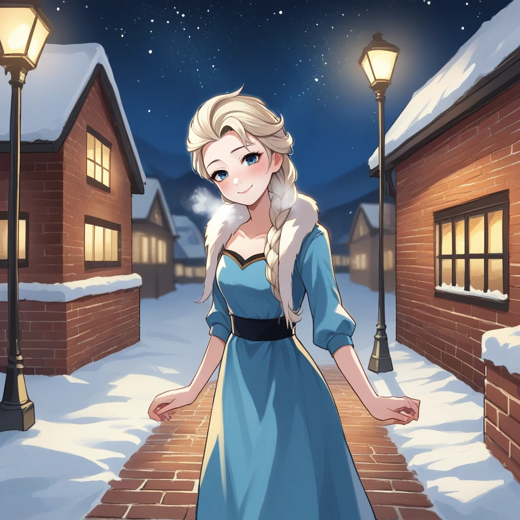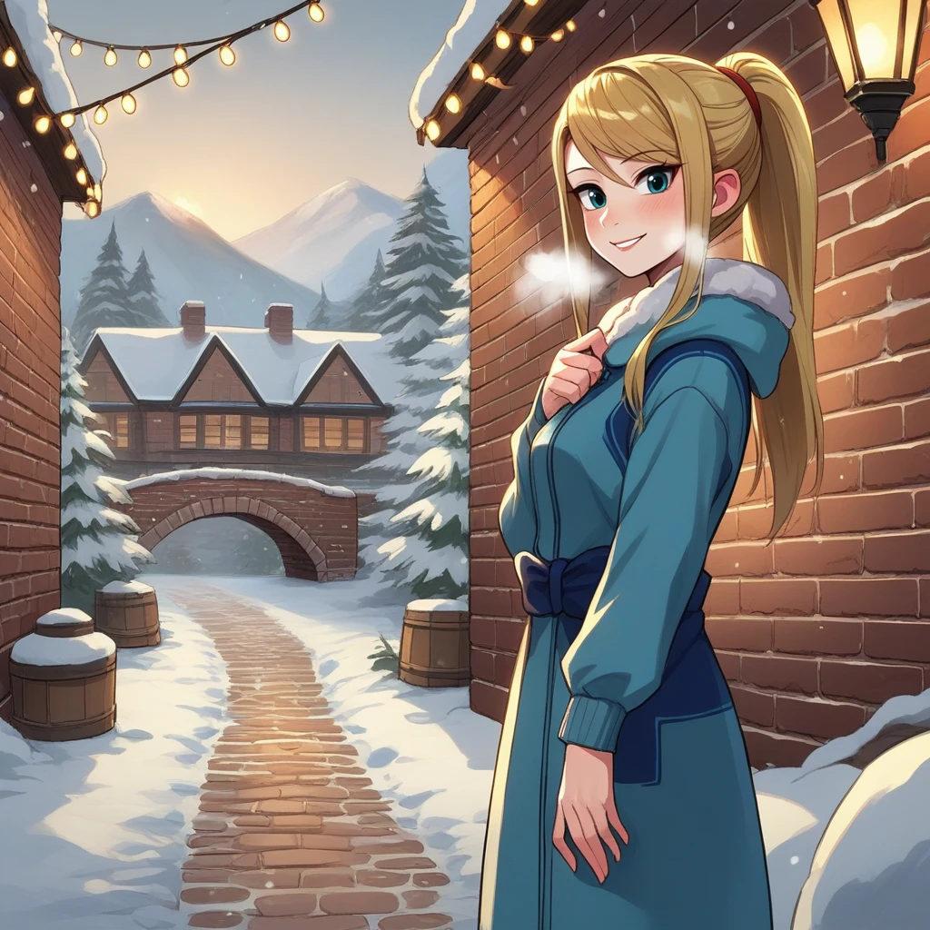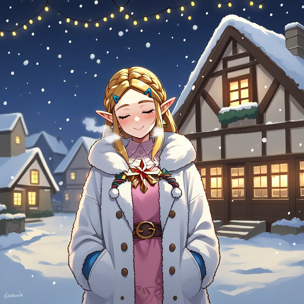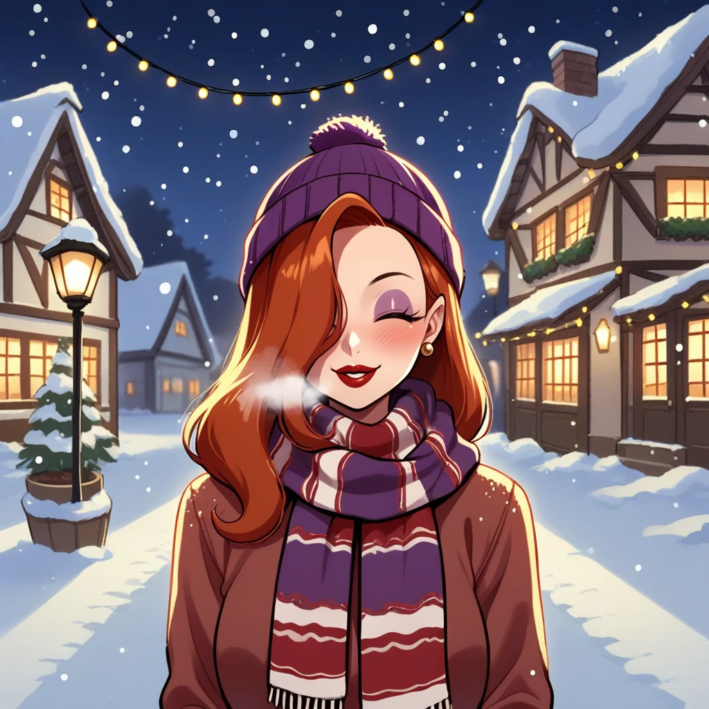 Optional: snow, outdoors, rustic buildings, snowing, pine trees