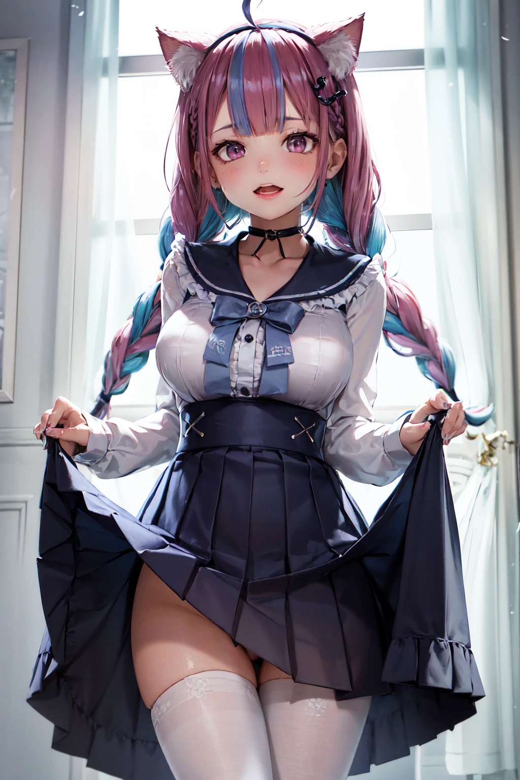 1girl, minato aqua, animal ears, long hair, purple eyes, ahoge, cat tail, multicolored hair, twin braids, blue hair, two-tone hair, hairband, pink hair, anchor hair ornament, ribbon, sailor collar, school uniform, pleated skirt, bow, large breasts