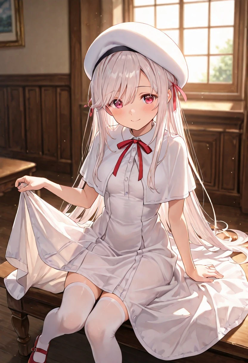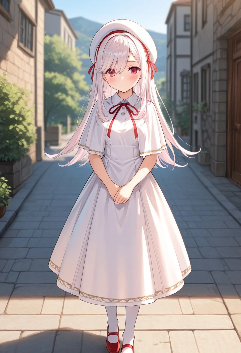 white beret, nanami dress,white long dress, white cloak, very short cloak, collared cloak, ribbon, white thighhighs, red shoes,