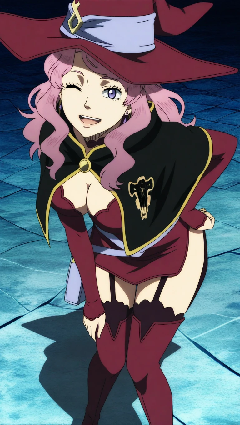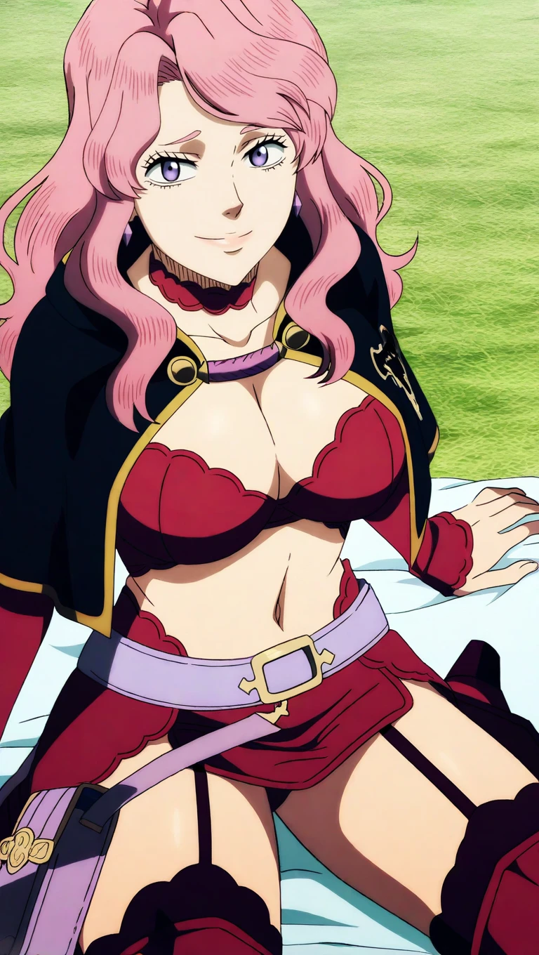 spade arc outfit, breasts, skirt, large breasts, thighhighs, navel, cleavage, underwear, choker, midriff, bra, garter straps, capelet,