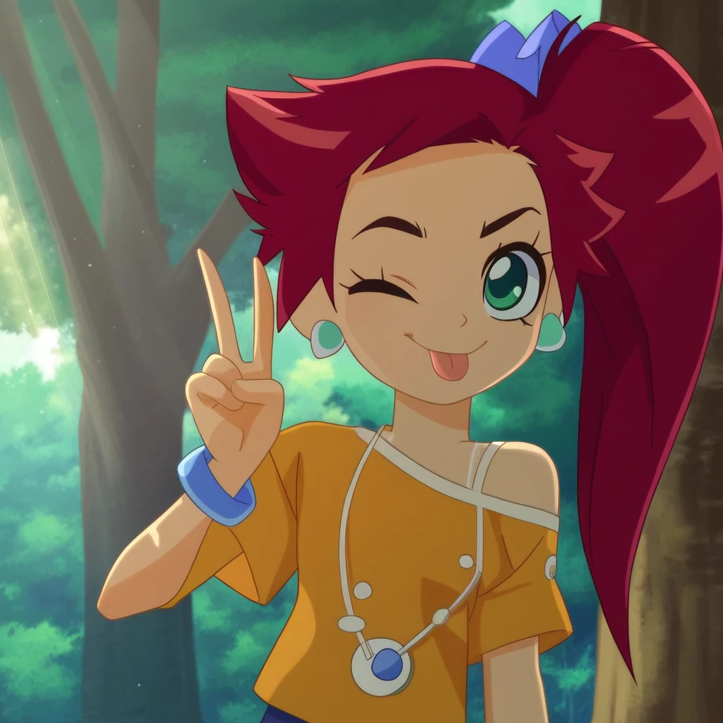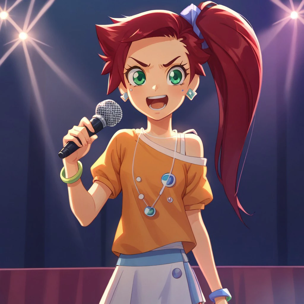 auriana_lr, red hair, long hair, side ponytail, green eyes, earrings, bracelet, necklace, shirt, skirt, off shoulder