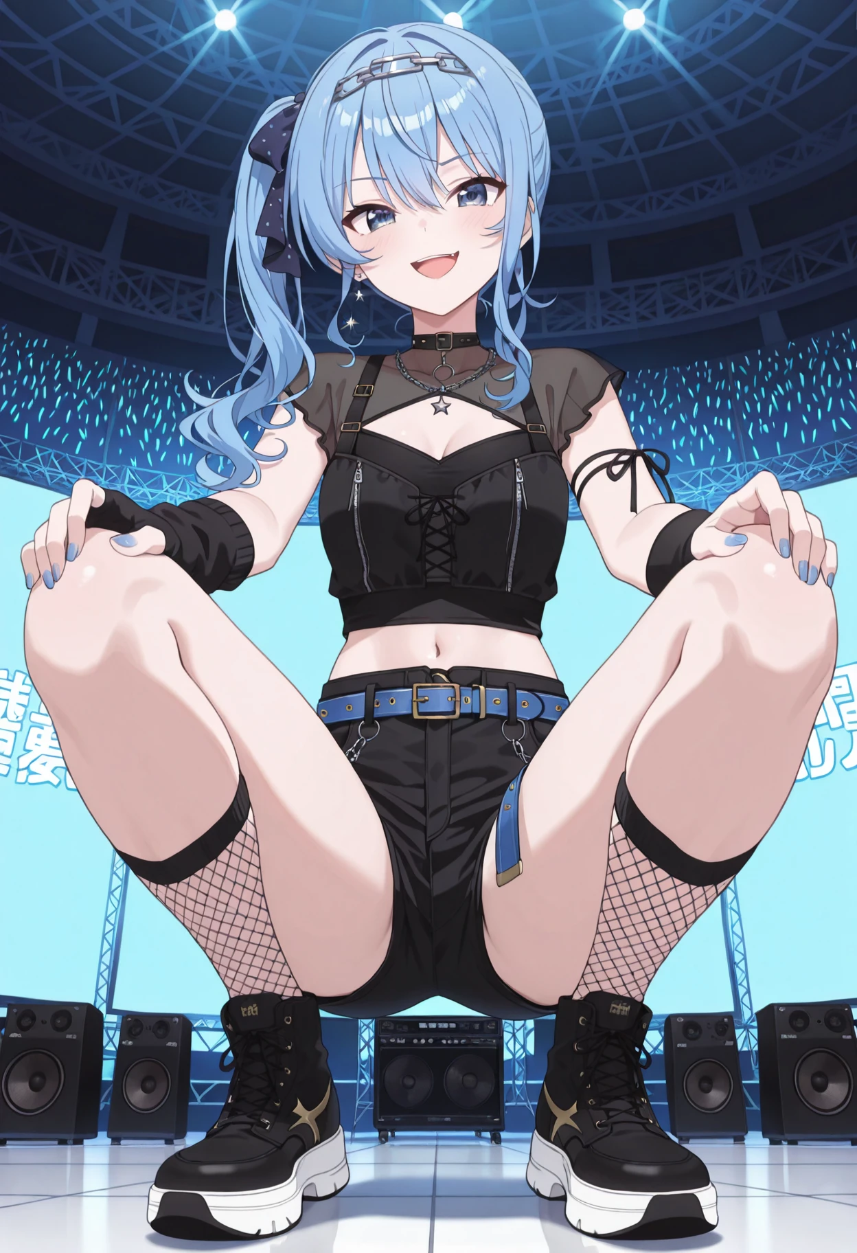 Hoshimachi Sueisei (Hololive), light blue hair, thin chain headband, black hair bow, side ponytail, medium length hair, blue eyes, black see through shoulder shirt, cleavage cutout, flat chest, black denim top, single denim strap, shoulder accessory, short sleeve, small chest, black camisole under black denim top, slight midriff, arm ribbon, one black sleeve glove, one black glove, blue nail polish, double belt, blue belts, black denim short shorts, thigh cutout, thighs visible, black pants, buckle, black pants laces, pants zipper near shoes, fishnet socks, black and white shoes,