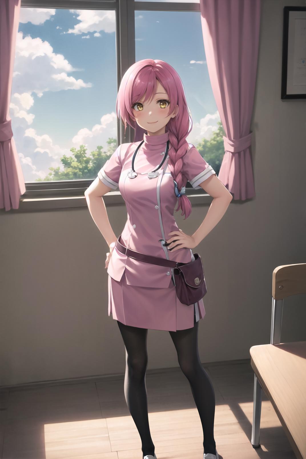 nurse, pink nurse outfit, pink skirt, stethoscope, purple belt, pouch, black pantyhose, white shoes,