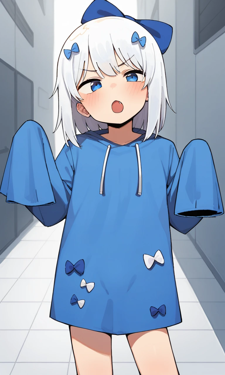 1male, ribbonkun, white hair, short hair, blue eyes, blue hair ribbon, ribbon on clothes, blue hoodie, sleeves past wrists, sleeves past fingers,
