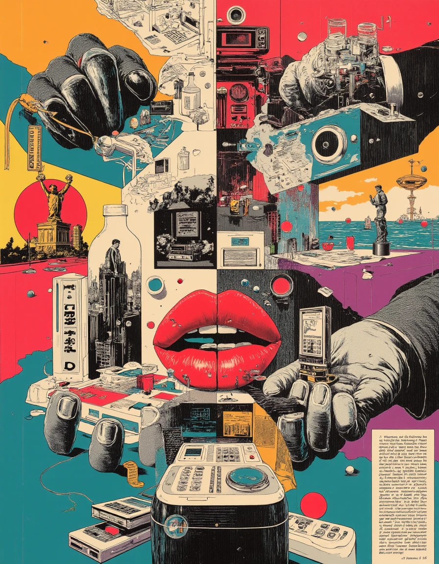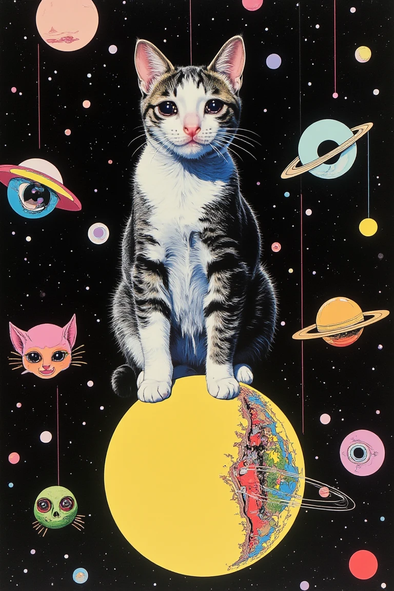 This LoRA generates scenes that blend surrealist and pop art styles in various dreamlike settings.