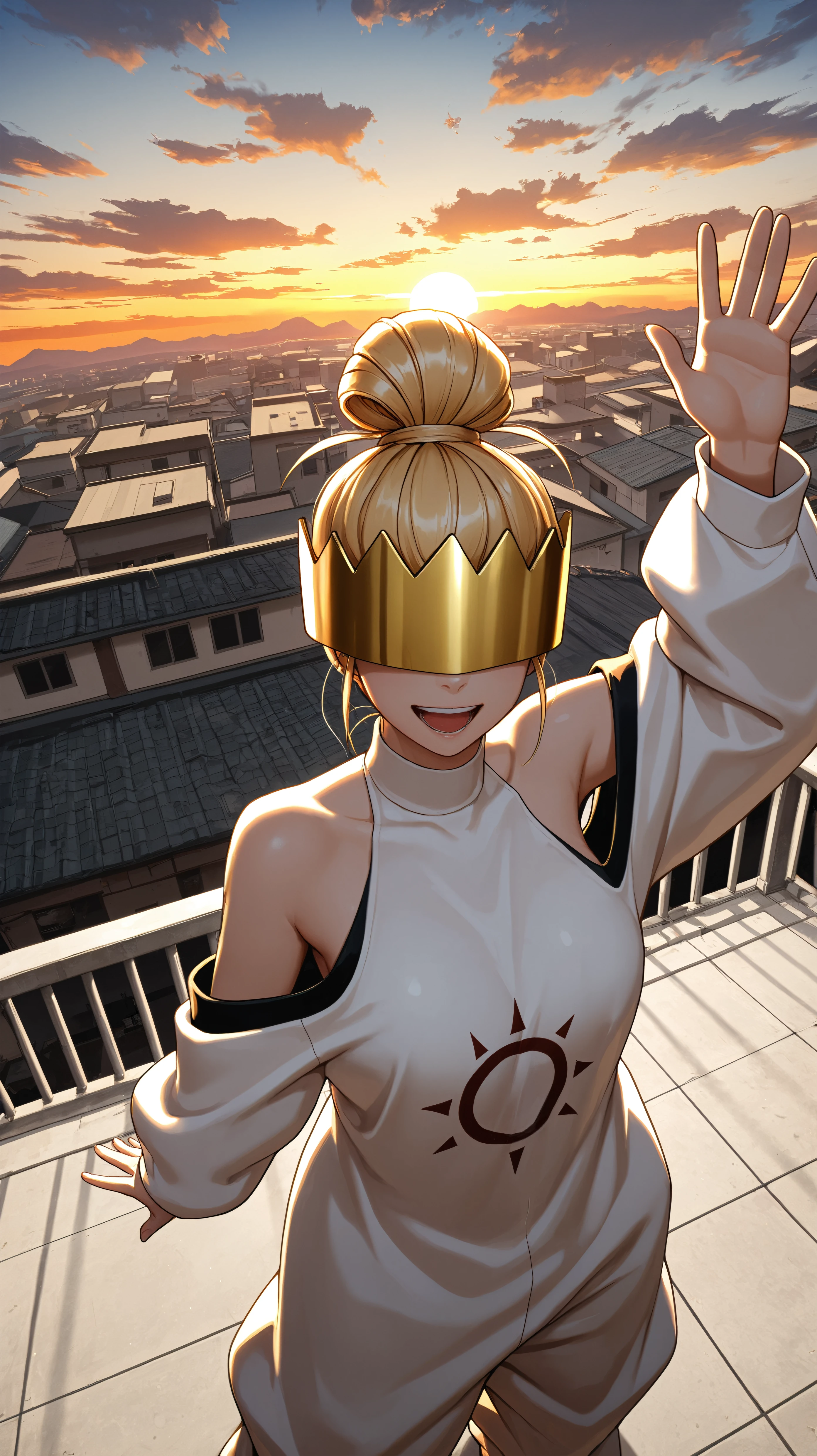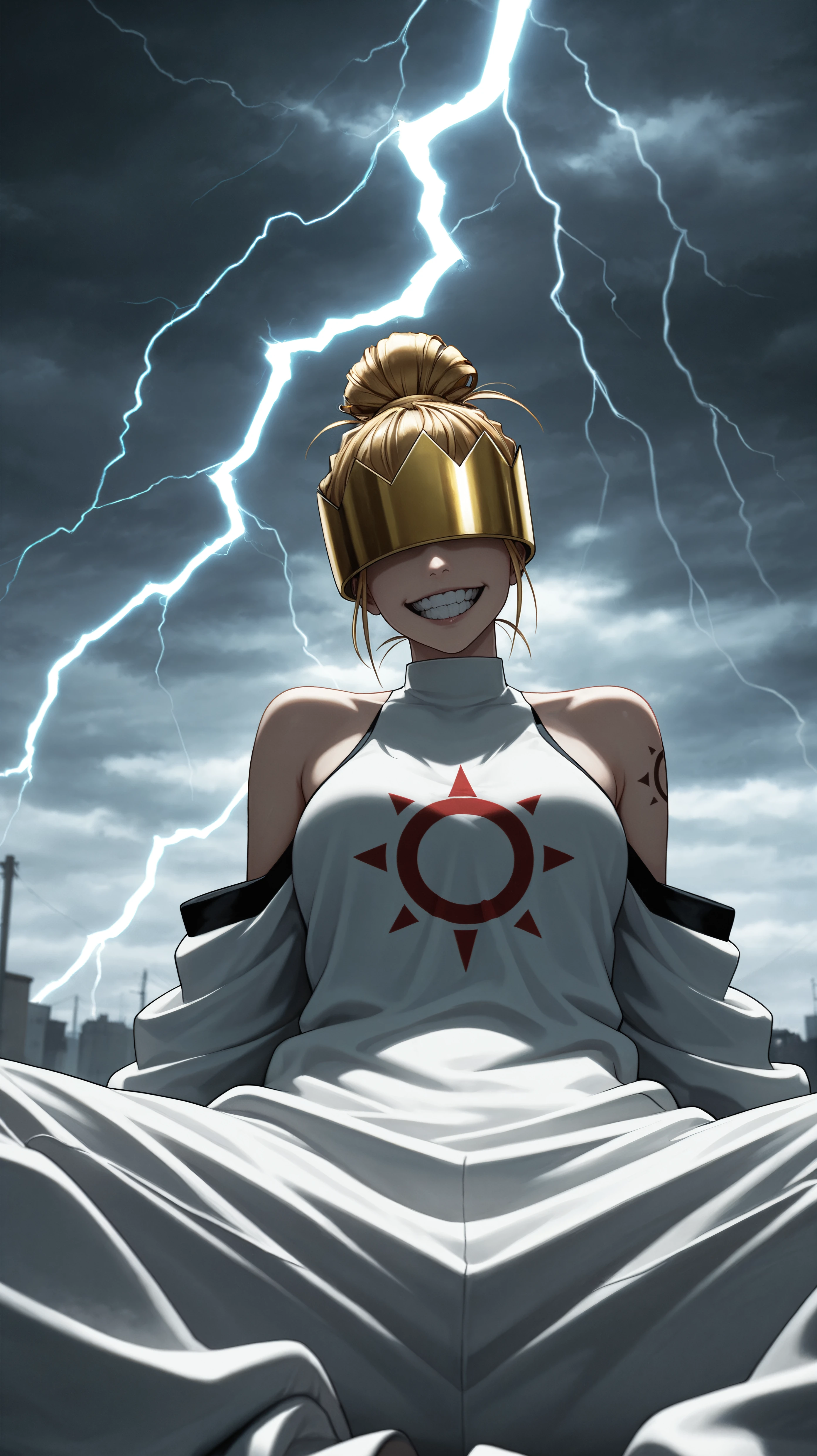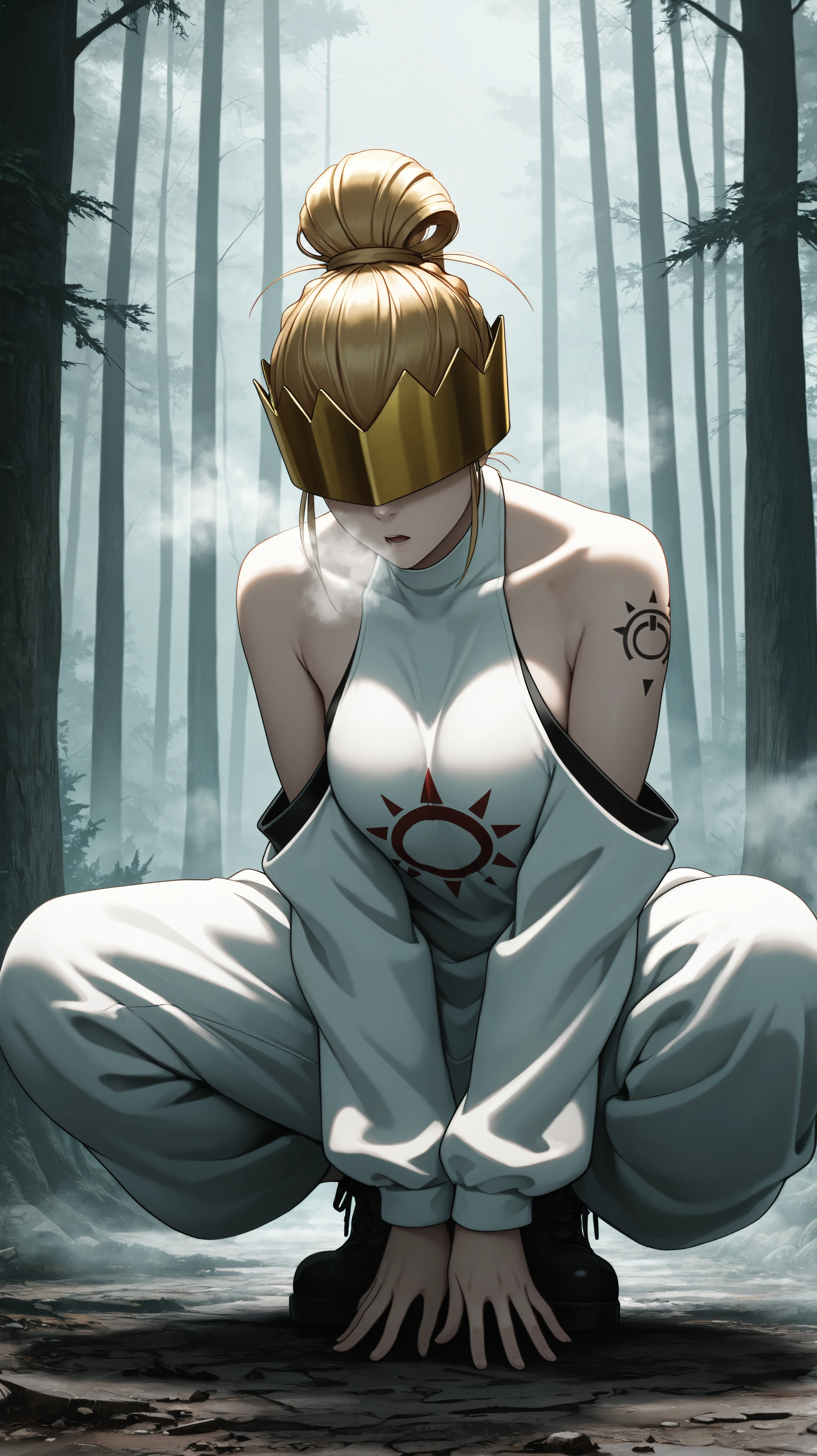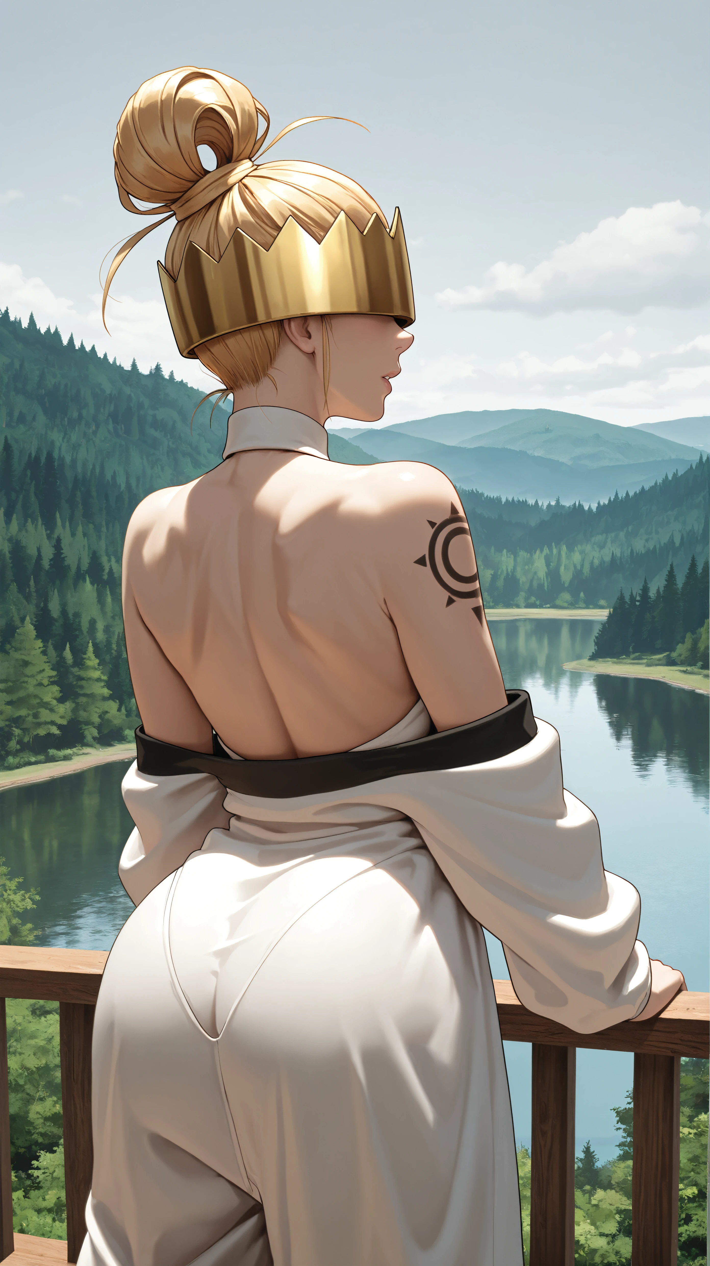 blonde hair, single hair bun, (covered eyes), (crown), white outfit, halterneck, detached sleeves, bare shouldersDescription