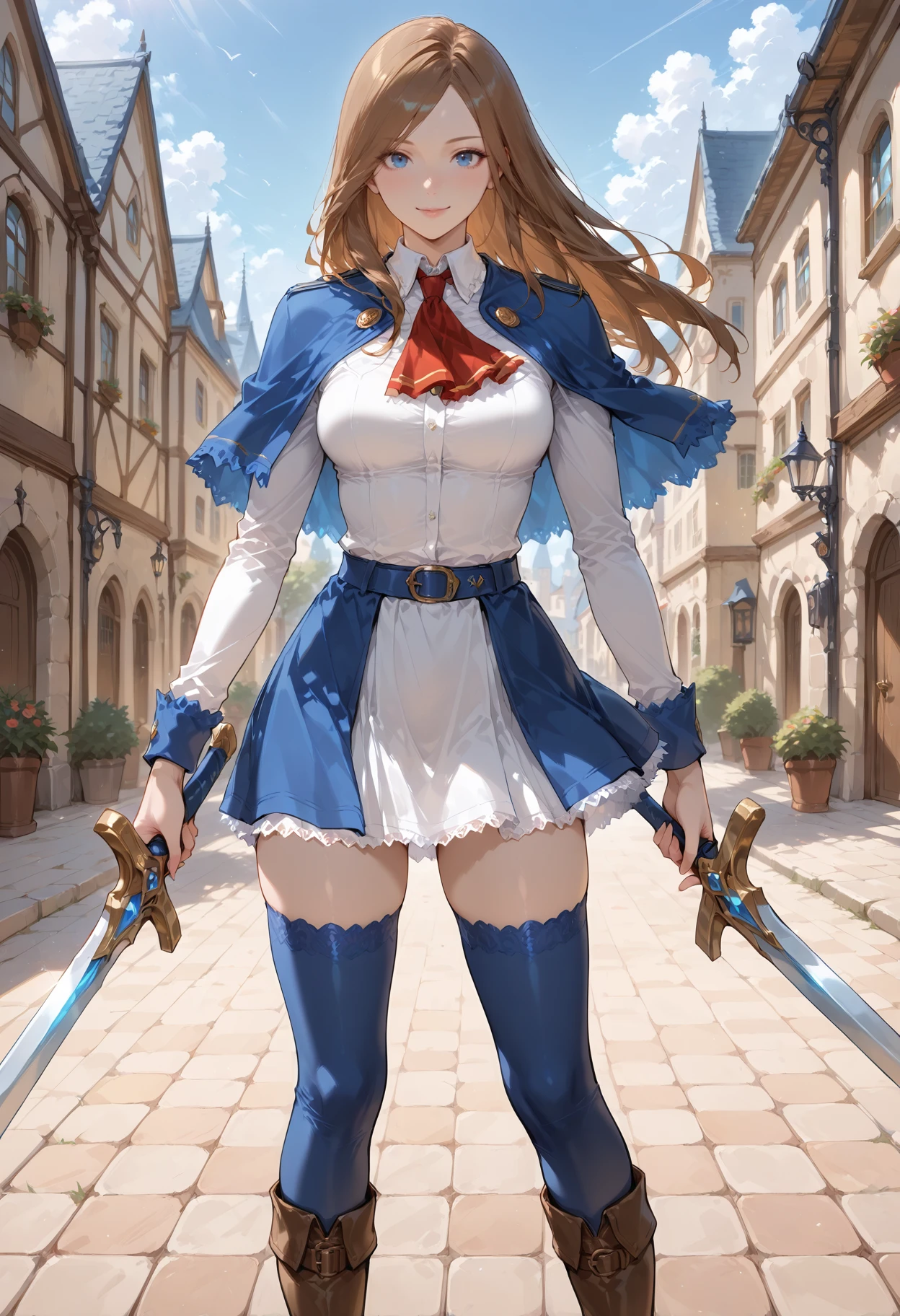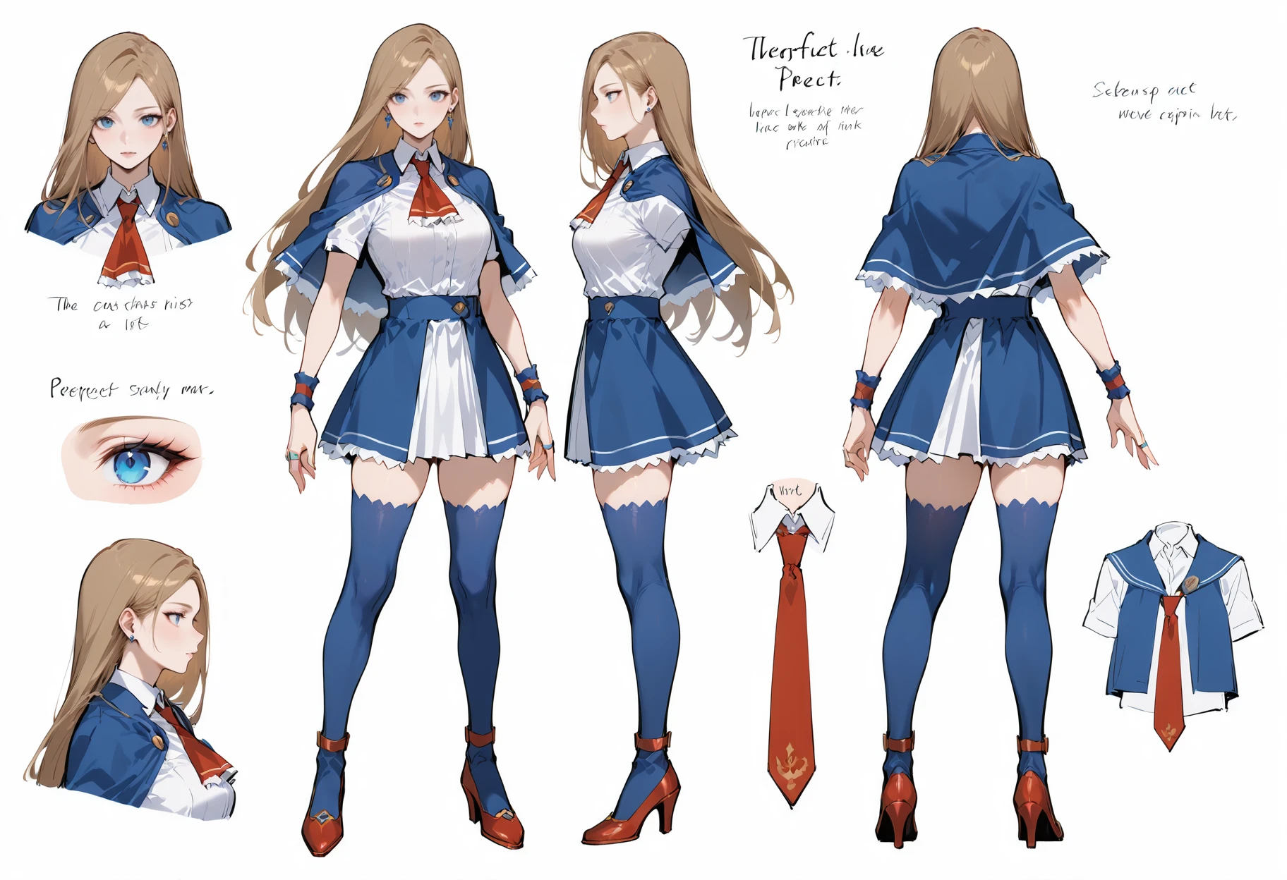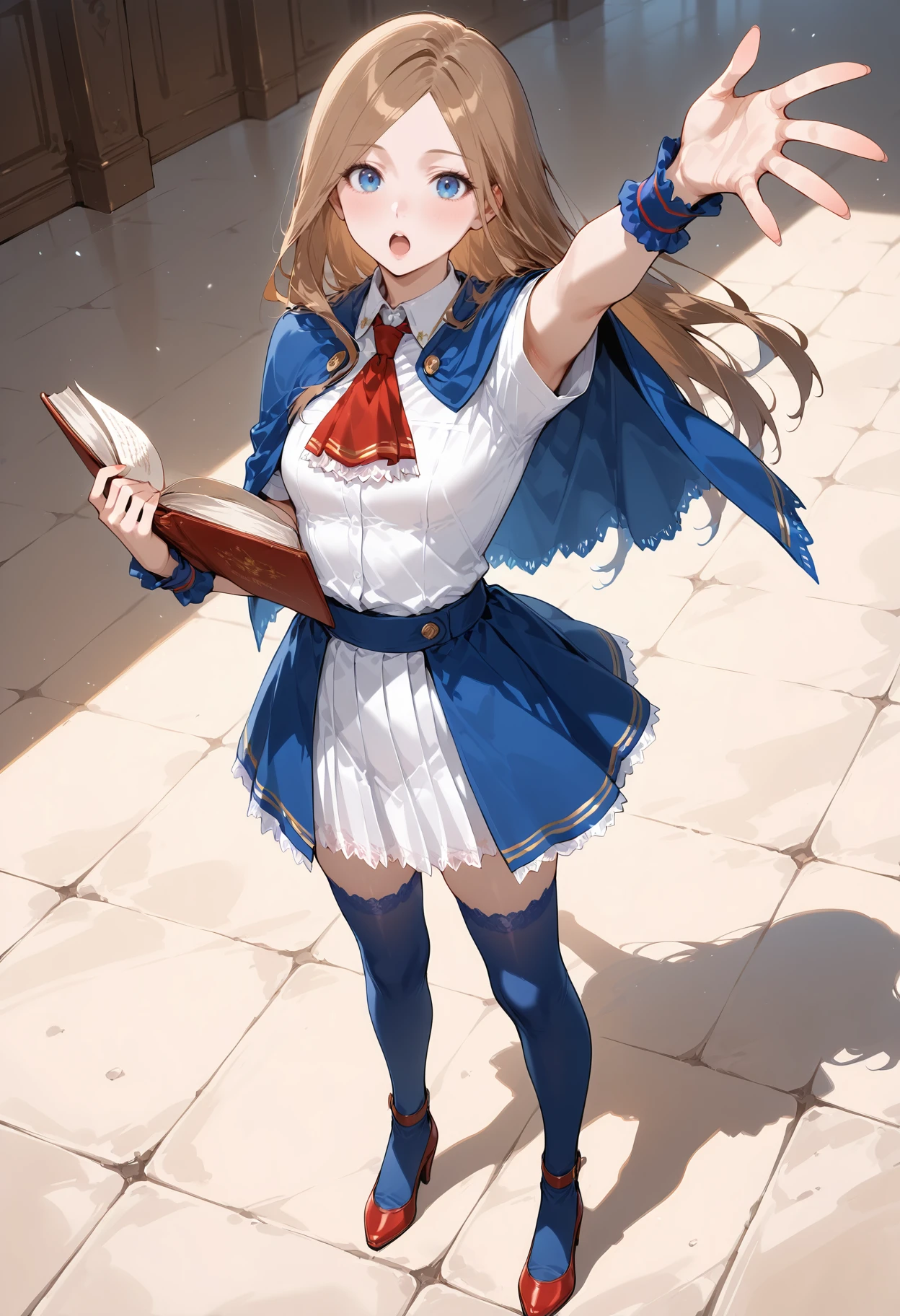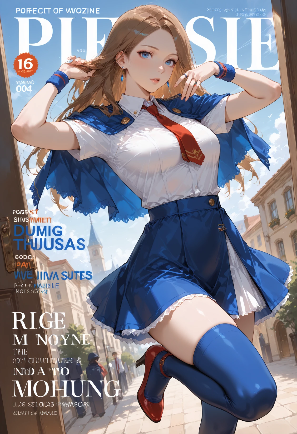 Outfit: necktie,red necktie,ring,jewelry,breasts,medium breasts,capelet,blue capelet,ascot,shirt,white shirt,short sleeves,wristband,skirt,blue skirt,high-waist skirt,zettai ryouiki,thighhighs,blue thighhighs,shoes,red footwear,high heels