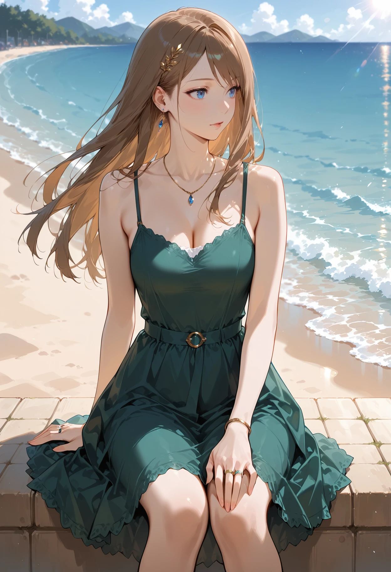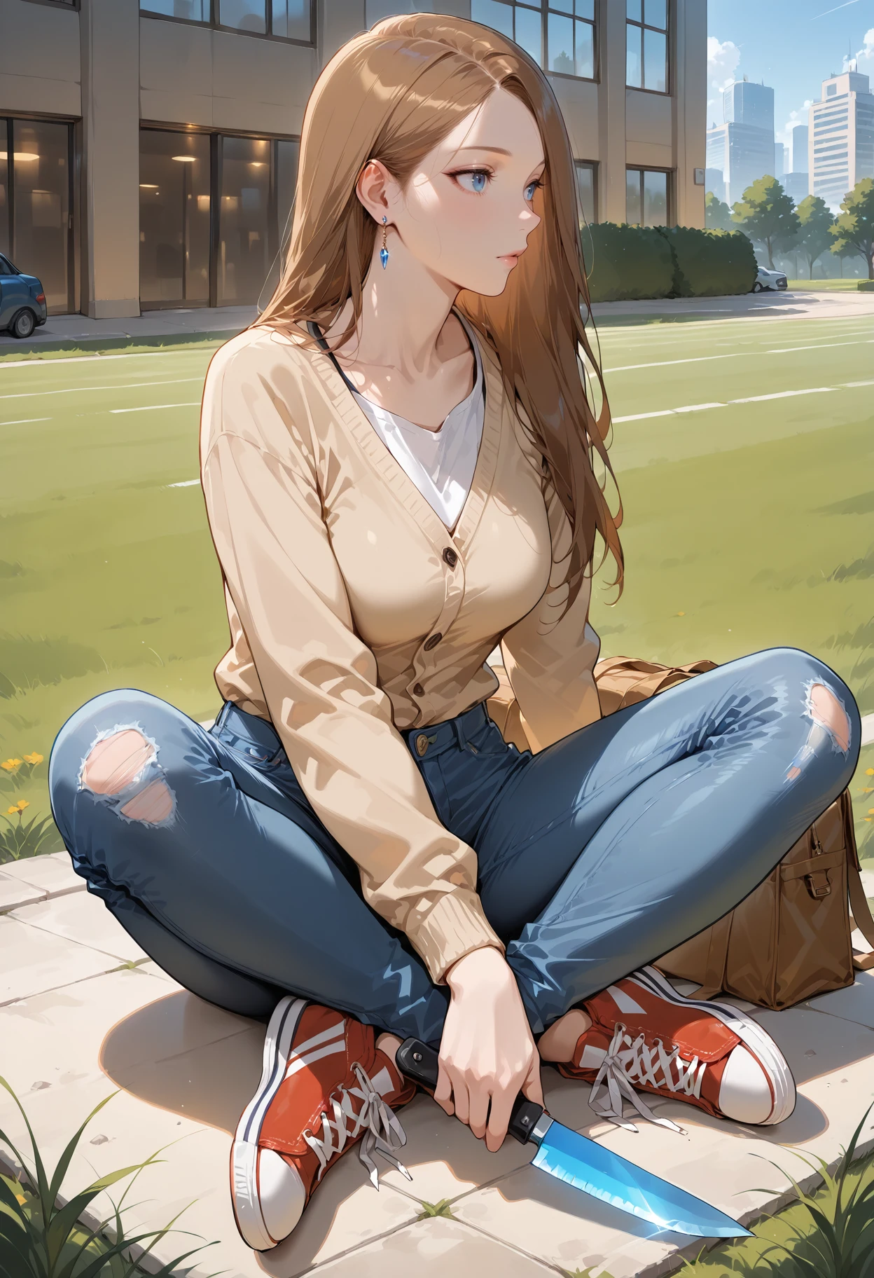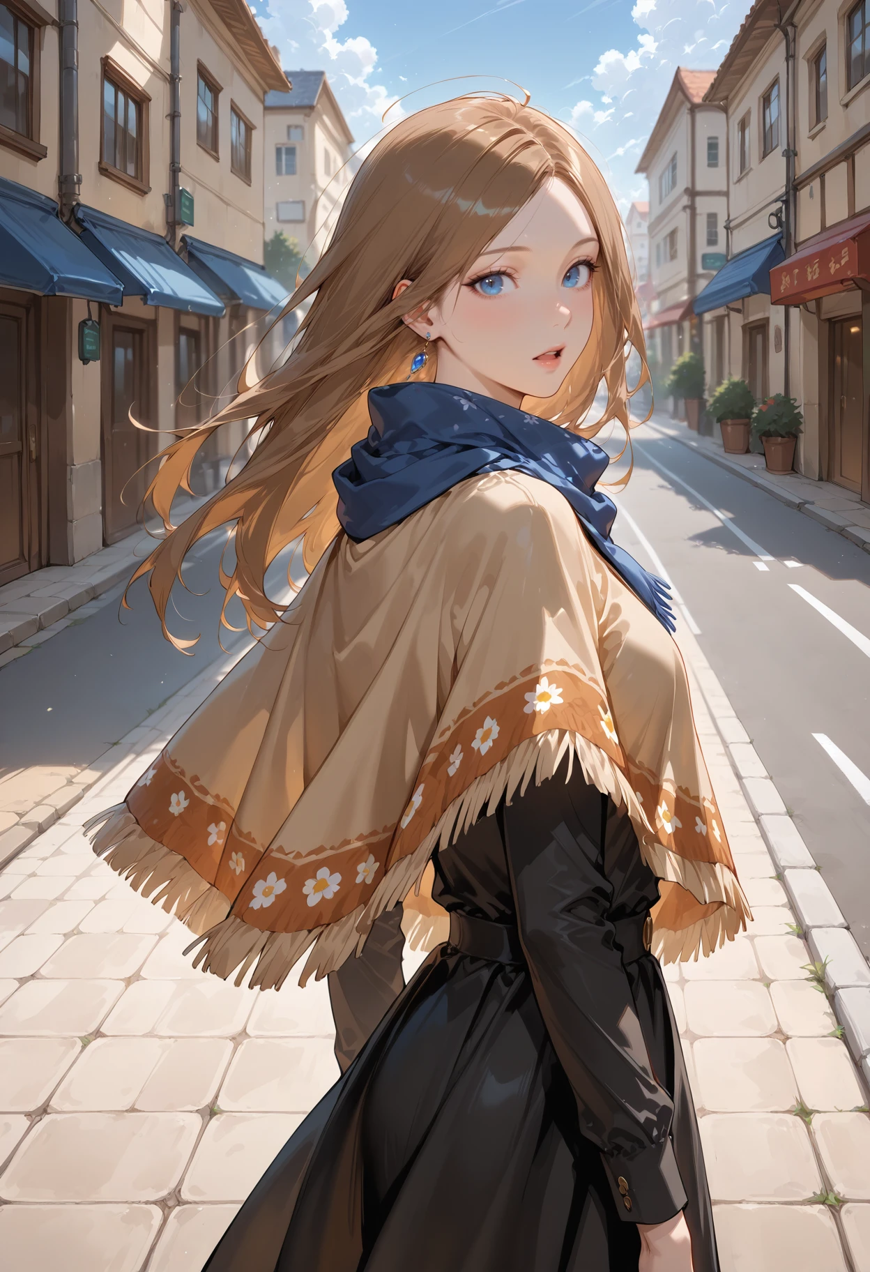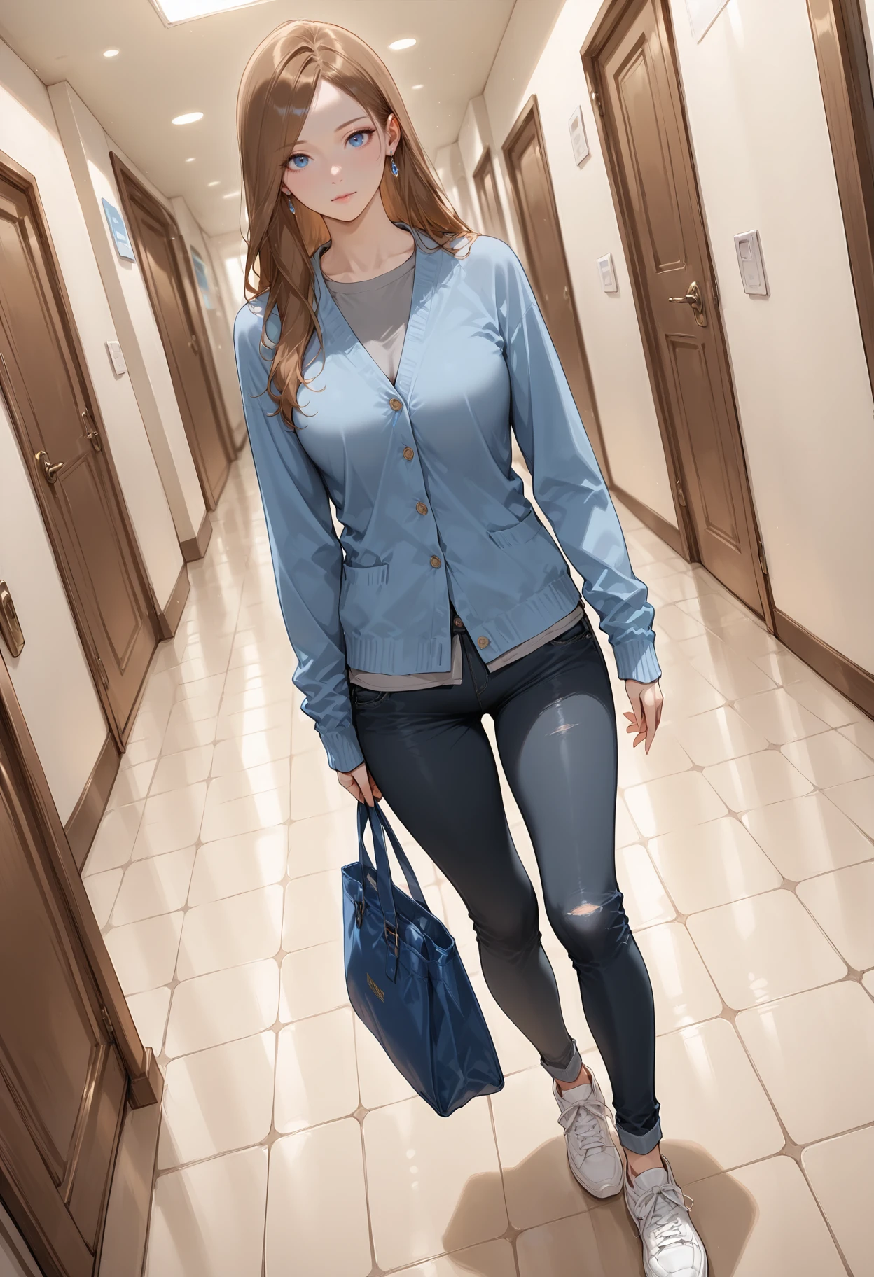 Appearance: 1girl,blue eyes,brown hair,long hair,earrings