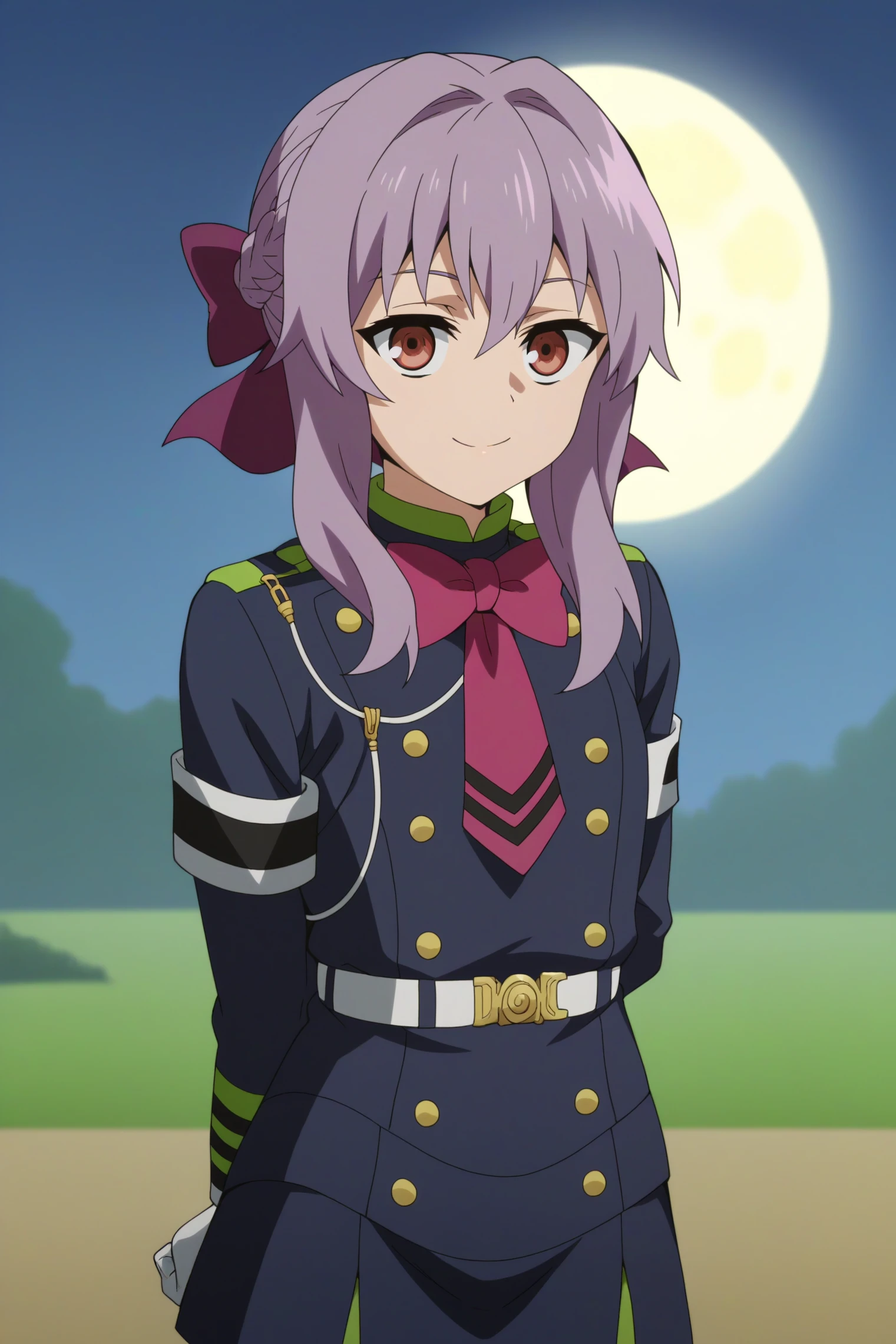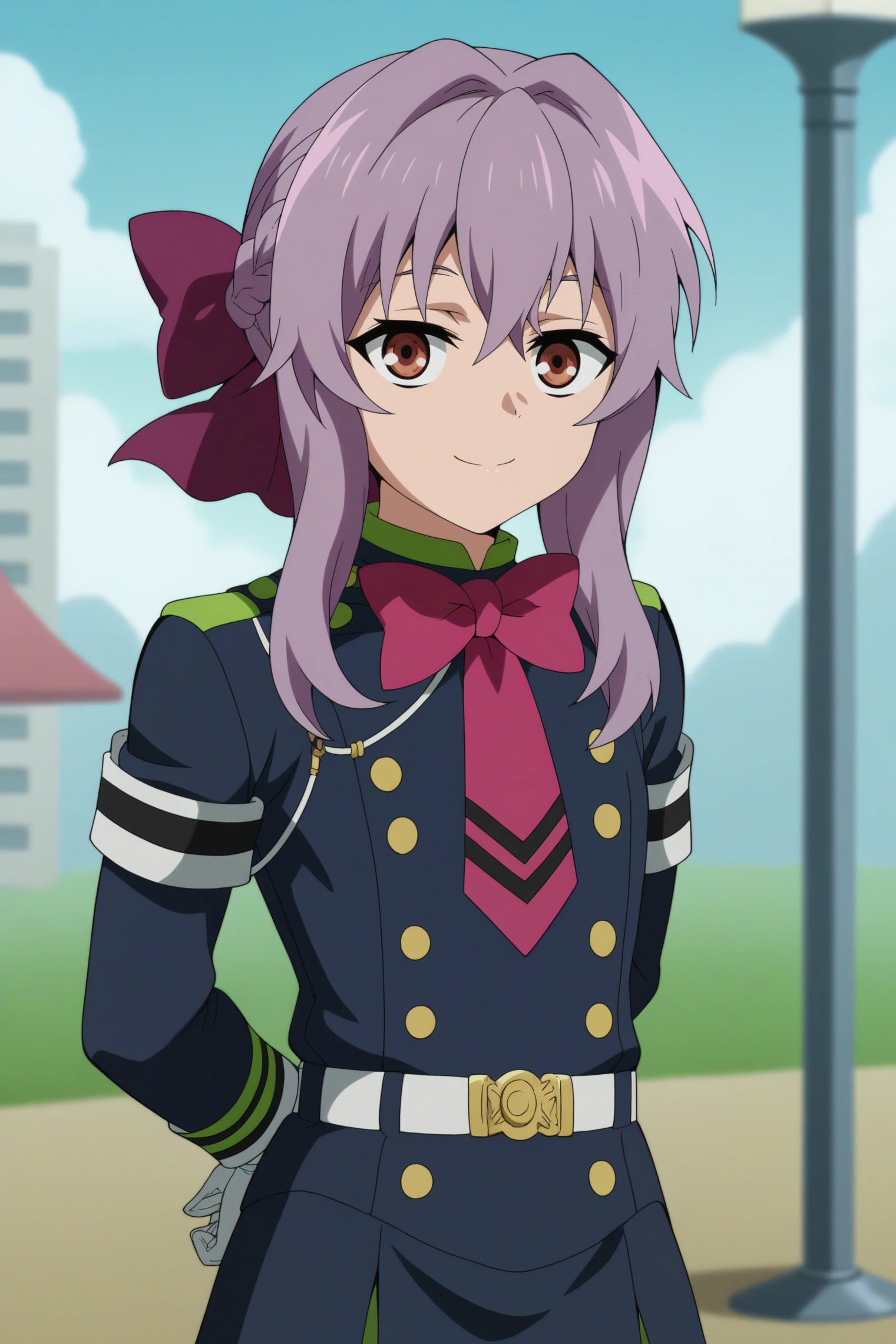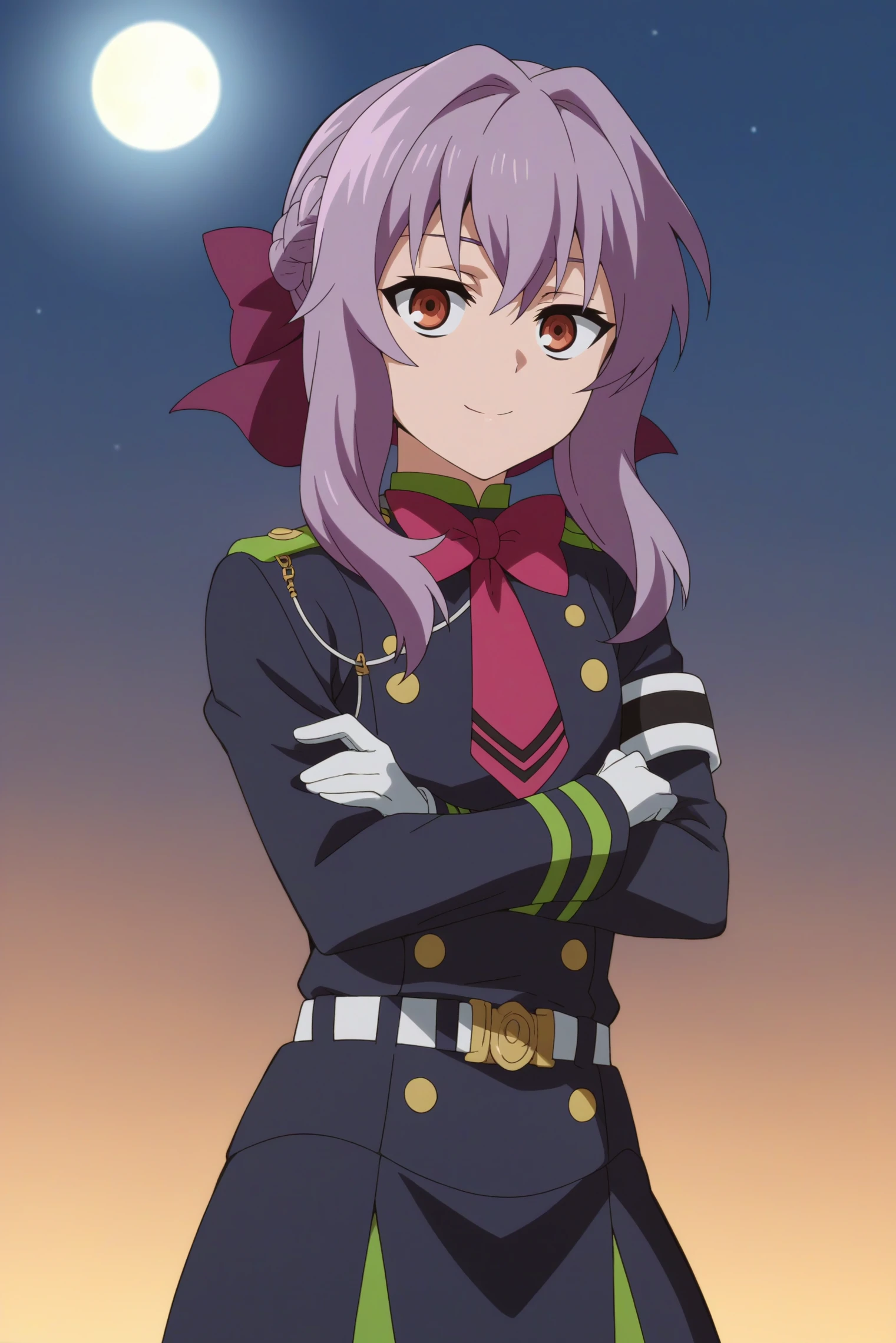 Triggers : 1girl,solo,shinoa hiragi,gloves,long hair,white gloves,uniform,military,braid,purple bow,black thighhighs, zettai ryouiki