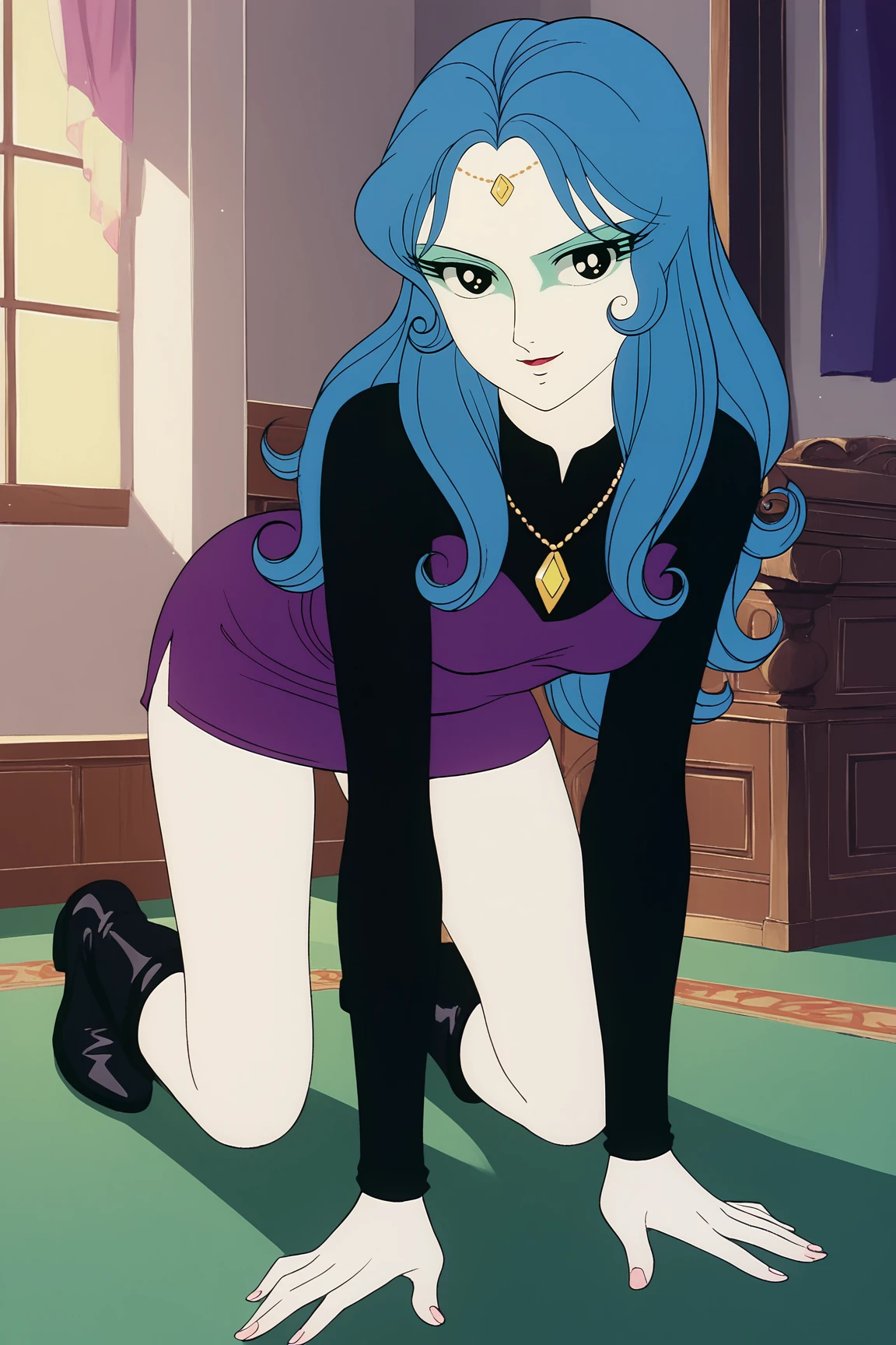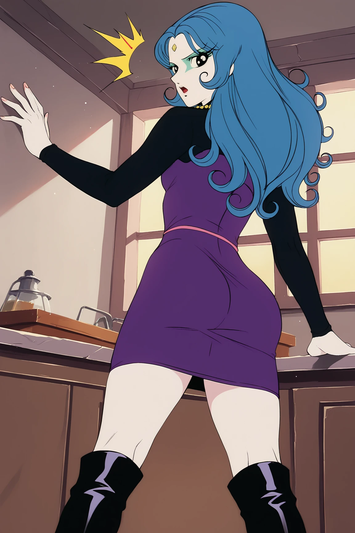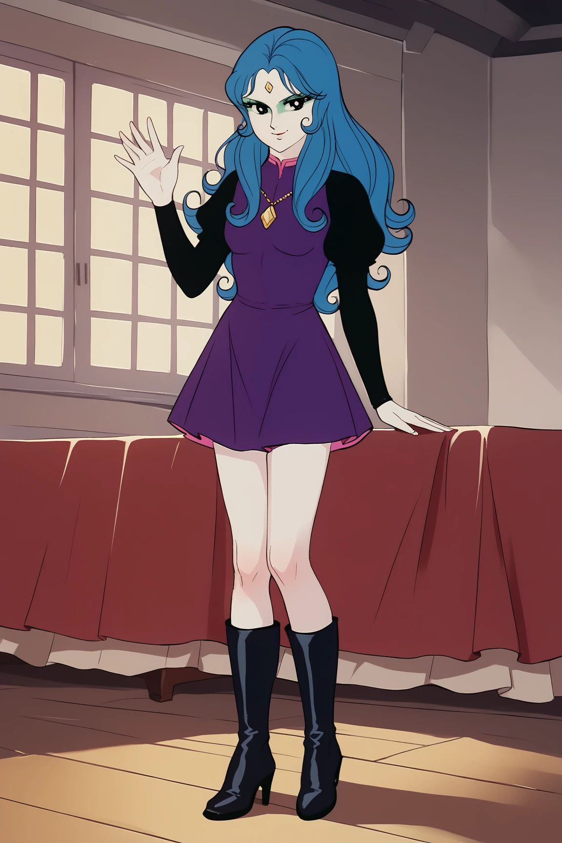 NonGouMMXL, retro artstyle, white skin, colored skin, black eyes, blue hair, long hair, sidelocks, forehead jewel, small breasts, necklace, purple dress, black sleeves, purple skirt, black boots
