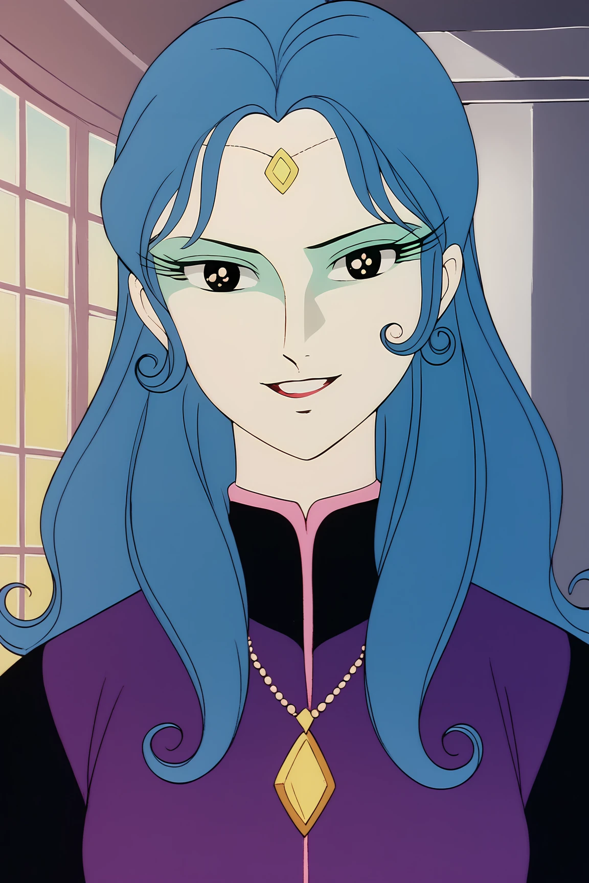 ➜ NonGouMMXL, retro artstyle, white skin, colored skin, black eyes, blue hair, long hair, sidelocks, forehead jewel, small breasts, necklace, purple dress, black sleeves, purple skirt, black boots]--|======[ 💗 My Settings: 💗 ]======|--[