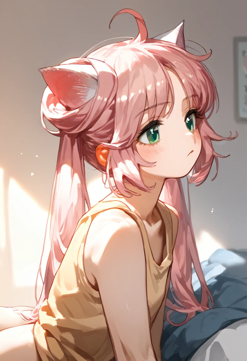 morning(djmax), 1girl, long hair, pink hair, ahoge, twintails, green eyes, cat ears, tank top
