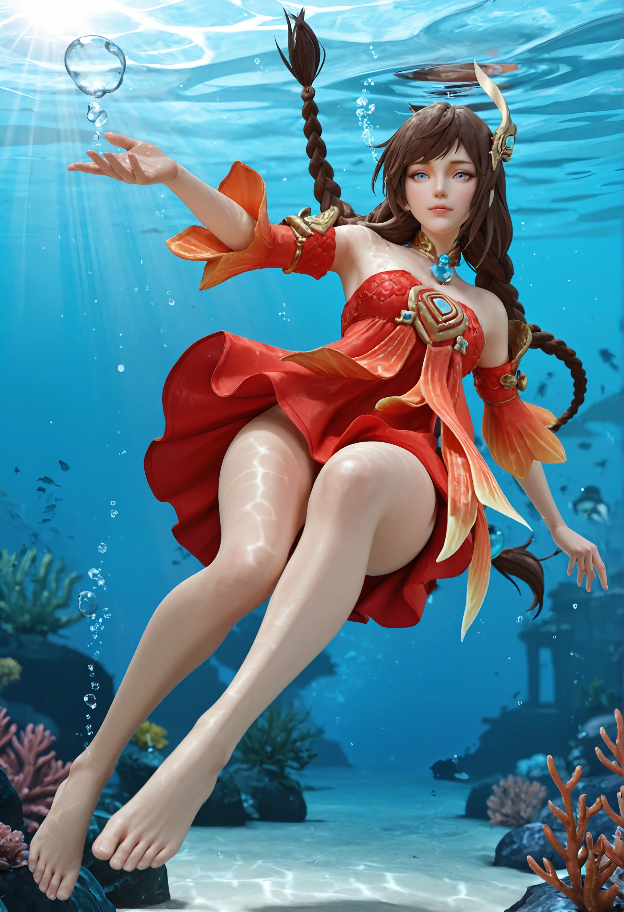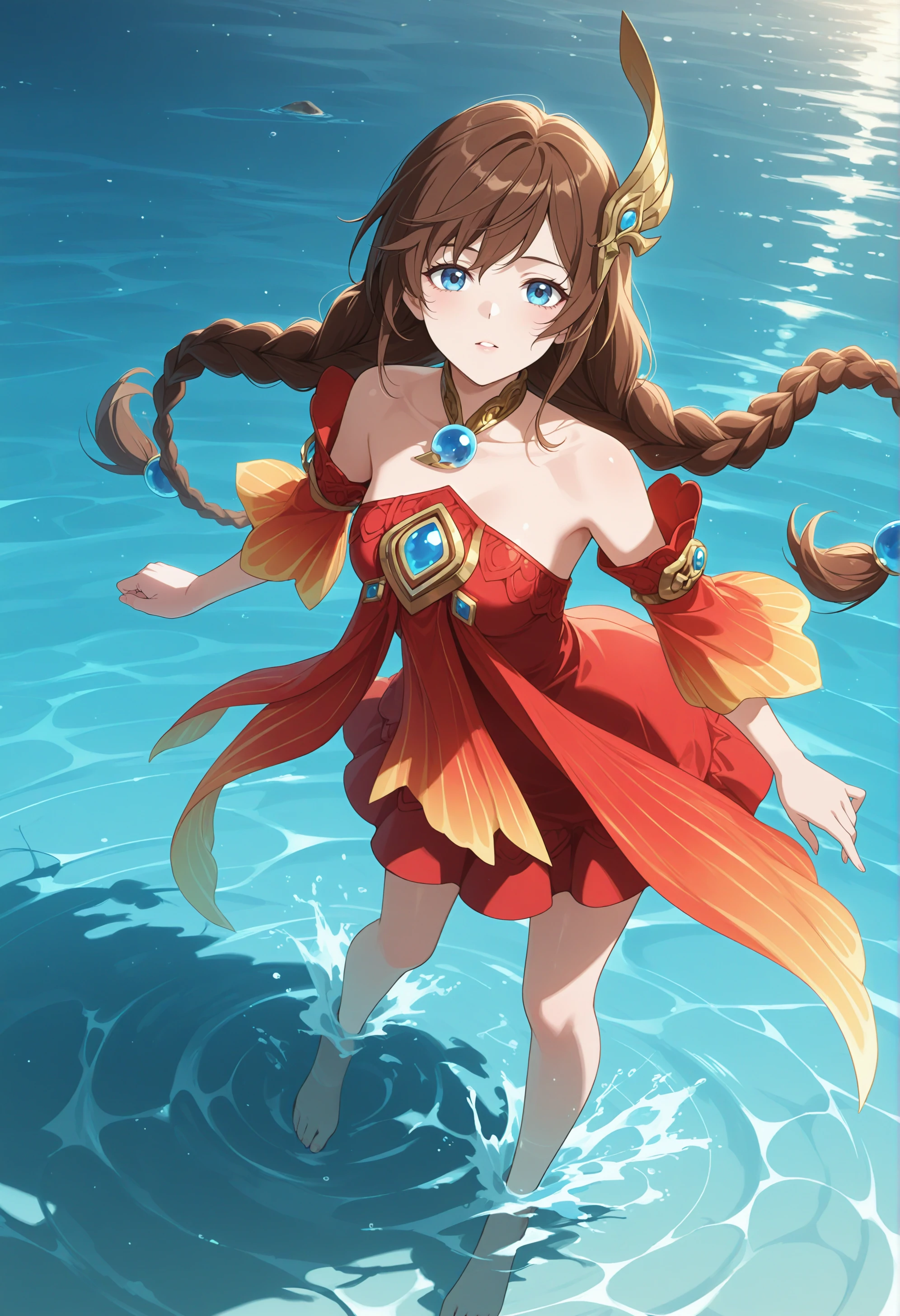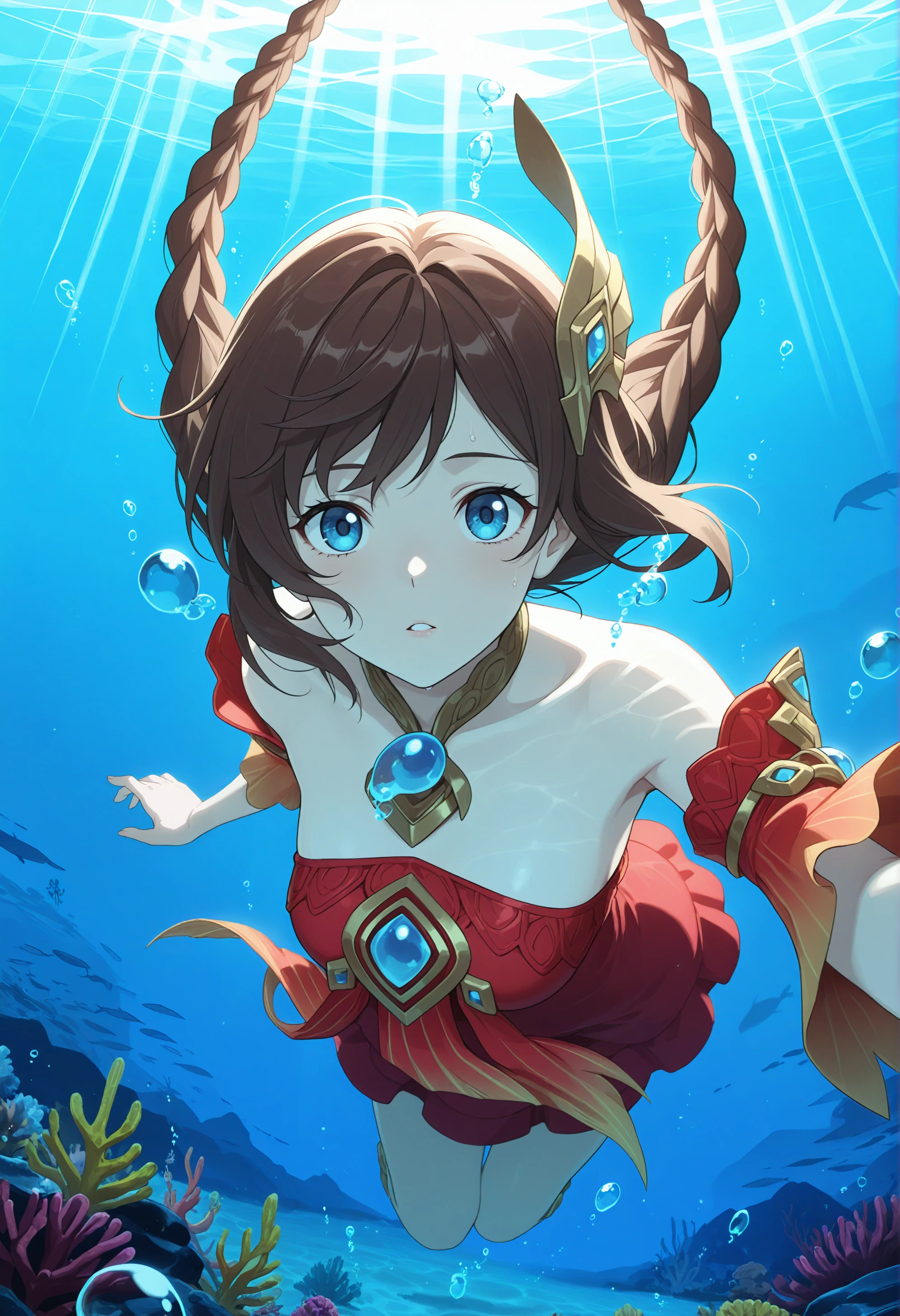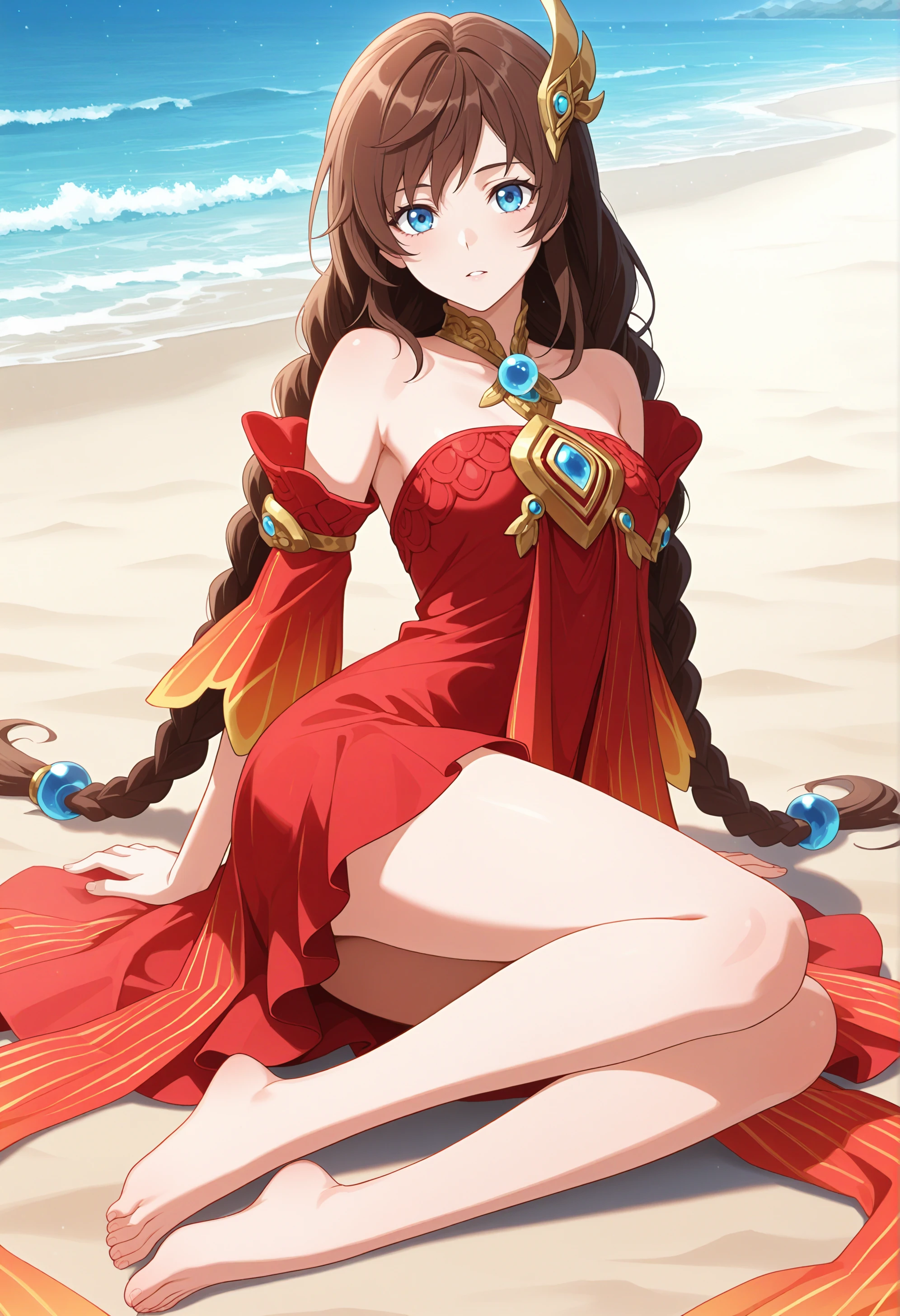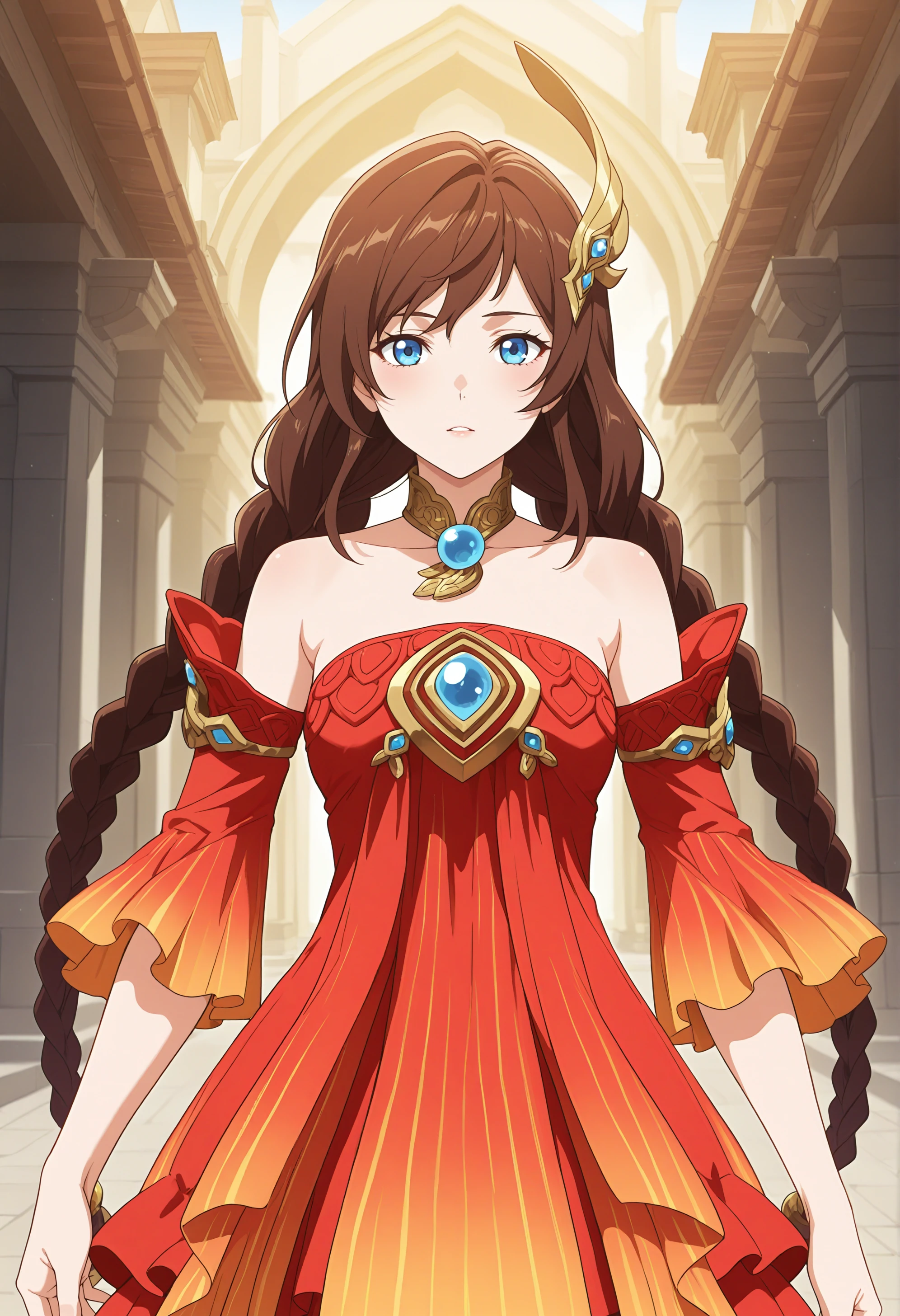 daqiao,brown hair,blue eyes,hair ornament,twin braids,long hair,