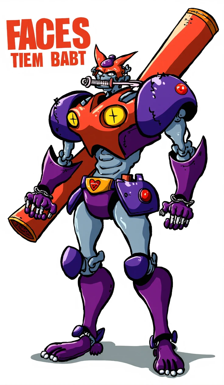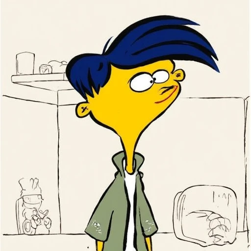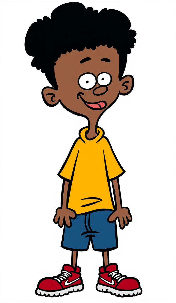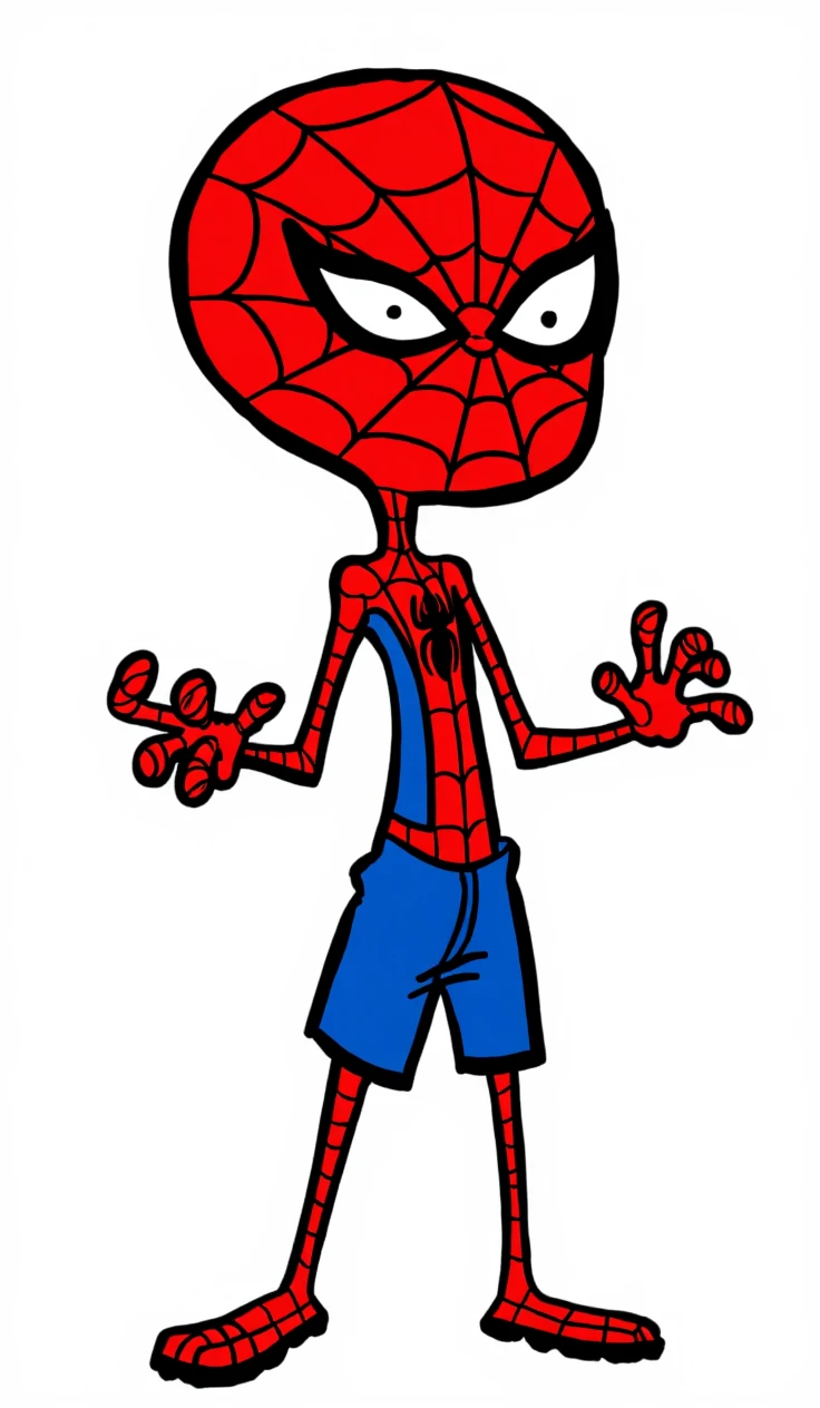 The character, exaggerated and simplistic art style with bold lines and bright colors."
