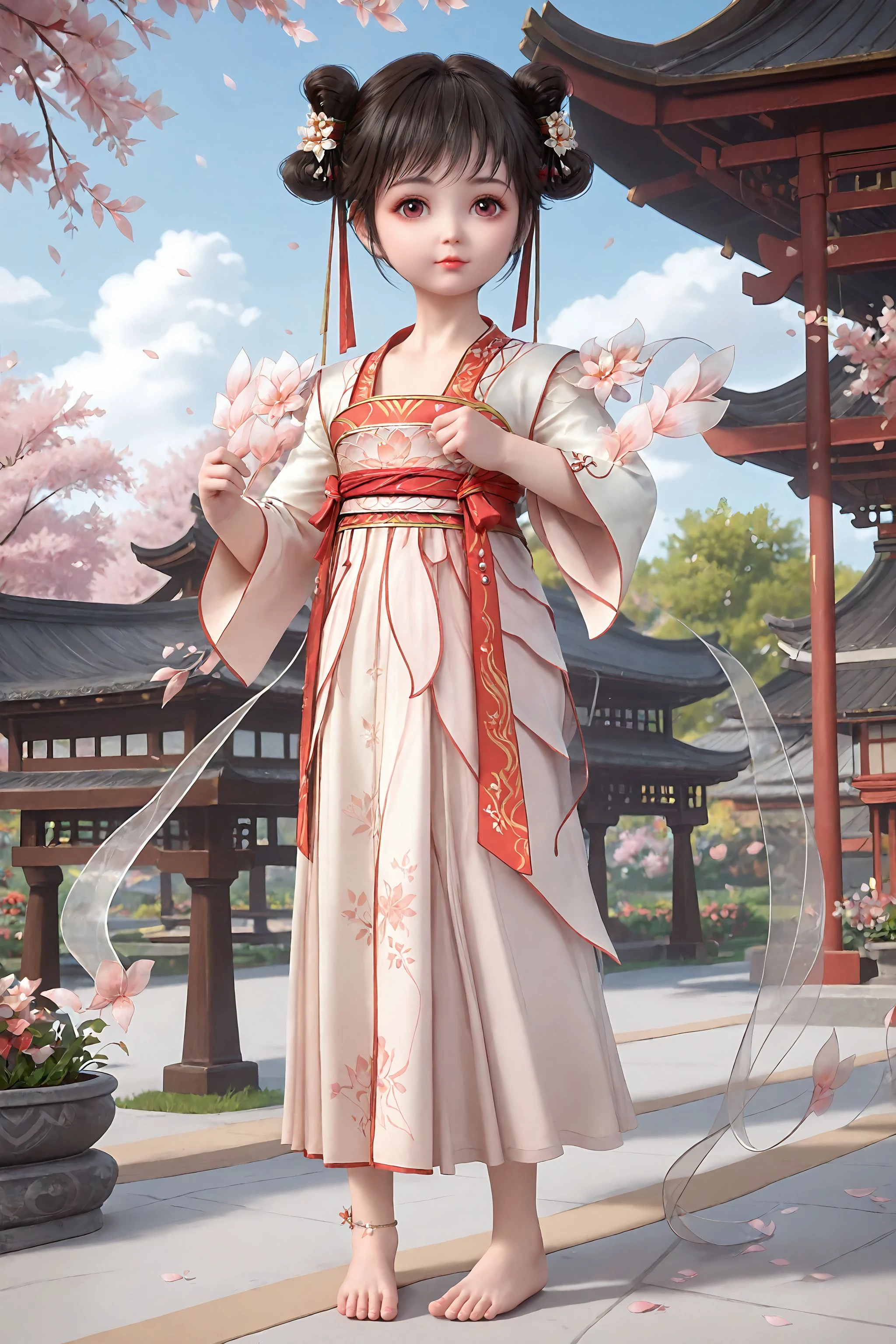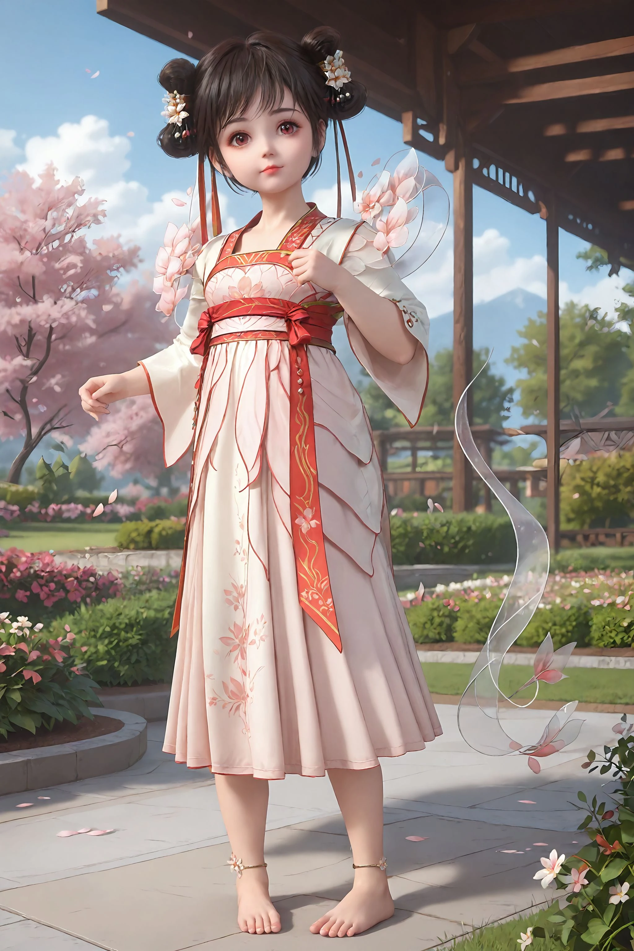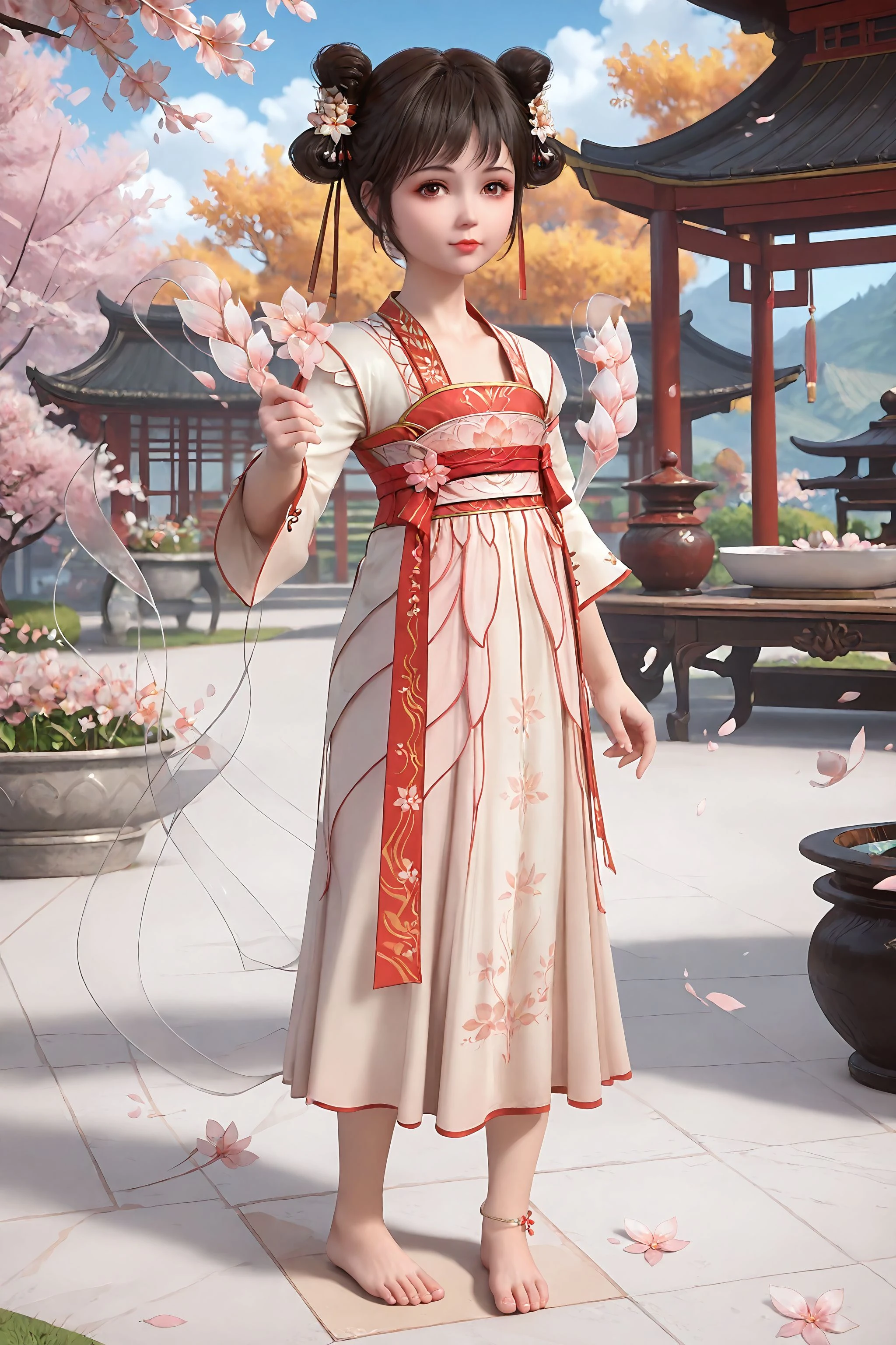 1girl, flower, hair ornament, hair flower, hair bun, solo, chinese clothes, black hair, dress, barefoot, anklet