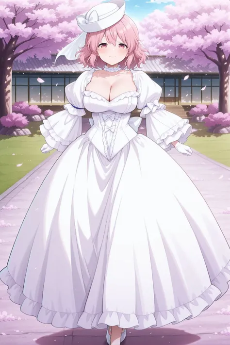 saigyouji yuyuko, 1girl, solo, pink eyes, pink hair, short hair, large breasts, saigyouji yuyuko \(boundary of time\), alternate costume, blue hat, triangular headpiece, purple scarf, blue kimono, frilled kimono, long sleeves, frilled sleeves, wide sleeves, butterfly print, floral print, purple ribbon, platform sandals, okobo, saigyouji yuyuko, 1girl, solo, pink eyes, pink hair, short hair, large breasts, saigyouji yuyuko \(scarlet\), alternate costume, alternate headwear color, purple hat, mob cap, triangular headpiece, neck ribbon, collarbone, purple dress, purple skirt, butterfly print, double-breasted, wide sleeves, white socks, black sandals, holding lantern,saigyouji yuyuko, 1girl, solo, pink eyes, pink hair, short hair, large breasts, saigyouji yuyuko \(ghost girl in the netherworld tower\), alternate costume, alternate headwear color, aqua hat, triangular headpiece, mob cap, aqua kimono, cherry blossom print, floral print, frilled kimono, long sleeves, sleeve garter, sash, blue ribbon, white socks, black shoes,saigyouji yuyuko, 1girl, solo, pink eyes, pink hair, short hair, large breasts, saigyouji yuyuko \(national peace ghost\), alternate costume, hair ornament, kanzashi, veil, butterfly hair ornament, japanese clothes, blue kimono, furisode, blue obi, floral print, print kimono, long sleeves, wide sleeves, new year, see-through clothes, okobo,saigyouji yuyuko, 1girl, solo, pink eyes, pink hair, short hair, large breasts, saigyouji yuyuko \(white snow and white cherry blossoms\), alternate costume, alternate headwear, white hat, sailor hat, hat bow, white bow, frilled choker, cleavage, collarbone, wedding dress, white dress, frilled dress, puffy short sleeves, wide sleeves, white gloves, white gloves, white shoes, saigyouji yuyuko, 1girl, solo, pink eyes, pink hair, short hair, large breasts, saigyouji yuyuko \(bunny ghost hoping for resurrection\), alternate costume, animal ear hairband, rabbit ears, triangular headpiece, purple bowtie, purple cape, frilled cape, japanese clothes, blue kimono, long sleeves, wide sleeves, blue hakama, hip vent, purple bow, black shoes, sheath, holding sword,saigyouji yuyuko, 1girl, solo, pink eyes, pink hair, short hair, large breasts, saigyouji yuyuko \(seamless swimsuit ghost\), alternate costume, alternate headwear, white hat, straw hat, hat bow, white bow, bikini under clothes, swimsuit, white bikini, white dress, see-through dress, short sleeves, cleavage, bracelet, necklace, white sandals, coconut cup, green bag,Optional :