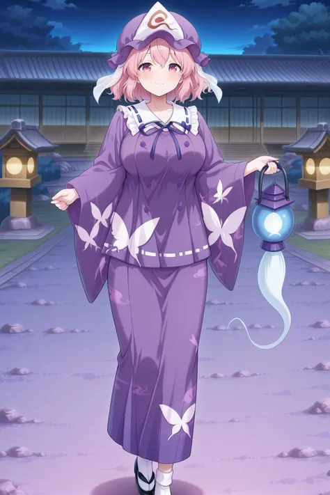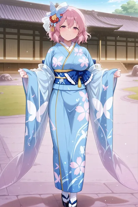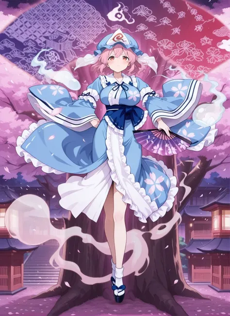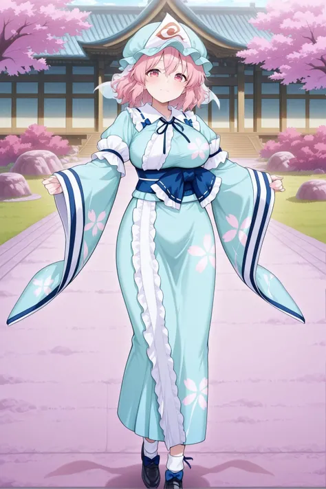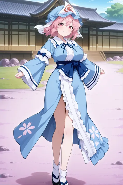 saigyouji yuyuko, 1girl, solo, pink eyes, pink hair, short hair, large breasts,blue hat, mob cap, triangular headpiece, blue neck ribbon, blue kimono, frilled kimono, long sleeves, wide sleeves, floral print, blue ribbon, white socks, black sandals, Alternative :