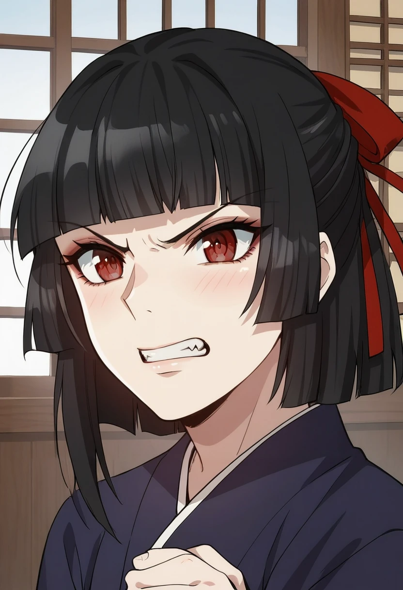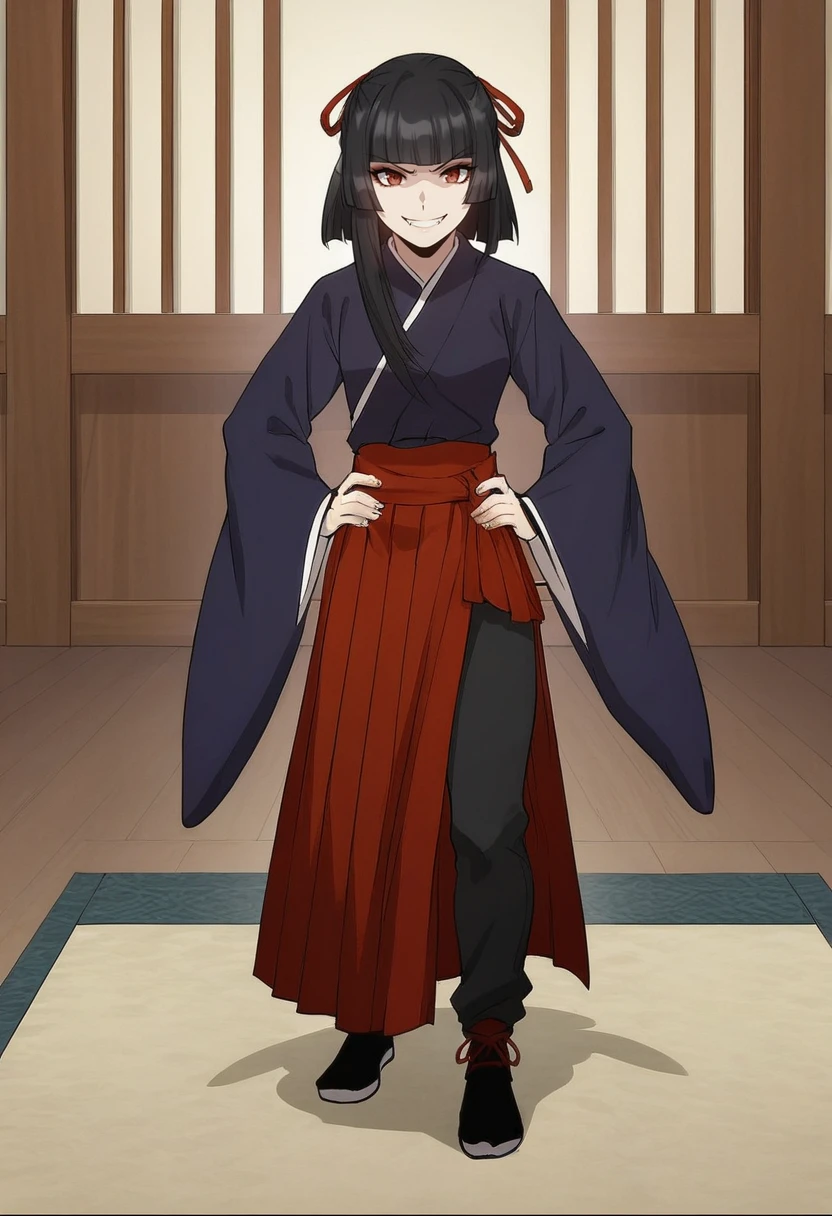 tang-ah, red eyes, black hair, bangs, hair ribbon, Japanese clothes, wide sleeves, red skirt, hakama skirt, side slit, black pants, pants under skirt,