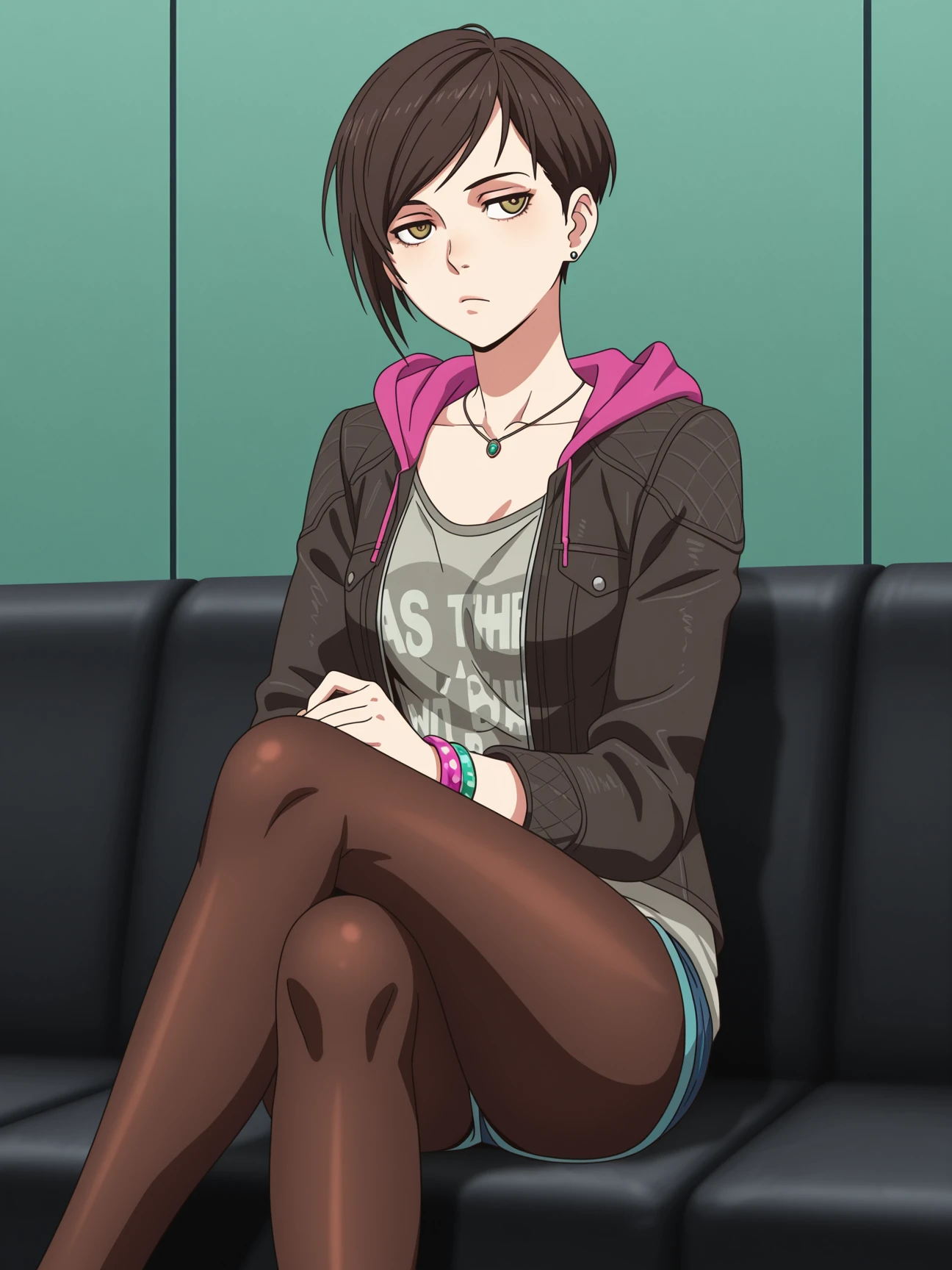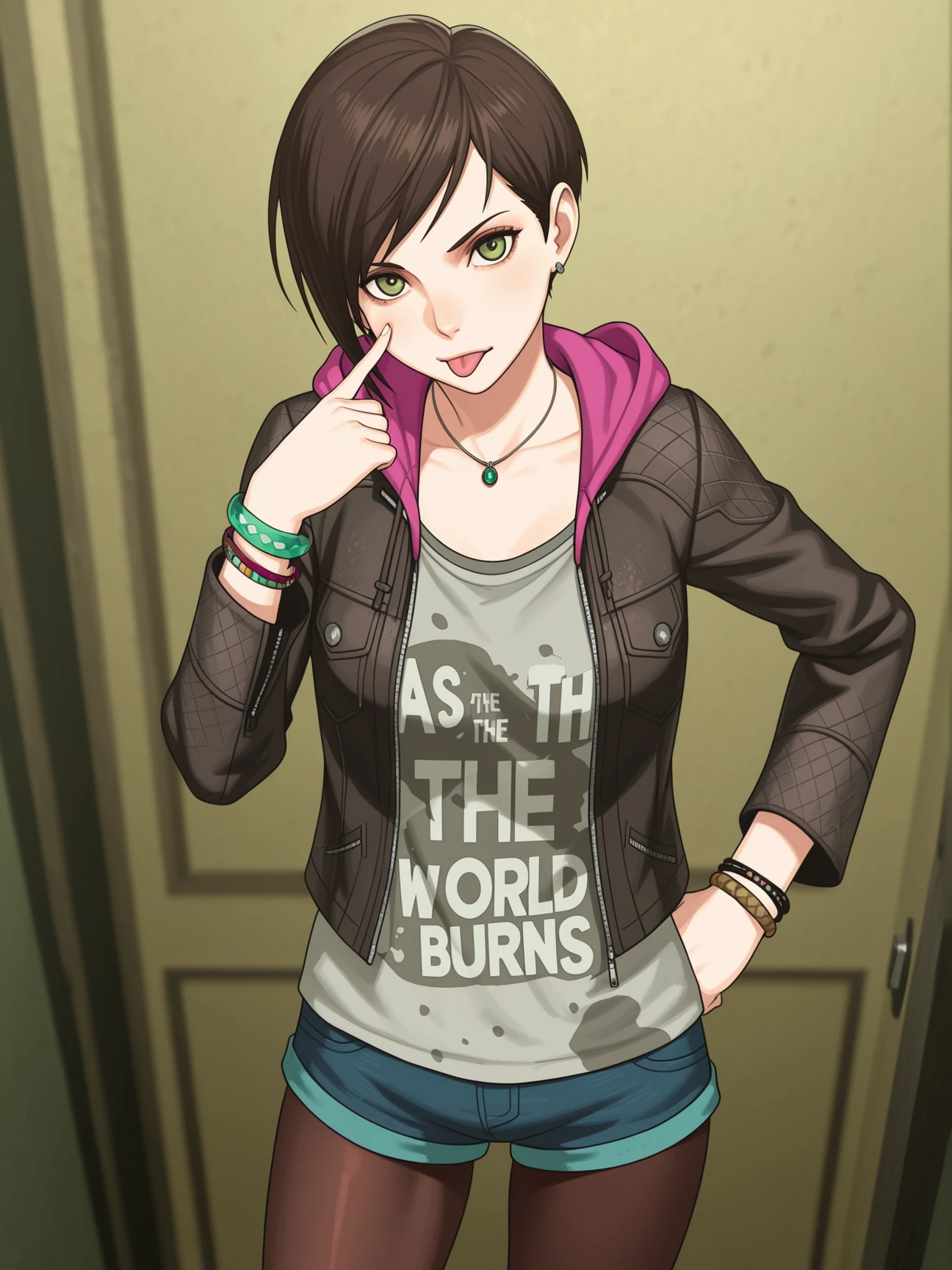 moiraburtonillu, leather jacket, hood, necklace, earrings, open jacket, denim shorts, grey shirt, pantyhose, bracelet, boots