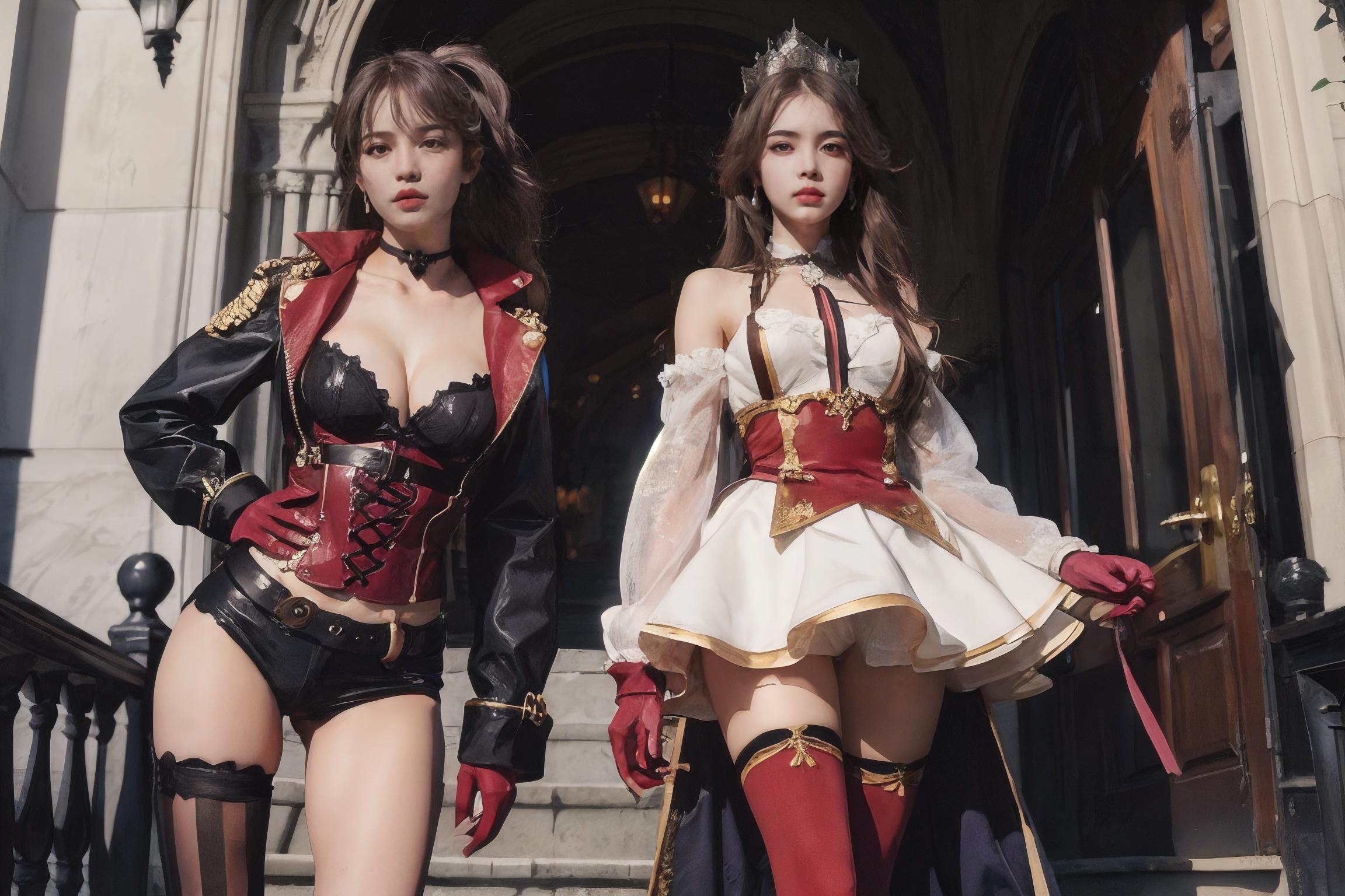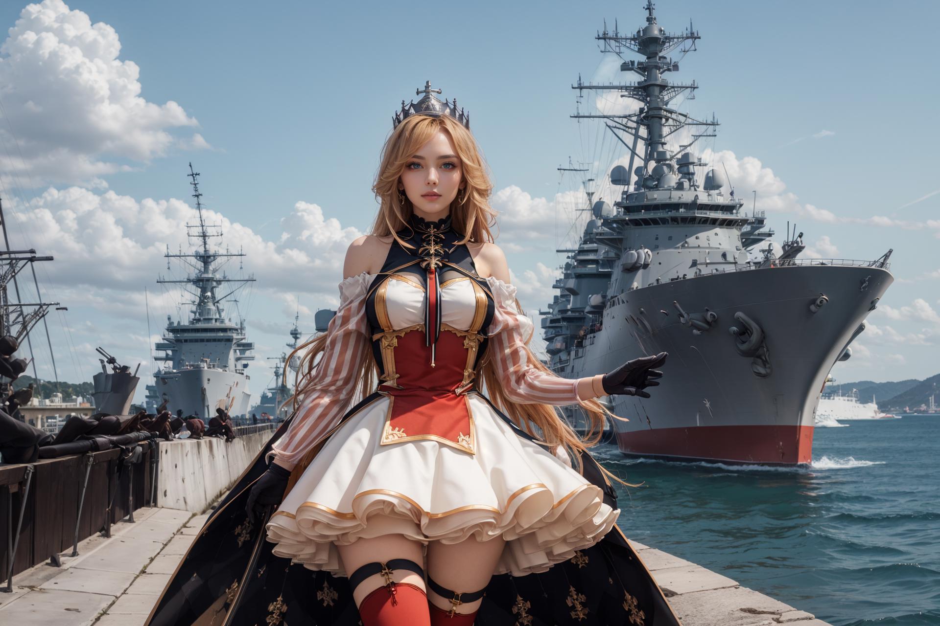 RichelieuDefault, black_gloves,crown, half_gloves, maltese_cross, off-shoulder_dress, puffy_detached_sleeves,red_thighhighs, striped_sleeves, very_long_hair, white_dress, zettai_ryouiki, short_dress, multicolored_dress, red_dress, Fleuron of the Waves/潮風のフルーロン/潮风的Fleuron/Swimsuit skin: