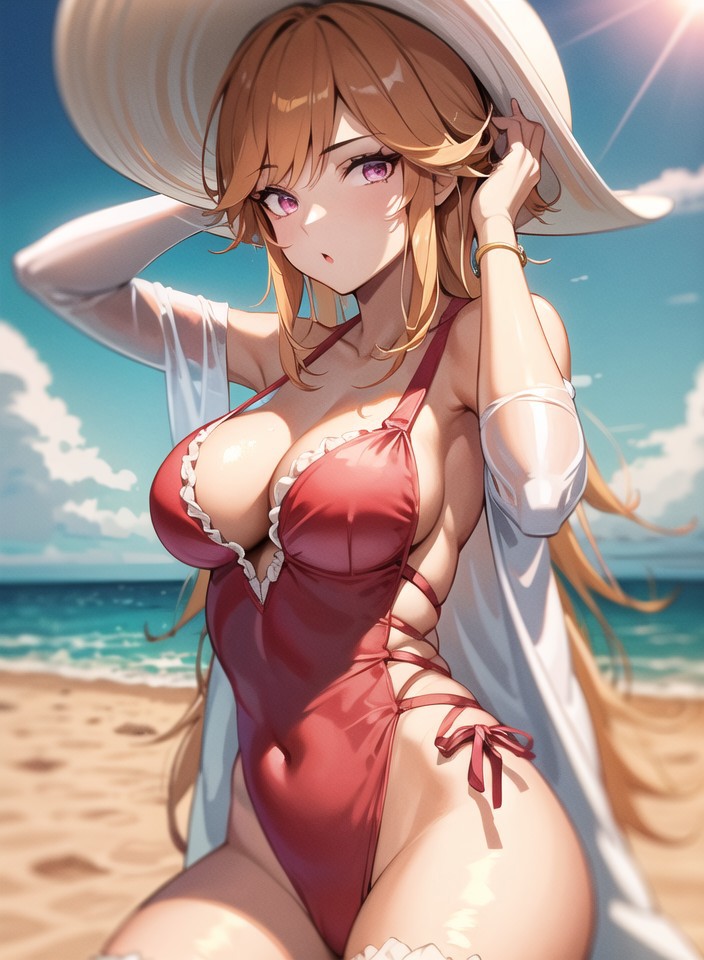 RichelieuSwimsuit, casual_one-piece_swimsuit, cross-laced_swimsuit, frilled_one-piece_swimsuit, highleg_swimsuit, long_sleeves,pink_one-piece_swimsuit, sun_hat, very_long_hair, white_headwear,side-tie_swimsuit, large_hatEvergreen Prophecy/常緑Rêve prophétique/Kimono skin: